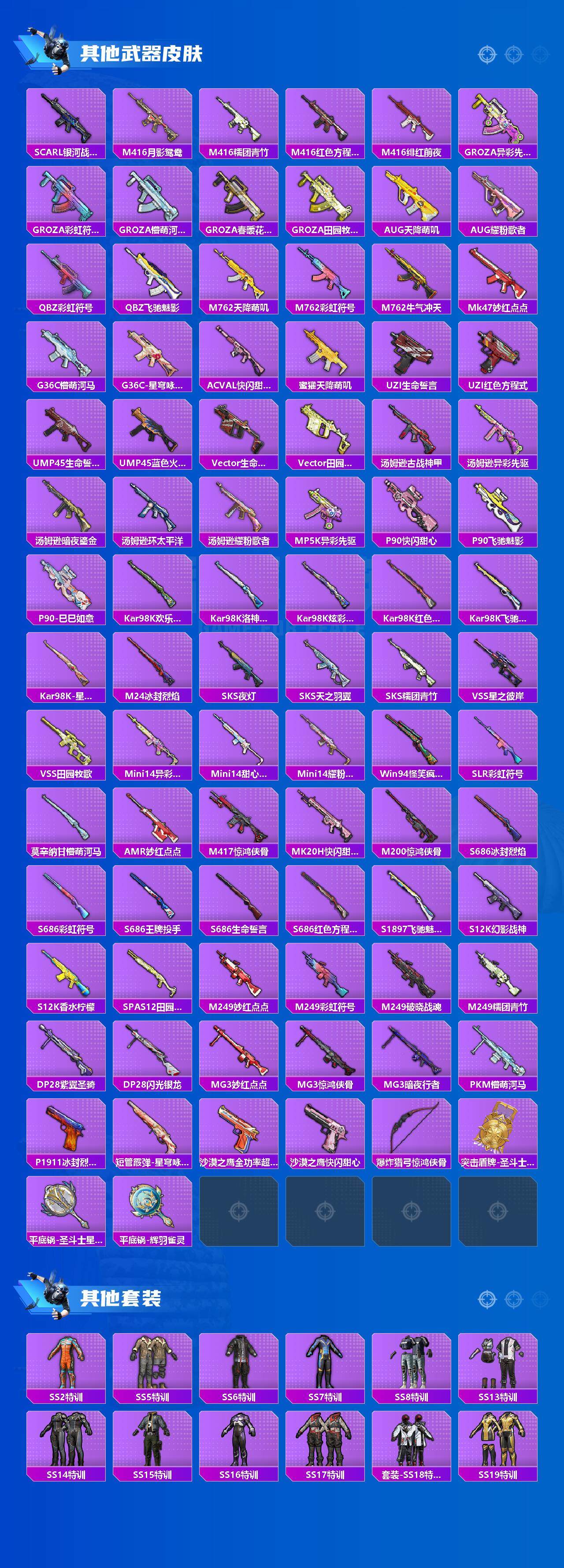 【稀有枪皮】:AKM-彩虹符号,AKM-灼热熔岩,AKM-环太平洋,AKM-生命誓言,AKM-破晓战魂,AKM-萌趣颜团子,AKM-霓虹街区,M16A4-生命誓言,M16A4-莲影清波,SCAR-L-凝视深渊,SCAR-L-玉兔迎春,SCAR-L-生命誓言,SCAR-L-银河战甲,M416-月影鸳鸯,M416-糯团青竹,M416-红色方程式,M416-绯红前夜,GROZA-异彩先驱,GROZA-彩虹符号,GROZA-懵萌河马,GROZA-春暖花