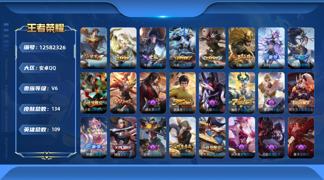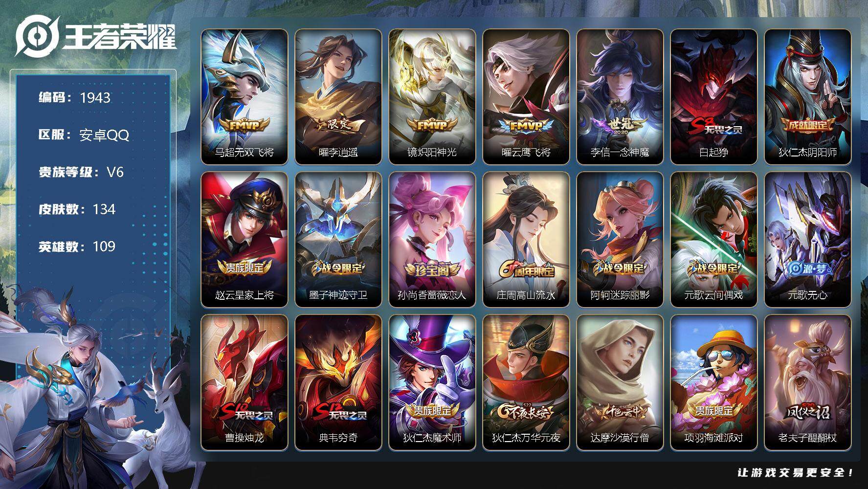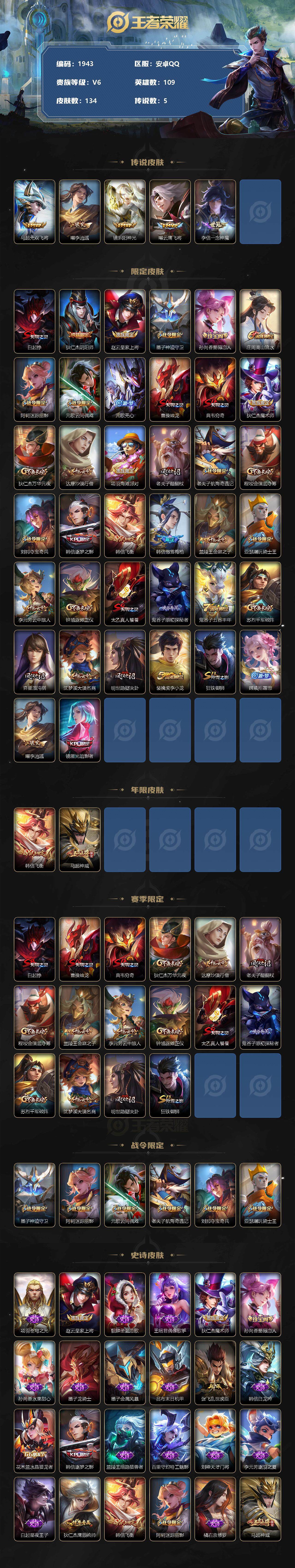 [12582326]安卓Q-V4-尊贵铂金II段位-109英雄-134皮肤-0典藏-0珍品无双-0无双-0珍品传说-5传说-35史诗