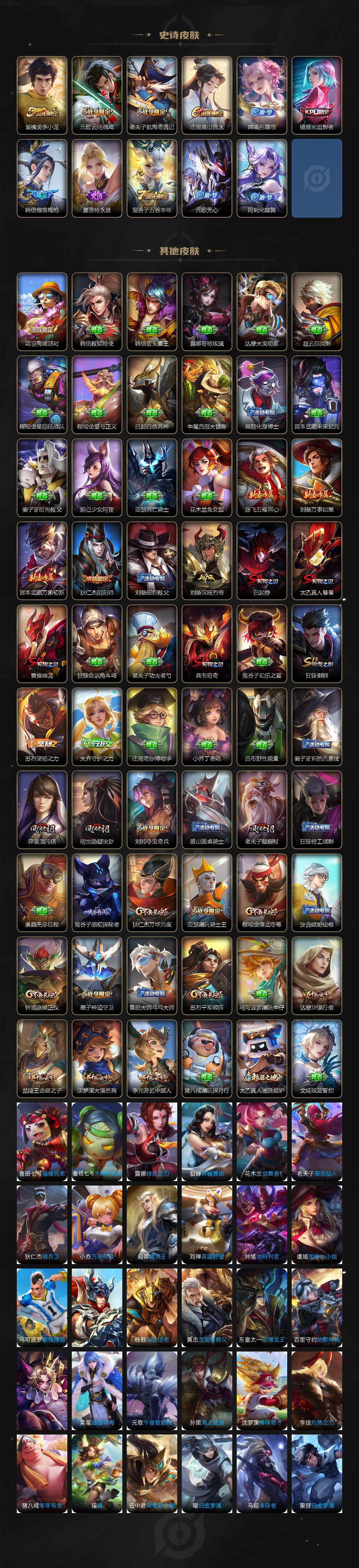 【史诗皮肤】:项羽苍穹之光,赵云皇家上将,貂蝉圣诞恋歌,王昭君偶像歌手,狄仁杰魔术师,孙尚香蔷薇恋人,孙尚香水果甜心,墨子龙骑士,墨子金属风暴,吕布末日机甲,张飞乱世虎臣,韩信白龙吟,花木兰水晶猎龙者,韩信逐梦之影,兰陵王暗隐猎兽者,百里守约特工魅影,刘禅天才门将,李元芳逐浪之夏,白起星夜王子,狄仁杰鹰眼统帅,韩信飞衡,阿轲迷踪丽影,橘右京修罗,马超神威,裴擒虎李小龙,元歌云间偶戏,老夫子航海奇遇记,庄周高山流水,嫦娥拒霜思,镜匿光追影者,韩信傲雪梅枪,夏洛特永昼,鬼谷子五谷丰年,元歌无心,阿轲化蝶舞