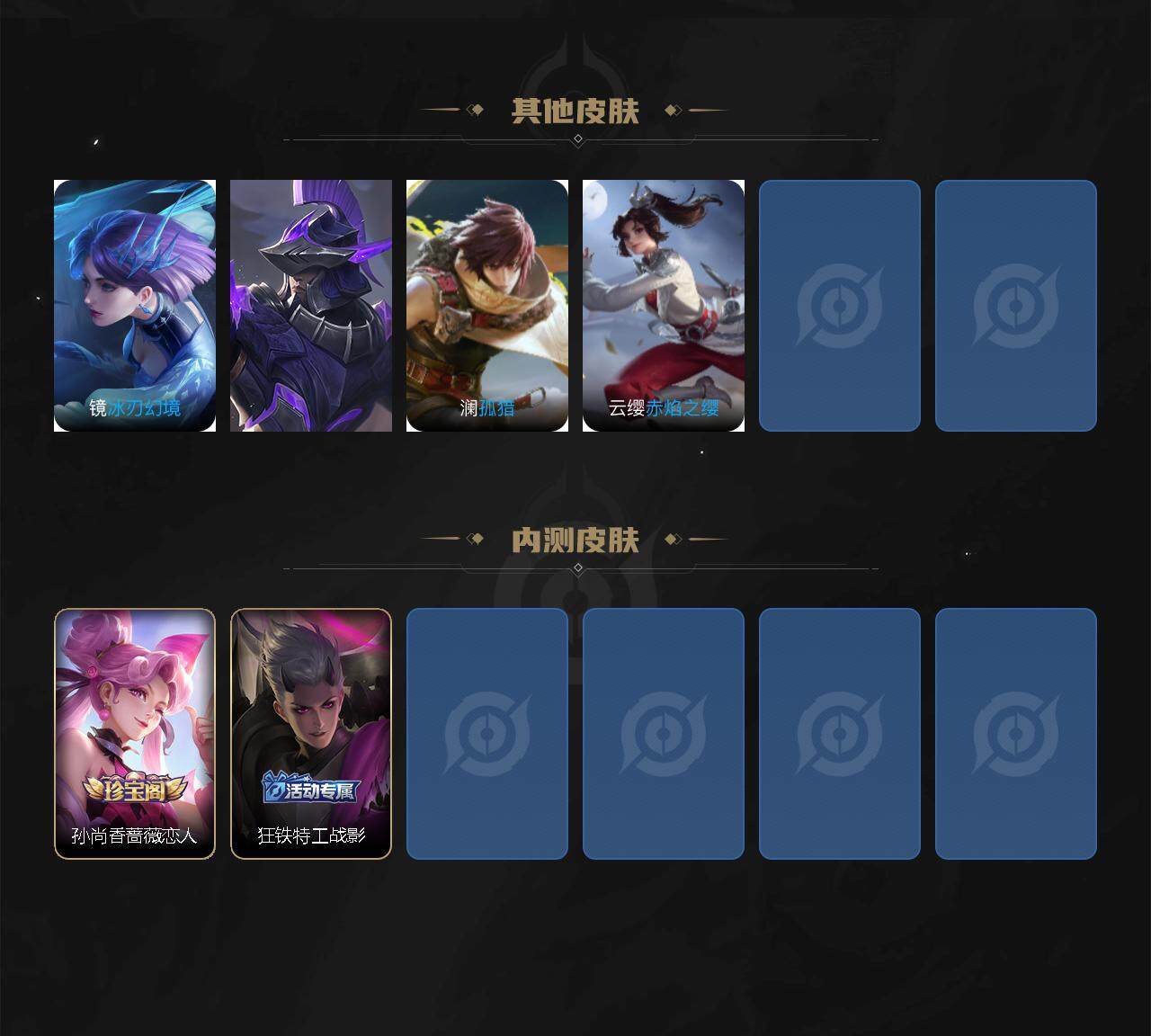 【其他皮肤】:项羽海滩派对,韩信教廷特使,韩信街头霸王,露娜哥特玫瑰,达摩大发明家,赵云忍炎影,程咬金星际陆战队,程咬金爱与正义,白起白色死神,牛魔西部大镖客,扁鹊化身博士,宫本武藏未来纪元,姜子牙时尚教父,妲己少女阿狸,亚瑟死亡骑士,花木兰兔女郎,张飞五福同心,刘备万事如意,宫本武藏万象初新,狄仁杰阴阳师,刘备纽约教父,刘备汉昭烈帝,白起狰,太乙真人饕餮,曹操烛龙,狂铁命
