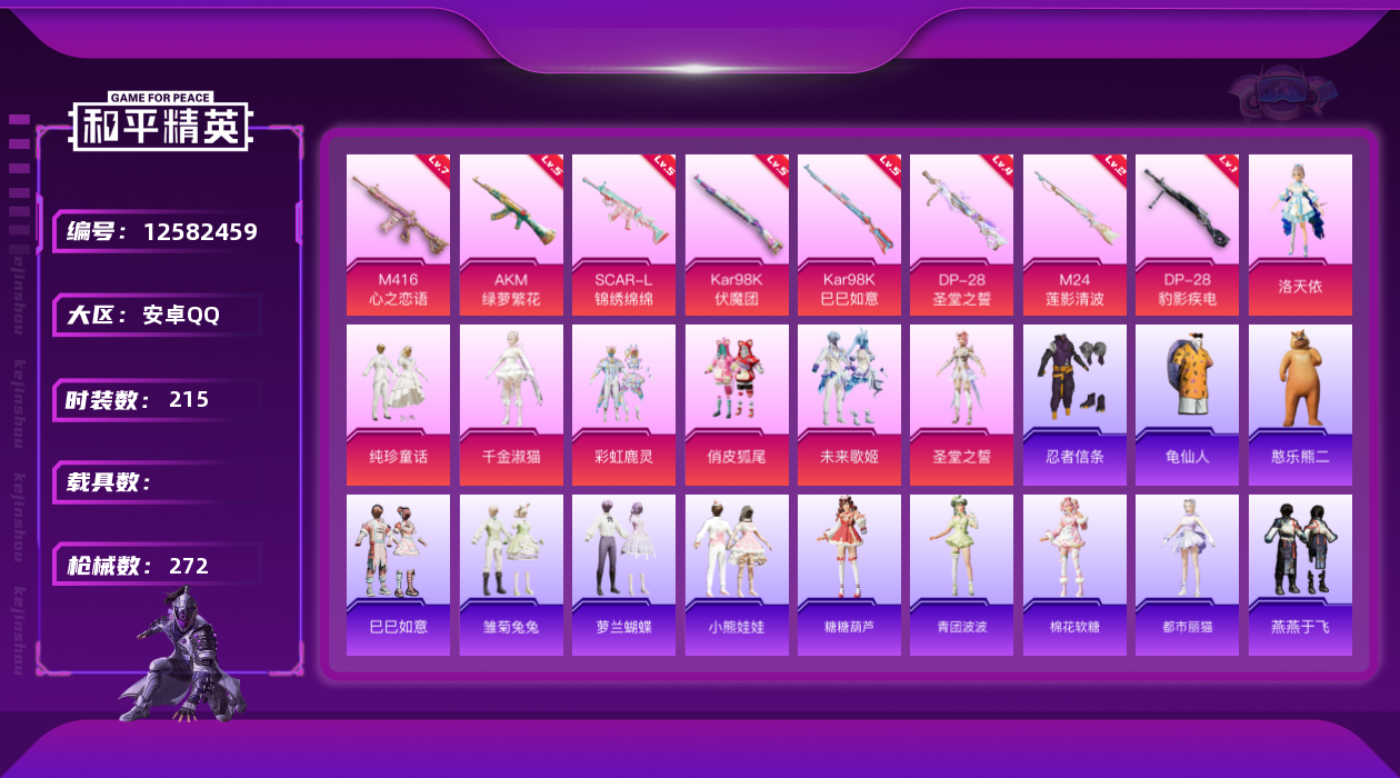 [12582459]安卓 手Q-无敌战神框-7粉装-8特效枪-0载具-3粉色飞行器-88124热力值-16王牌印记-215套装-272枪皮 【热门品类】:套装-派对舞王,套装-忍者信条,套装-龟仙人,小恶魔头饰 【粉色套装】:粉装-俏皮狐尾,粉装-彩虹鹿灵,角色-洛天依,粉装-纯珍童话,粉装-未来歌姬,角色-圣堂之誓,角色-千金淑猫 【粉色枪皮等级】:AKM-绿萝繁花(五级),SCAR-L-锦绣绵绵(五级),M416-心之恋语(七级),Kar98K-伏魔团(五级),Kar98K-巳巳如意(五级),M24-莲影清波(二级),DP-28-圣堂之誓(四级),DP-28-豹影疾电(一级) 【粉色枪皮】:AKM-绿萝繁花,SCAR-L-锦绣绵绵,M416-心之恋语,Kar98K-伏魔团,Kar98K-巳巳如意,M24-莲影清波,DP-28-圣堂之誓,DP-28-豹影疾电 【粉色飞行器】:心之恋语飞行翼 【粉色降落伞】:深海曼妙降落伞,繁花小夜曲降落伞,潮汐统领降落伞,锦绣火鲤降落伞,林间仙鹿降落伞,洛神天依降落伞,梦幻舞会降落伞,未来歌姬降落伞,炫光之旅降落伞,圣堂之誓降落伞,精灵梦叶罗丽降落伞,彩虹独角兽降落伞,樱桃泡泡降落伞 【稀有套装】:套装-龟仙人,玩偶服-憨乐熊二,套装-巳巳如意,套装-雏菊兔兔,套装-萝兰蝴蝶,套装-小熊娃娃,套装-糖糖葫芦,套装-青团波波,套装-棉花软糖,角色-都市丽猫,套装-燕燕于飞,套装-鱼渊荷华,角色-海琴烟,套装-晶灵使者,角色-糖霜甜心,套装-霓虹热舞 【稀有枪皮】:AKM-冰凉西瓜,AKM-夜灯,AKM-彩虹符号,AKM-灼热熔岩,AKM-破晓战魂,AKM-锦绣火鲤,AKM-霓虹街区,AKM-龙的传人,M16A4-夜灯,M16A4-机械英豪,M16A4-红色方程式,M16A4-蓝色火焰,M16A4-千金淑猫,SCAR-L-夜灯,SCAR-L-玉兔迎春,SCAR-L-生命誓言,SCAR-L-红色方程式,SCAR-L-雷霆特警,M416-潮汐统领,M416-糯团青竹,M416-红色方程式,M416-绯红前夜,M416-蓝色火焰,GROZA-彩虹符号,GROZA-懵萌河马,GROZA-治愈之星,GROZA-田园牧歌,AUG-天降萌叽,AUG-幻影战神,AUG-炫光贝贝,AUG-甜蜜菠萝,AUG-耀粉歌者,QBZ-原初圣火,QBZ-未来歌姬,QBZ-洛神天依,