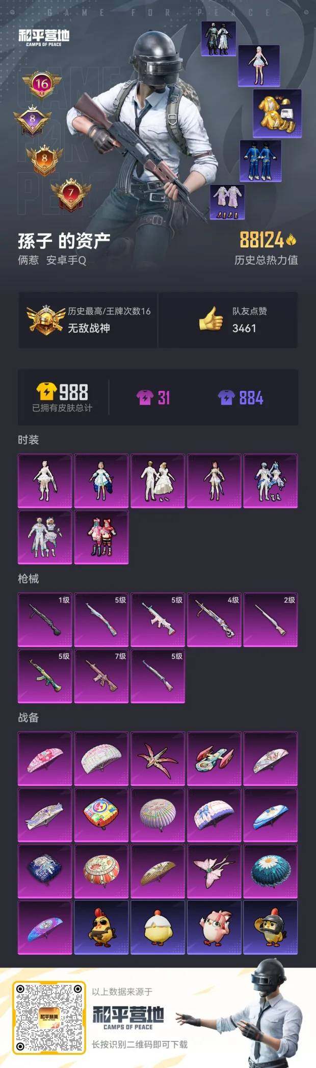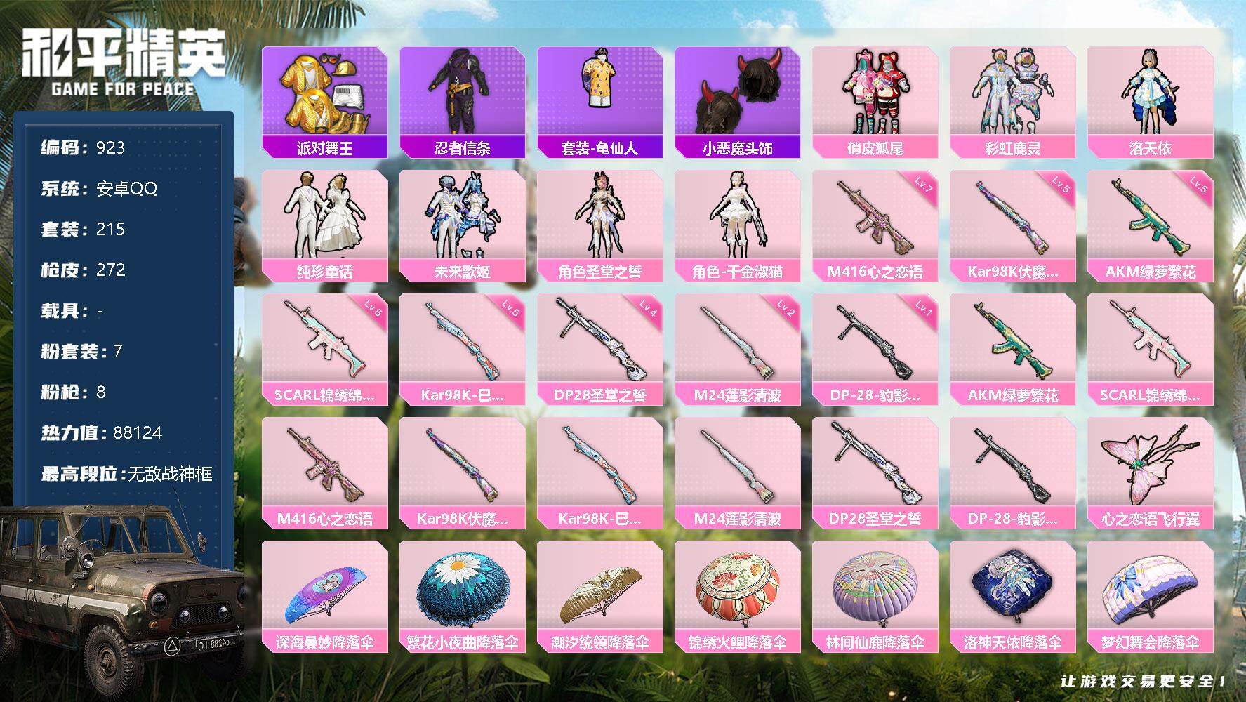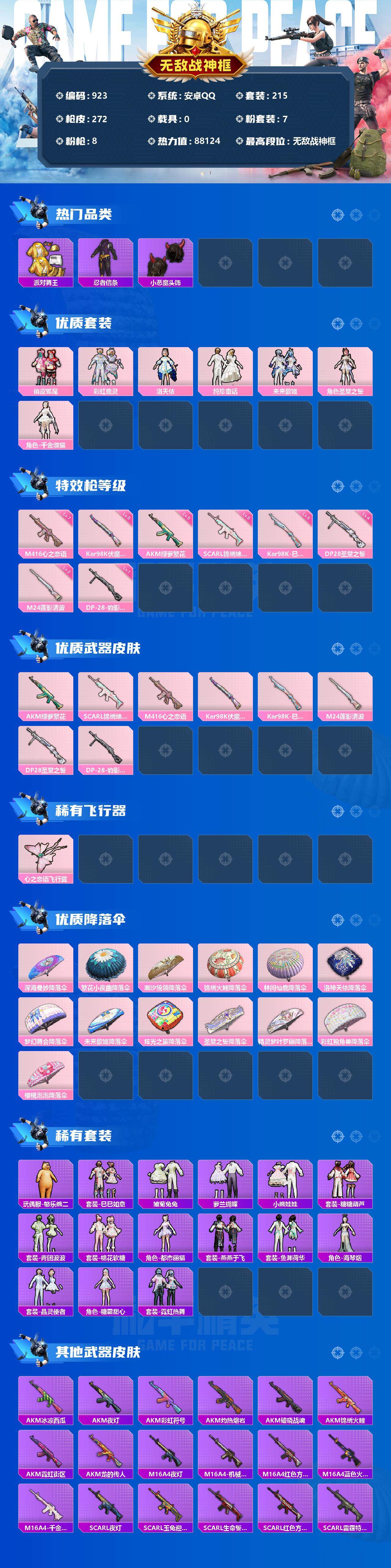 [12582459]安卓 手Q-无敌战神框-7粉装-8特效枪-0载具-3粉色飞行器-88124热力值-16王牌印记-215套装-272枪皮