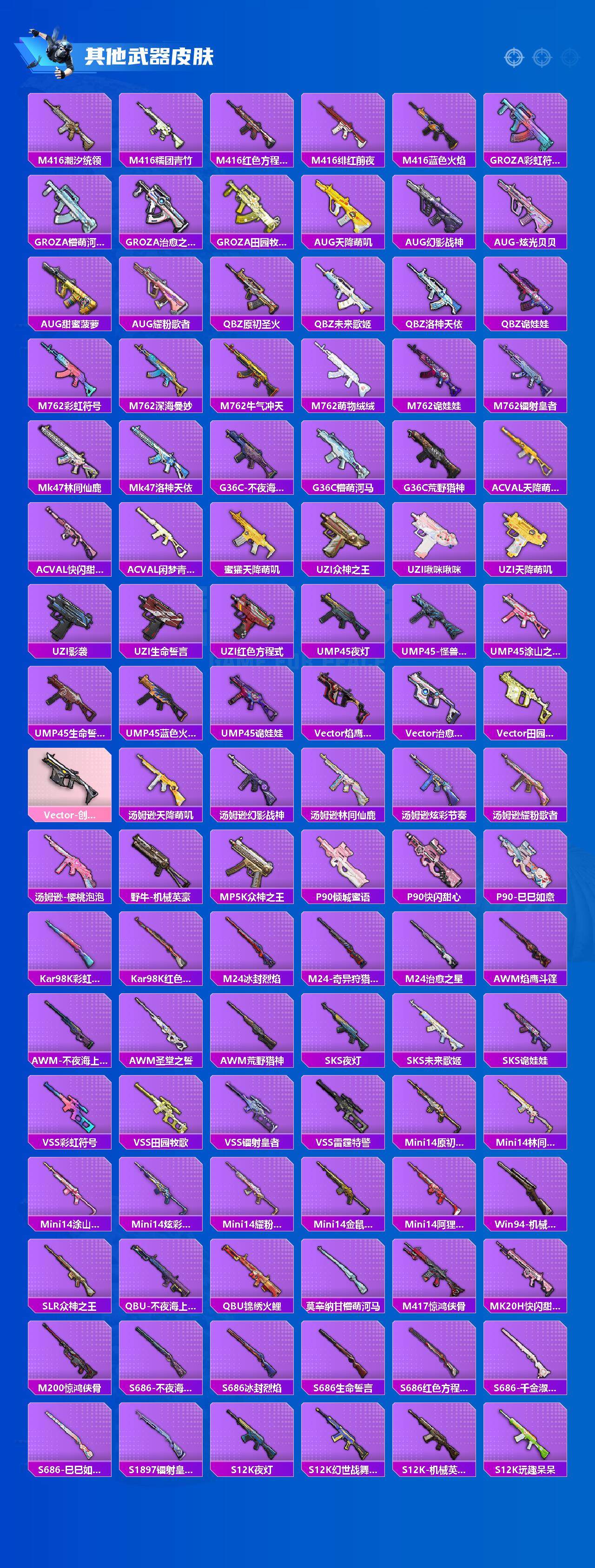 【稀有枪皮】:AKM-冰凉西瓜,AKM-夜灯,AKM-彩虹符号,AKM-灼热熔岩,AKM-破晓战魂,AKM-锦绣火鲤,AKM-霓虹街区,AKM-龙的传人,M16A4-夜灯,M16A4-机械英豪,M16A4-红色方程式,M16A4-蓝色火焰,M16A4-千金淑猫,SCAR-L-夜灯,SCAR-L-玉兔迎春,SCAR-L-生命誓言,SCAR-L-红色方程式,SCAR-L-雷霆特警,M416-潮汐统领,M416-糯团青竹,M416-红色方程式,M416-绯红前夜,M416-蓝色火焰,GROZA-彩虹符号,GROZA-懵萌河马,GROZA-治愈之星,GROZA-田园牧歌,AUG-天降萌叽,AUG-幻影战神,AUG-炫光贝贝,AUG-甜蜜菠萝,AUG-耀粉歌者,QBZ-原初圣火,QBZ-未来歌姬,QBZ-洛神天依,