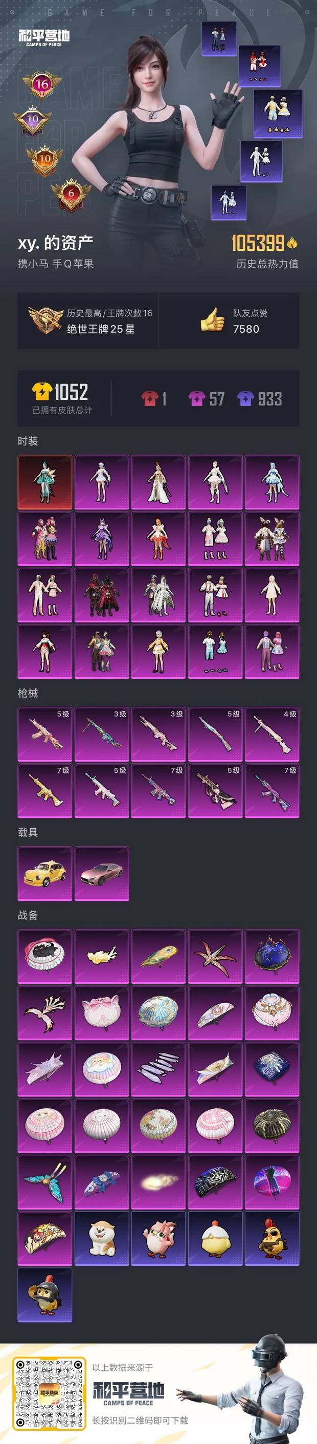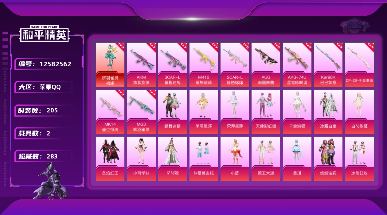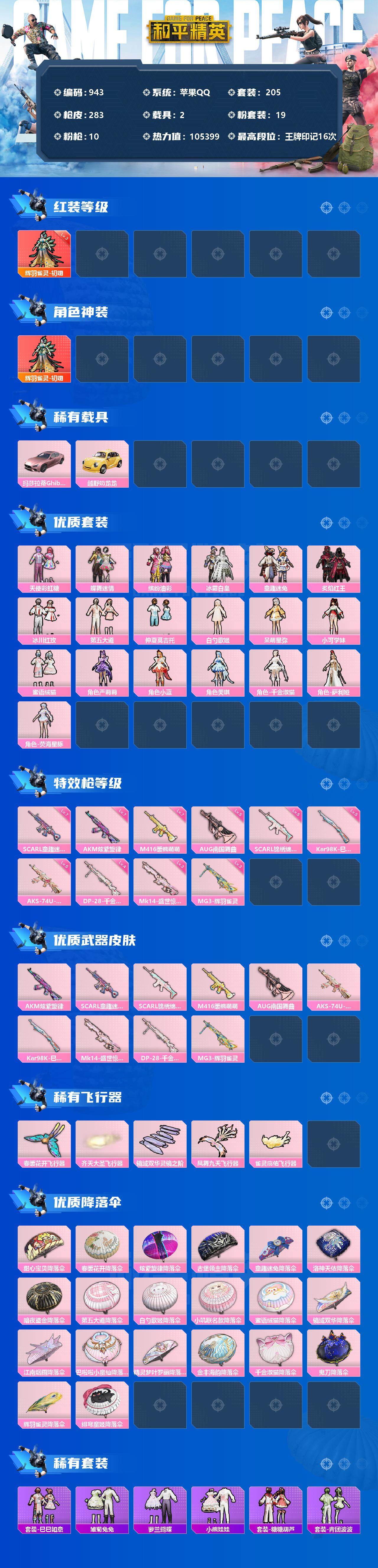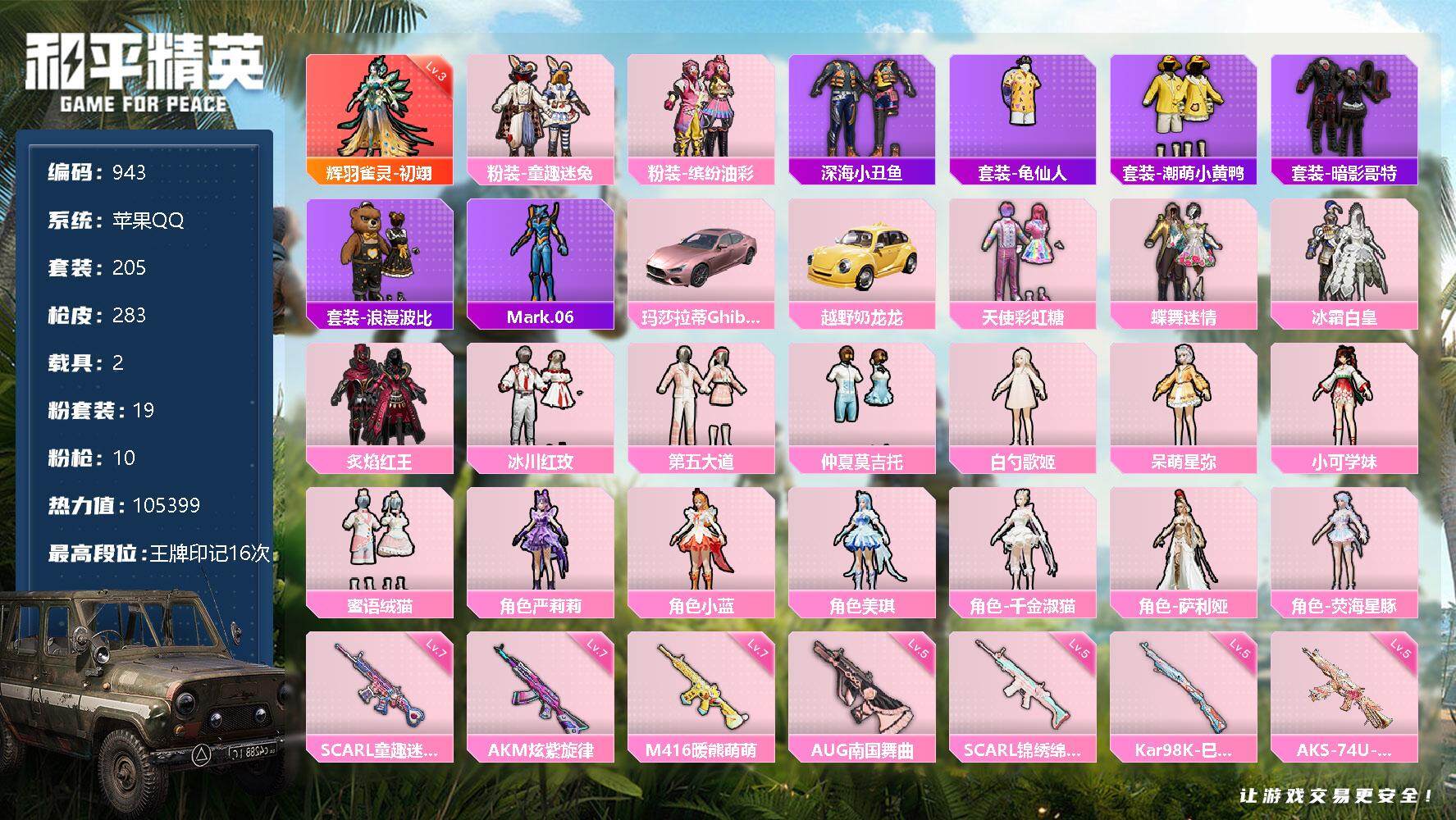 [12582562]苹果 手Q-1神装-19粉装-10特效枪-2载具-6粉色飞行器-105399热力值-16王牌印记-205套装-283枪皮