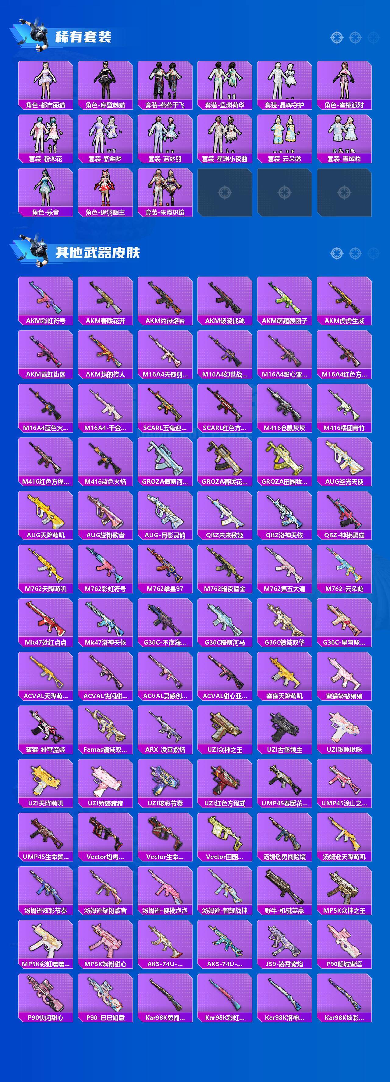 【粉色枪皮】:AKM-炫紫旋律,SCAR-L-童趣迷兔,SCAR-L-锦绣绵绵,M416-暖熊萌萌,AUG-南国舞曲,AKS-74U-星穹咏叹调,Kar98K-巳巳如意,Mk14-盛世惊鸿,DP-28-千金淑猫,MG3-辉羽雀灵