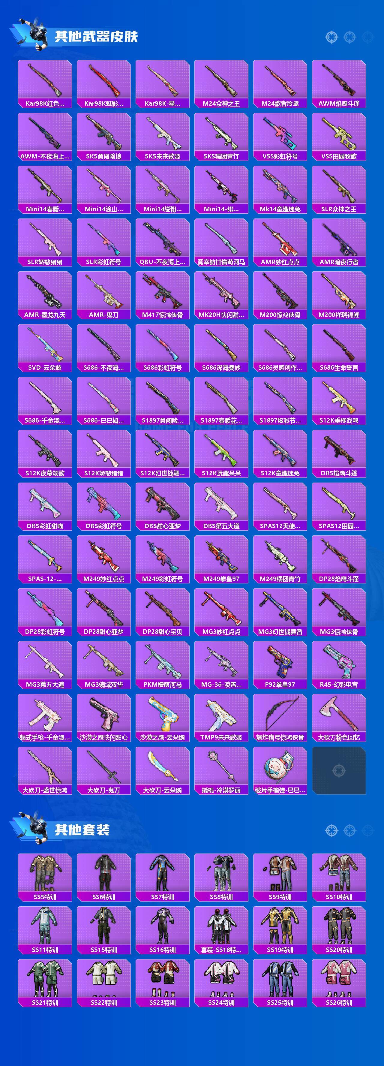 AKM-炫紫旋律,SCAR-L-童趣迷兔,M416-暖熊萌萌,AUG-南国舞曲,Kar98K-巳巳如意,Mk14-盛世惊鸿,DP-28-千金淑猫