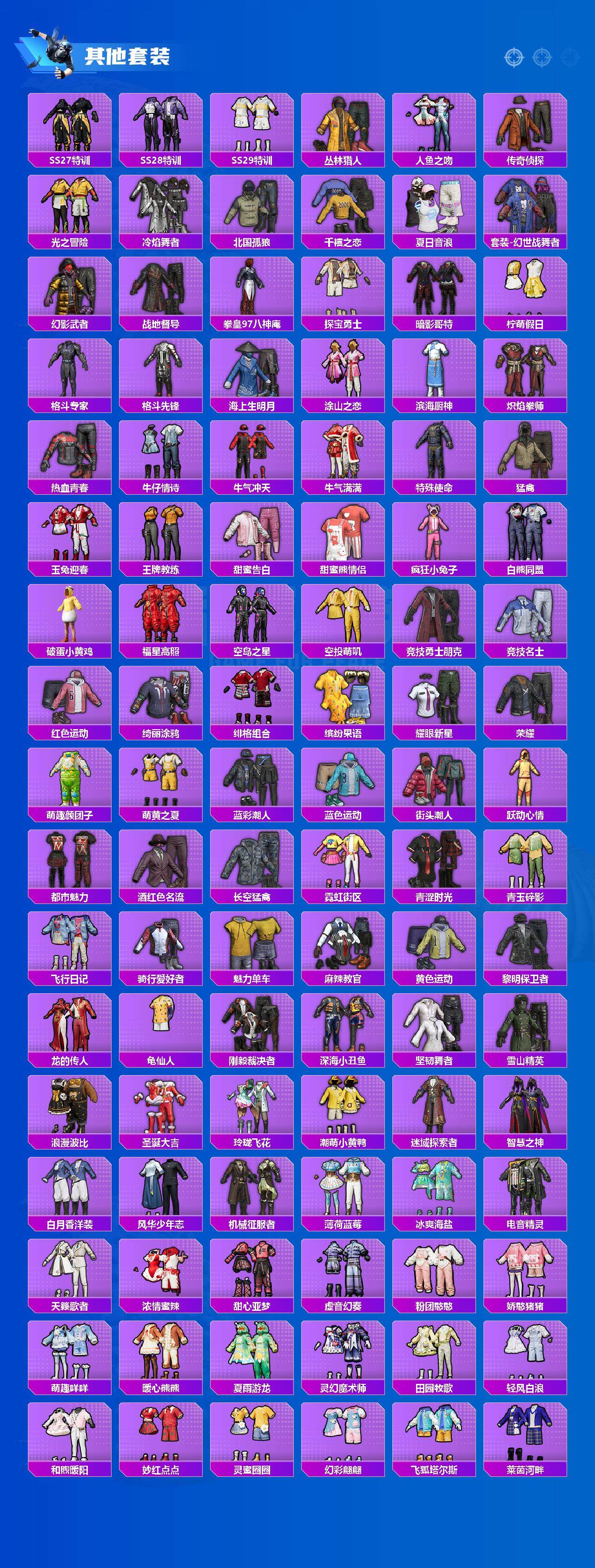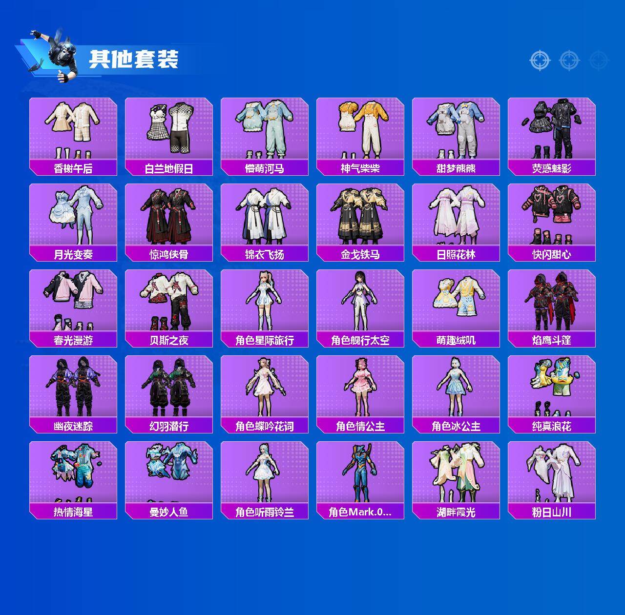 【粉色套装】:粉装-天使彩虹糖,粉装-蝶舞迷情,粉装-缤纷油彩,粉装-冰霜白皇,粉装-童趣迷兔,粉装-炙焰红王,粉装-冰川红玫,粉装-第五大道,粉装-仲夏莫吉托,角色-白勺歌姬,角色-呆萌星弥,角色-小可学妹,粉装-蜜语绒猫,角色-严莉莉,角色-小蓝,角色-美琪,角色-千金淑猫,角色-萨利娅,角色-荧海星豚