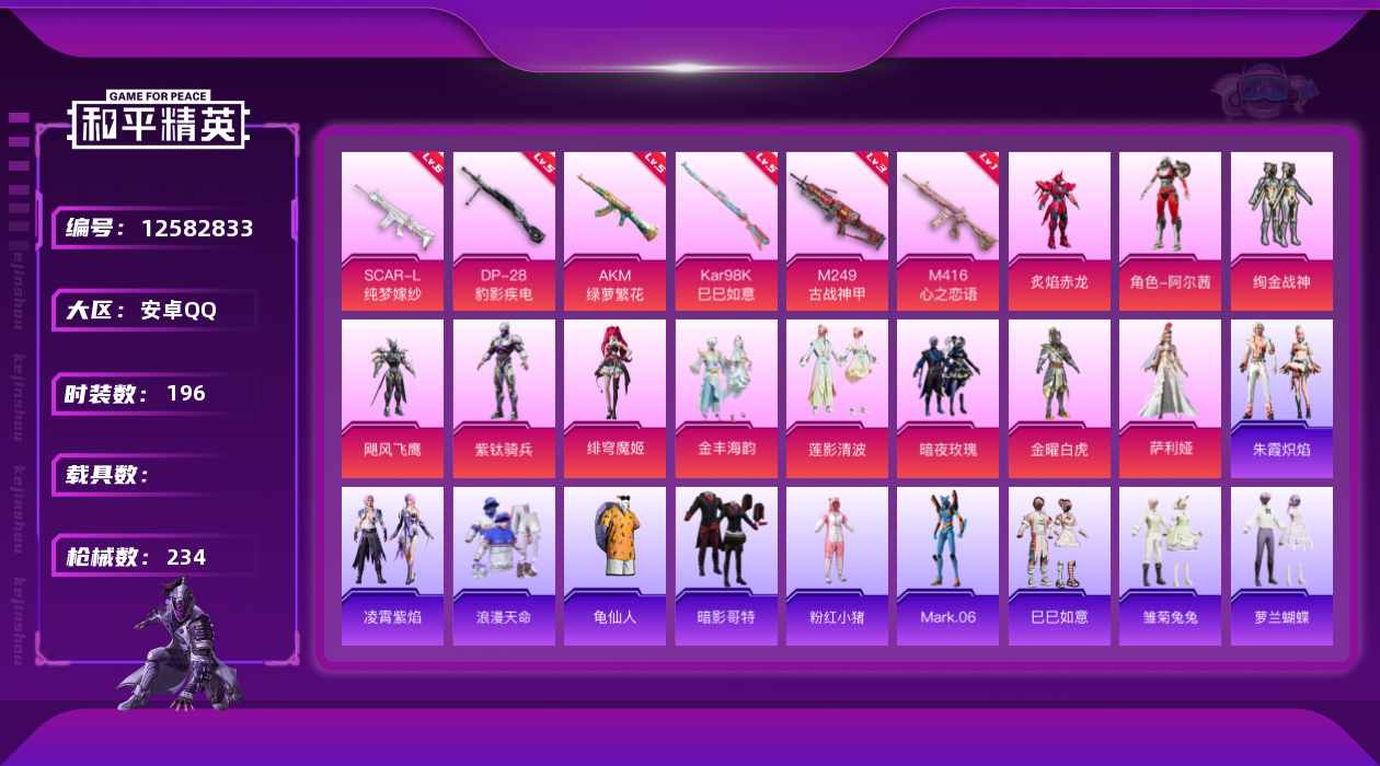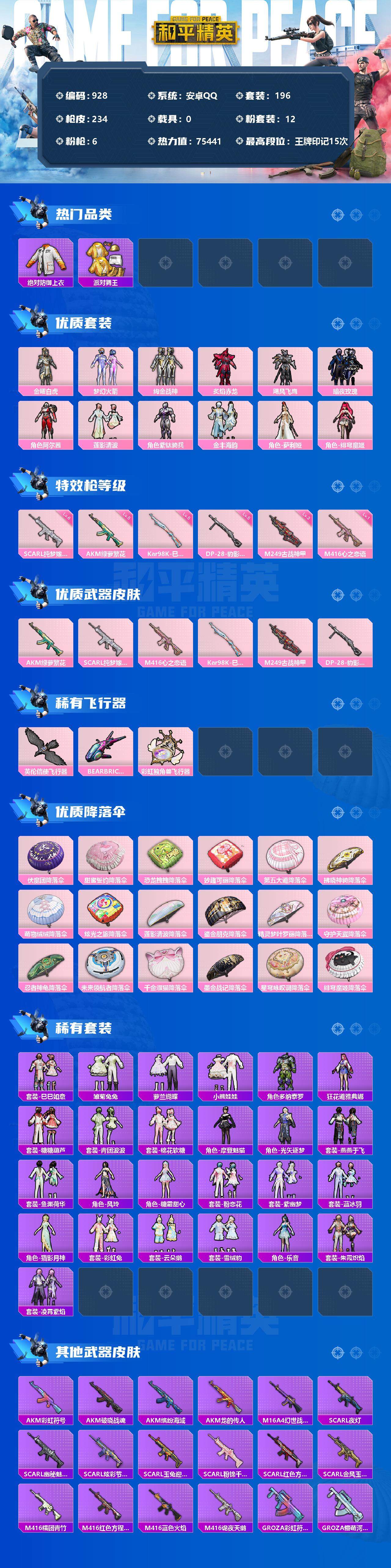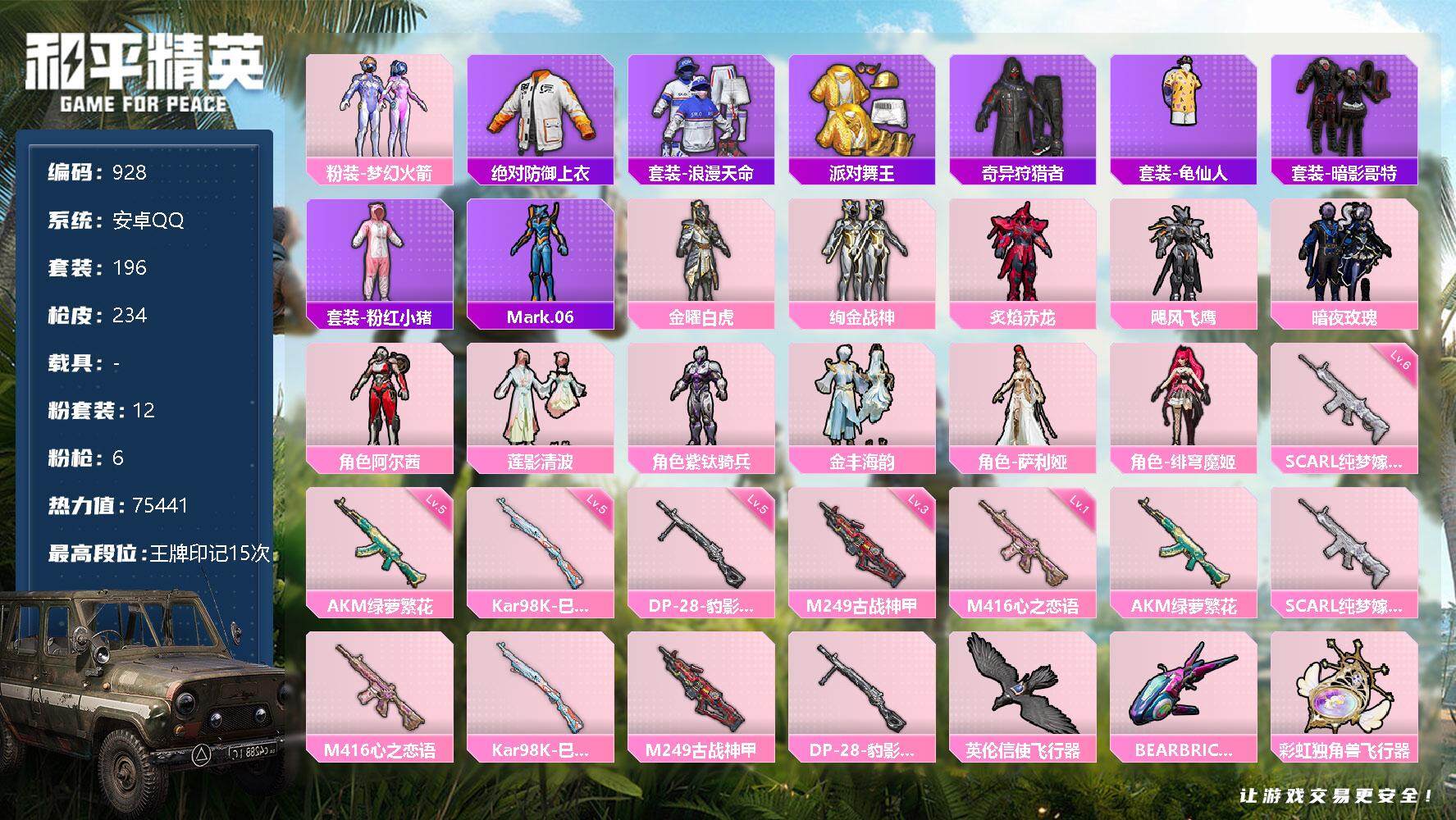 [12582833]安卓 手Q-12粉装-6特效枪-0载具-3粉色飞行器-75441热力值-15王牌印记-196套装-234枪皮 【热门品类】:粉装-梦幻火箭,绝对防御上衣,套装-浪漫天命,套装-派对舞王,套装-奇异狩猎者,套装-龟仙人,套装-暗影哥特,套装-粉红小猪,角色-Mark.06 【粉色套装】:粉装-金曜白虎,粉装-梦幻火箭,粉装-绚金战神,粉装-炙焰赤龙,粉装-飓风飞鹰,粉装-暗夜玫瑰,角色-阿尔茜,粉装-莲影清波,角色-紫钛骑兵,粉装-金丰海韵,角色-萨利娅,角色-绯穹魔姬 【粉色枪皮等级】:AKM-绿萝繁花(五级),SCAR-L-纯梦嫁纱(六级),M416-心之恋语(一级),Kar98K-巳巳如意(五级),M249-古战神甲(三级),DP-28-豹影疾电(五级) 【粉色枪皮】:AKM-绿萝繁花,SCAR-L-纯梦嫁纱,M416-心之恋语,Kar98K-巳巳如意,M249-古战神甲,DP-28-豹影疾电 【粉色飞行器】:英伦信使飞行器,BEARBRICK飞行器,彩虹独角兽飞行器 【粉色降落伞】:伏魔团降落伞,甜蜜誓约降落伞,恐龙拽拽降落伞,妙趣可丽降落伞,第五大道降落伞,拂晓神骑降落伞,萌物绒绒降落伞,炫光之旅降落伞,莲影清波降落伞,鎏金朋克降落伞,精灵梦叶罗丽降落伞,守护天翼降落伞,忍者神龟降落伞,未来领航者降落伞,千金淑猫降落伞,墨金战记降落伞,星穹咏叹调降落伞,绯穹魔姬降落伞 【稀有套装】:套装-龟仙人,套装-巳巳如意,套装-雏菊兔兔,套装-萝兰蝴蝶,套装-小熊娃娃,角色-多纳泰罗,角色-狂花道·雅典娜,套装-糖糖葫芦,套装-青团波波,套装-棉花软糖,角色-摩登魅猫,角色-光矢逐梦,套装-燕燕于飞,套装-鱼渊荷华,角色-风玲,角色-糖霜甜心,套装-粉恋花,套装-紫幽梦,套装-蓝冰羽,角色-猎影月神,套装-彩虹兔,套装-云朵鹅,套装-雪绒豹,角色-乐音,套装-朱霞炽焰,套装-凌霄紫焰 【稀有枪皮】:AKM-彩虹符号,AKM-破晓战魂,AKM-缤纷海域,AKM-龙的传人,M16A4-幻世战舞者,SCAR-L-夜灯,SCAR-L-幽秘魅影,SCAR-L-炫彩节奏,SCAR-L-玉兔迎春,SCAR-L-粉锦千层,SCAR-L-红色方程式,SCAR-L-金风玉露,M416-糯团青竹,M416-红色方程式,M416-蓝色火焰,M416-诡夜天鹅,GROZA-彩虹符号,GROZ