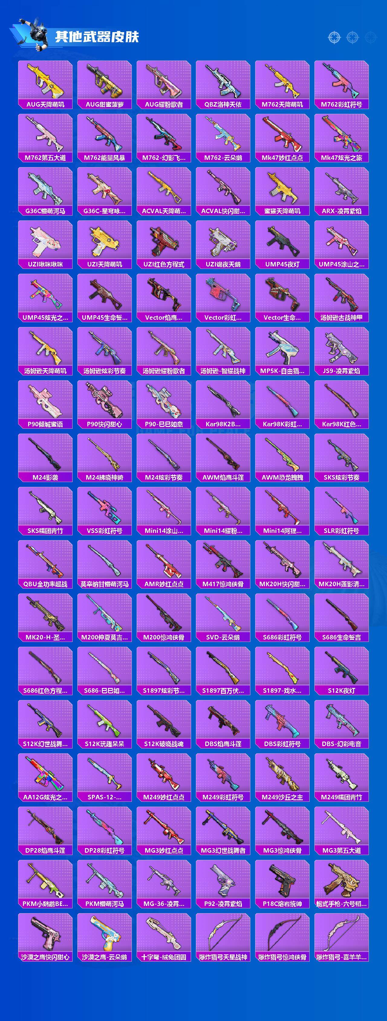【稀有枪皮】:AKM-彩虹符号,AKM-破晓战魂,AKM-缤纷海域,AKM-龙的传人,M16A4-幻世战舞者,SCAR-L-夜灯,SCAR-L-幽秘魅影,SCAR-L-炫彩节奏,SCAR-L-玉兔迎春,SCAR-L-粉锦千层,SCAR-L-红色方程式,SCAR-L-金风玉露,M416-糯团青竹,M416-红色方程式,M416-蓝色火焰,M416-诡夜天鹅,GROZA-彩虹符号,GROZ