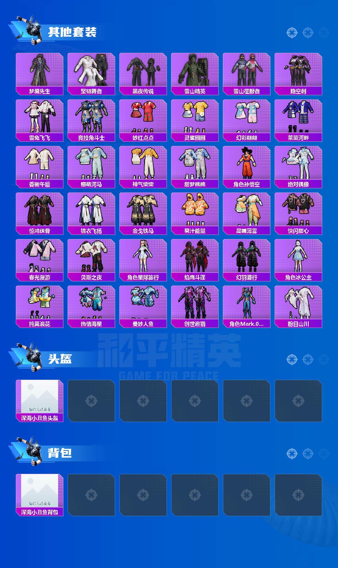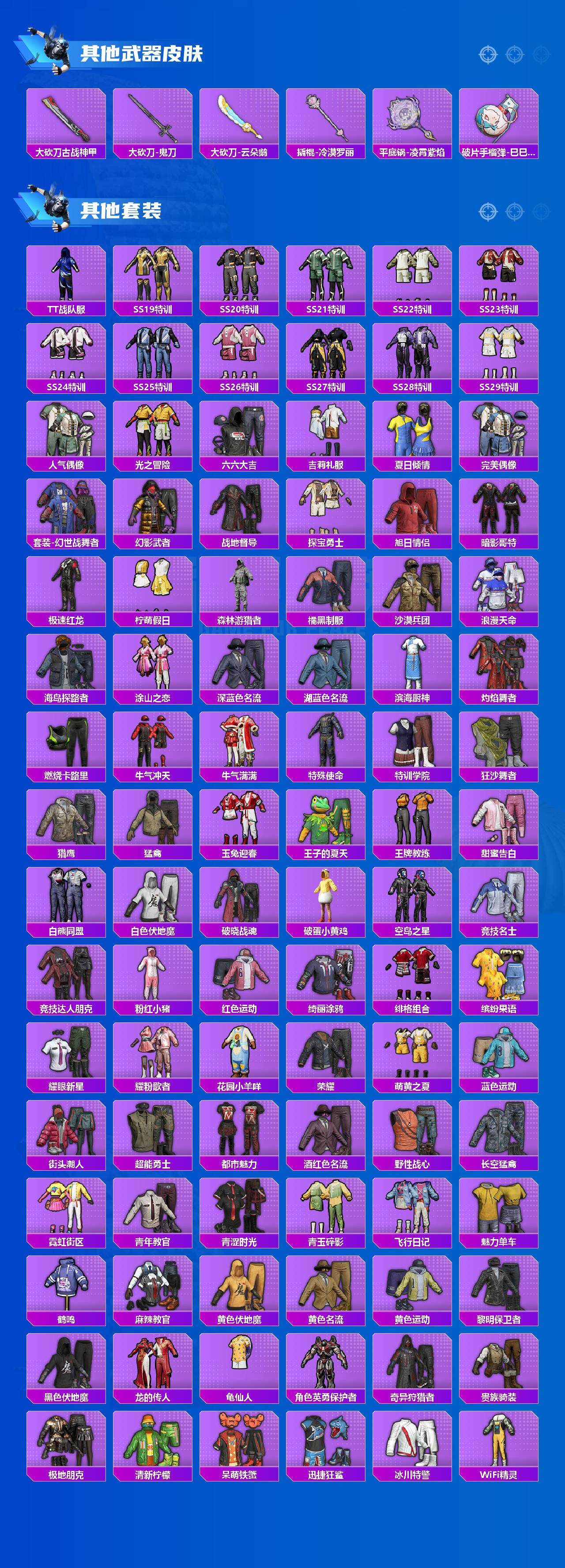 - [10197291]实名: 可修改 时装数: 563 载具数: 7 枪械数: 210 战备数: 136 热门装扮: 奇异狩猎者,梦幻火箭(新101),呆萌铁蟹,宝贝奶油派,浪漫波比,天使彩虹糖,放客神游,鹰眼刺客,缤纷油彩,酷熊伴侣,萌熊伴侣,香水柠檬,绚金战神,极致幻想,冥河战士,沙漠守护者,激萌罗小黑,浪客战士,神秘黑猫,暗夜魅影,狂魅哈莉 载具: 玛莎拉蒂Ghibli(粉),双人摩托-双刃魅影(红),阿斯顿·马丁DBS(绿),阿斯顿·马丁DBX(橙),合金龙骨(绿),特斯拉Roadster(水滴蓝),兰博基尼Aventador SVJ(翡翠绿) 稀有枪皮: M416心之恋语,AKM梦之光华,GROZA焦糖拿铁,SCAR-L青春物语,Kar98K-巳巳如意,AUG-暖羊咩咩,Mk14-爆裂游戏,破片手榴弹-美味星星糖