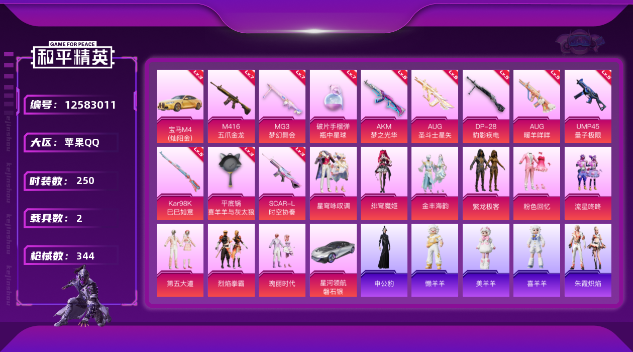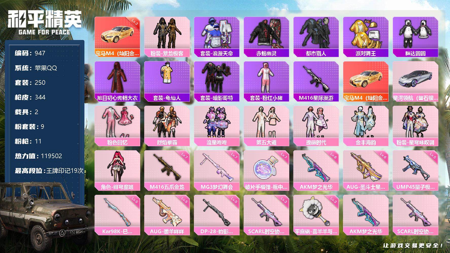 [12583011]苹果 手Q-9粉装-11特效枪-2载具-7粉色飞行器-119502热力值-19王牌印记-250套装-344枪皮