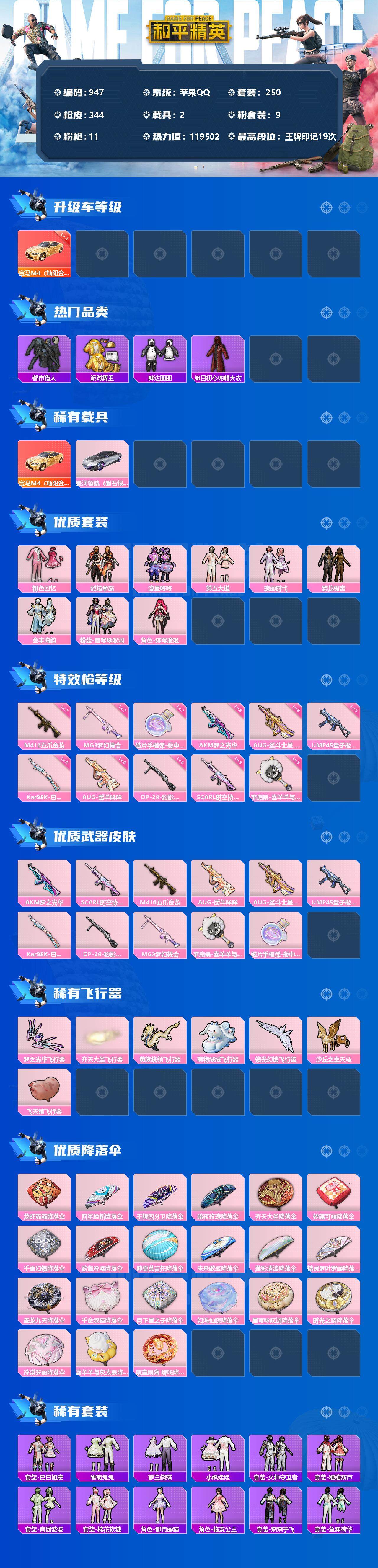 [12583011]苹果 手Q-9粉装-11特效枪-2载具-7粉色飞行器-119502热力值-19王牌印记-250套装-344枪皮 【红色载具】:宝马M4(灿阳金)(三级) 【热门品类】:粉装-繁龙极客,套装-浪漫天命,套装-赤蝎幽灵,套装-都市猎人,套装-派对舞王,套装-胖达圆圆,旭日初心兜帽大衣,套装-龟仙人,套装-暗影哥特,套装-粉红小猪,M416-星际漫游 【粉色载具】:宝马M4(灿阳金),星河领航(磐石银) 【粉色套装】:粉装-粉色回忆,粉装-烈焰拳霸,粉装-流星咚咚,粉装-第五大道,粉装-瑰丽时代,粉装-繁龙极客,粉装-金丰海韵,粉装-星穹咏叹调,角色-绯穹魔姬 【粉色枪皮等级】:AKM-梦之光华(六级),SCAR-L-时空协奏(三级),M416-五爪金龙(七级),AUG-暖羊咩咩(五级),AUG-圣斗士星矢(六级),UMP45-量子极限(五级),Kar98K-巳巳如意(五级),DP-28-豹影疾电(五级),MG3-梦幻舞会(七级),平底锅-喜羊羊与灰太狼(三级),破片手榴弹-瓶中星球(七级) 【粉色枪皮】:AKM-梦之光华,SCAR-L-时空协奏,M416-五爪金龙,AUG-暖羊咩咩,AUG-圣斗士星矢,UMP45-量子极限,Kar98K-巳巳如意,DP-28-豹影疾电,MG3-梦幻舞会,平底锅-喜羊羊与灰太狼,破片手榴弹-瓶中星球 【粉色飞行器】:梦之光华飞行器,齐天大圣飞行器,黄族统领飞行器,萌物绒绒飞行器,镜光幻境飞行翼,沙丘之主天马,飞天猪飞行器 【粉色降落伞】:龙虾霸霸降落伞,四圣焕新降落伞,王牌四分卫降落伞,暗夜玫瑰降落伞,齐天大圣降落伞,妙趣可丽降落伞,千面幻镜降落伞,歌者泠鸢降落伞,仲夏莫吉托降落伞,未来歌姬降落伞,莲影清波降落伞,精灵梦叶罗丽降落伞,墨龙九天降落伞,千金淑猫降落伞,月下星之子降落伞,幻海仙踪降落伞,星穹咏叹调降落伞,时光之吻降落伞,冷漠罗丽降落伞,喜羊羊与灰太狼降落伞,魔童闹海 哪吒降落伞 【稀有套装】:套装-龟仙人,套装-巳巳如意,套装-雏菊兔兔,套装-萝兰蝴蝶,套装-小熊娃娃,套装-火种守卫者,套装-糖糖葫芦,套装-青团波波,套装-棉花软糖,角色-都市丽猫,角色-临安公主,套装-燕燕于飞,套装-鱼渊荷华,套装-新风雅兰,套装-粉恋花,套装-紫幽梦,套装-蓝冰羽,套装-星影赞美诗,套装-星渊小夜曲,套装-彩虹兔,套装-云朵鹅,套装-雪