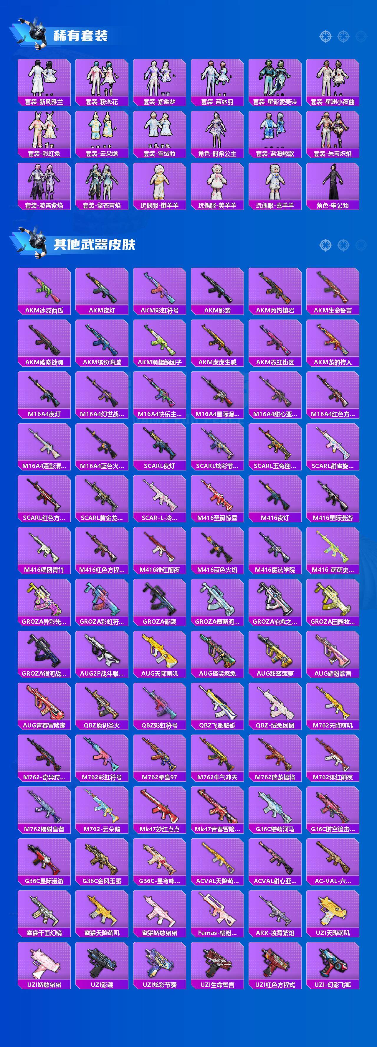 - [12089777]6粉装 2特效枪 1载具 可二次 可修改实名 优质装备:玛莎拉蒂Ghibli(金),M416五爪金龙,奇异狩猎者,蝶舞迷情,幻影战神,宝贝奶油派,银河战甲,木曜青龙,金曜白虎 热门装扮:奇迹天团,胖达团团,狮王雄心,迅捷狂鲨,深海小丑鱼,好奇恐龙,绯红秘境 稀有枪皮:DP-28-豹影疾电 六级特效枪:六级M416-五爪金龙 四级特效枪:四级DP-28-豹影疾电 紫色装扮:SS5特训,伏击者,冷焰舞者,凛冬战士,北国孤狼,SS15特训,SS16特训,银白舞王,SS13特训,SS14特训,SS17特训,SS18特训,酷萌兔限定,金鼠迎春,长空猛禽,雪山征服者,雪山精英,霓虹街区,荣耀,跃动心情,骑行爱好者,魅力单车,黄色伏地魔,黄色名流,黑色伏地魔,格斗先锋,沙漠兵团,圣诞大吉,怒火燎原,战地督导,战地菁英,湖蓝色名流,疯狂小兔子,白色伏地魔,甜蜜告白,福星高照,竞技勇士朋克,潮流先锋,灰色格斗者,熔岩使者,燃烧卡路里,牛气满满,特战装甲,特殊使命,特训学院,镭射皇者,竞技名士,精神漫游,炽焰拳师,格斗专家,SS6特训,核芯基因,拳皇97八神庵,SS7特训,火舞潮人,淡雅花蕊,裁决冥王,浴火魔神,摩艾涂鸦,奇趣章鱼,时之沙漏,SS8特训,粉甜马卡龙,原初圣火,逆风勇士,SS12特训,SS9特训,SS11特训,绯格组合,蓝调潮人,冷酷挑战者,摇滚战魂,绯红秘境,无烬之地,冰原奔狼,忍者信条,WiFi精灵,丛林猎人,传奇侦探,奇趣企鹅,爆竹金鼠 优质战备:幻影战神降落伞,甜心宝贝降落伞,凝视深渊降落伞,至尊龙雀飞行服,至尊龙雀降落伞,银河战甲降落伞,春暖花开降落伞,深海曼妙降落伞,洛神天依降落伞
