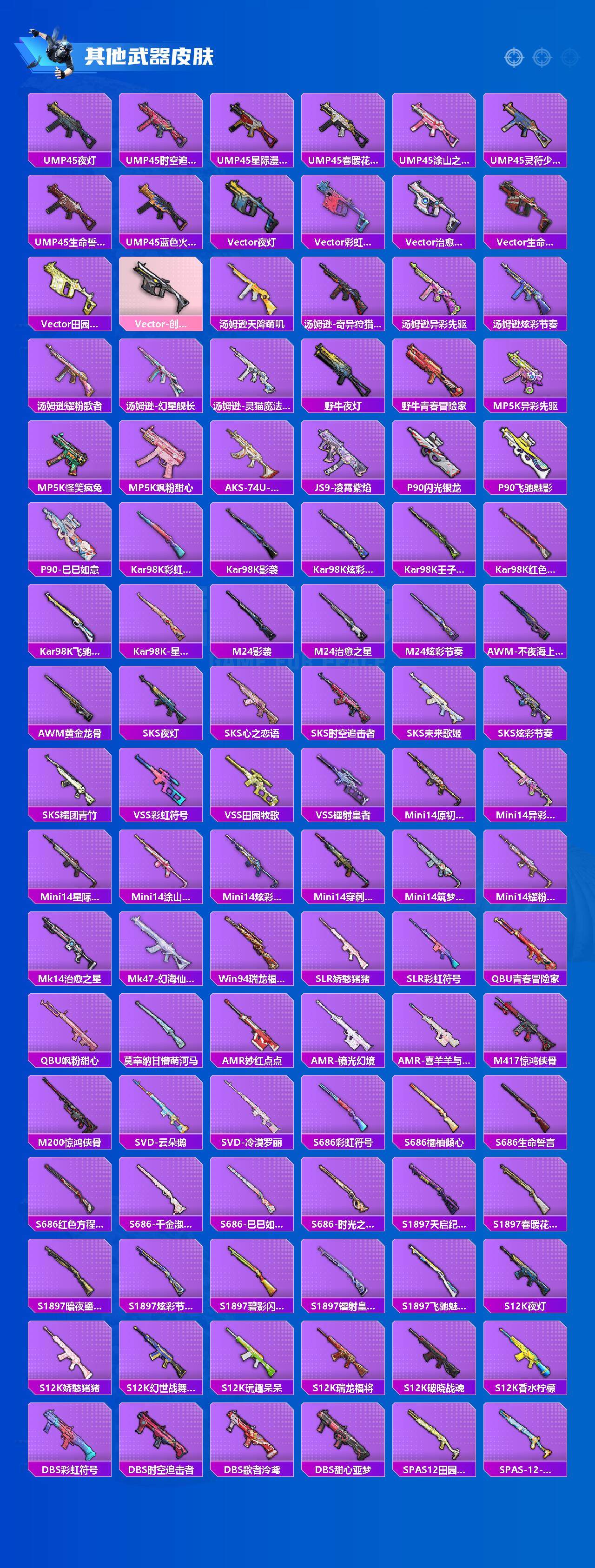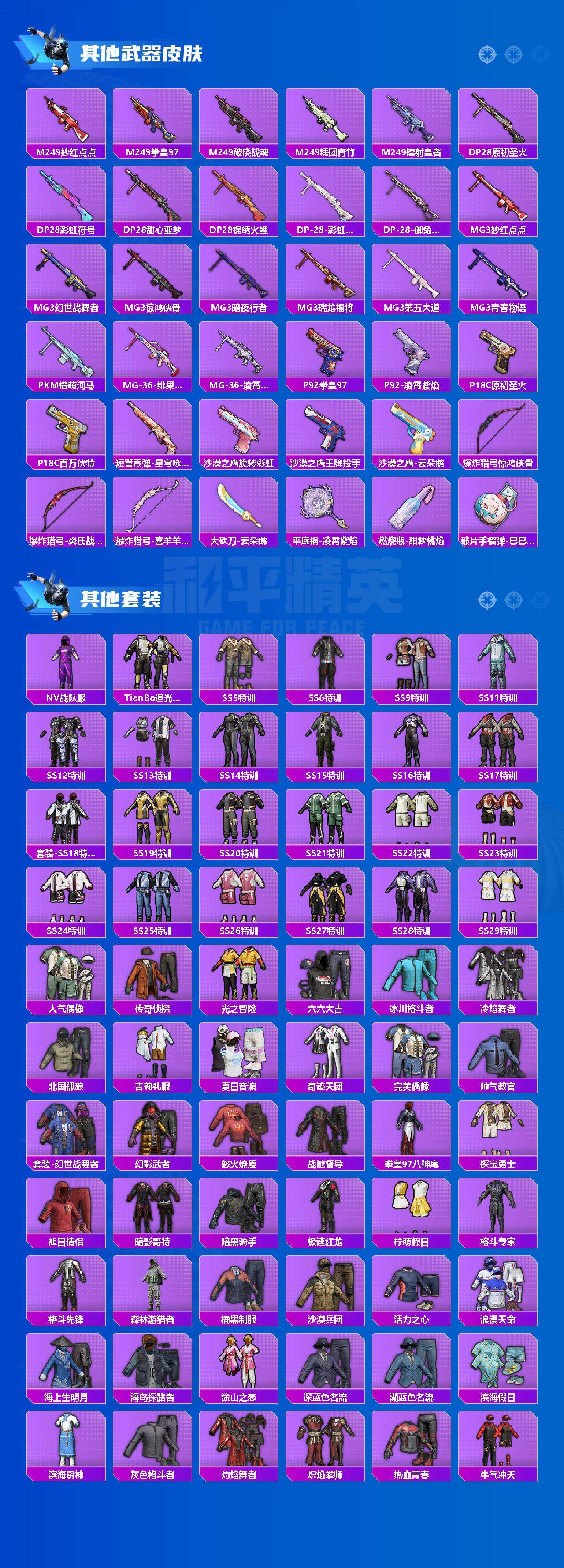 【粉色枪皮】:AKM-梦之光华,SCAR-L-时空协奏,M416-五爪金龙,AUG-暖羊咩咩,AUG-圣斗士星矢,UMP45-量子极限,Kar98K-巳巳如意,DP-28-豹影疾电,MG3-梦幻舞会,平底锅-喜羊羊与灰太狼,破片手榴弹-瓶中星球