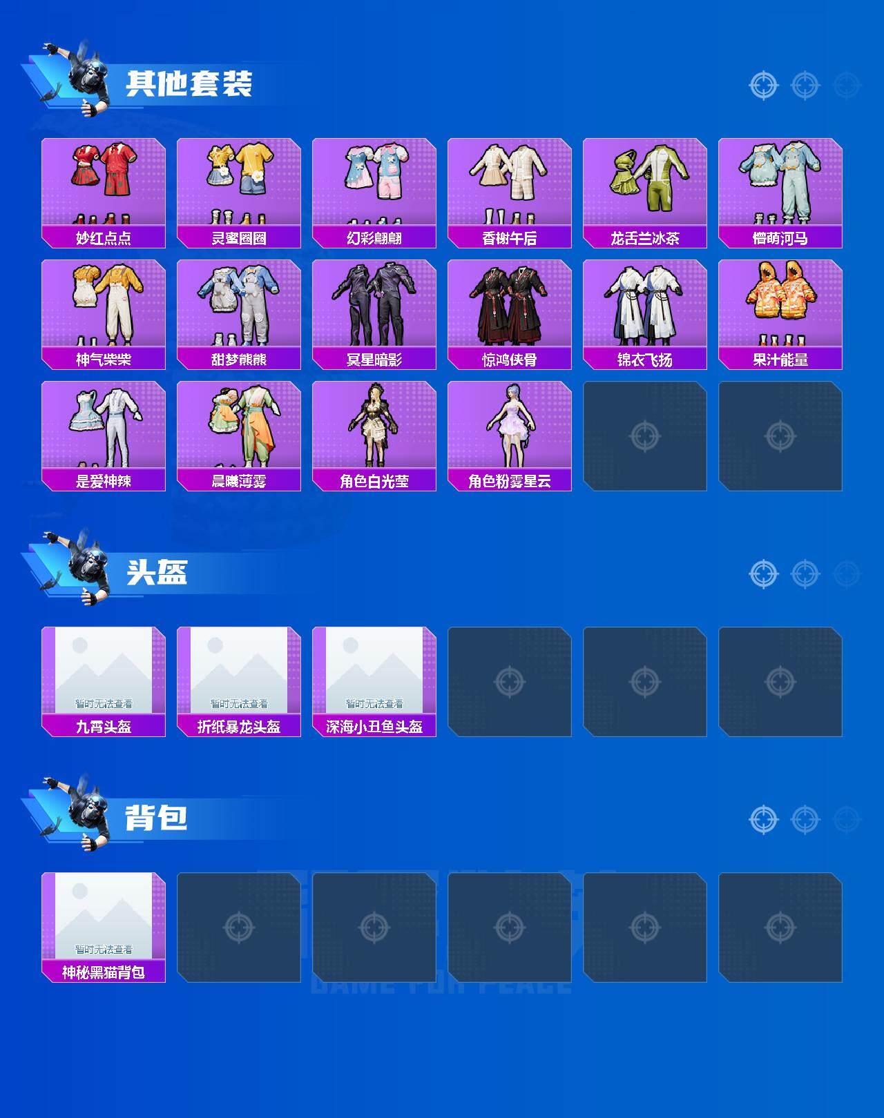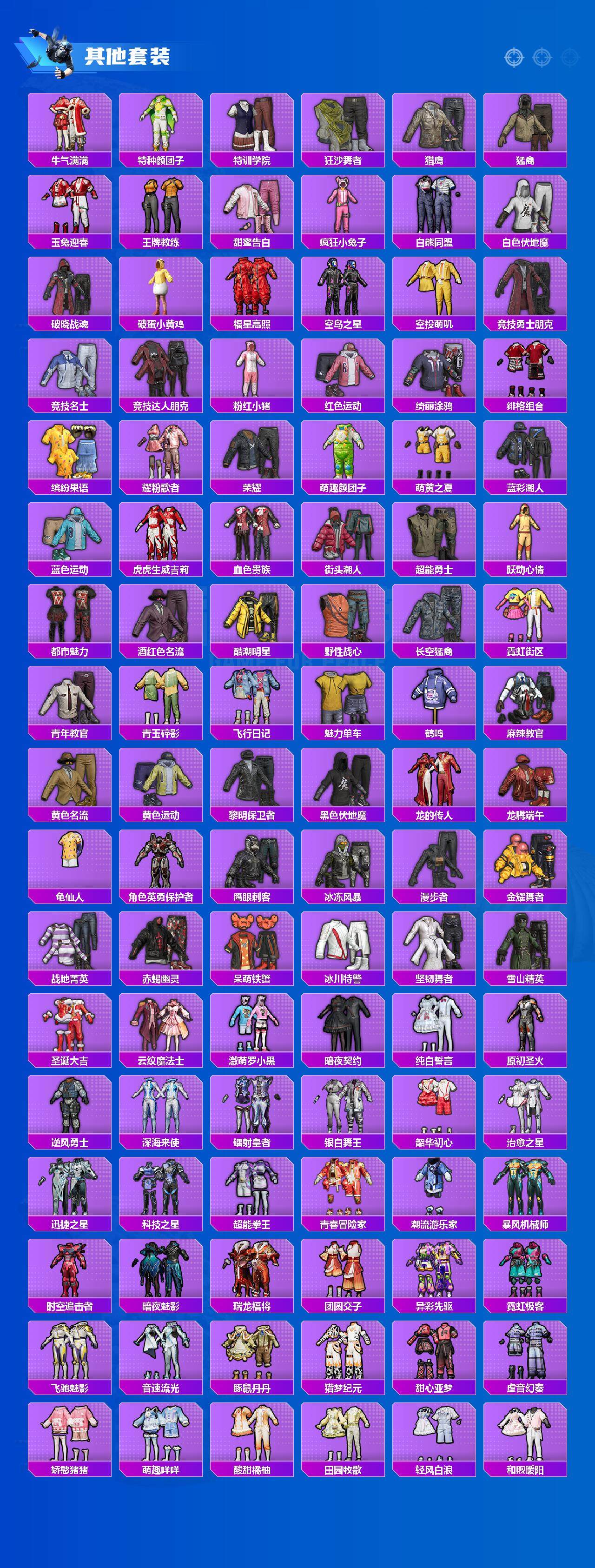 套装-浪漫天命,套装-龟仙人,套装-暗影哥特,套装-粉红小猪,套装-TianBa追光队服,套装-极速红龙,套装-狂沙舞者,套装-破蛋小黄鸡,角色-英勇保护者,套装-漫步者,套装-雪山精英,套装-暗夜契约,套装-纯白誓言,套装-韶华初心,套装-瑞龙福将,套装-团圆交子,套装-豚鼠丹丹