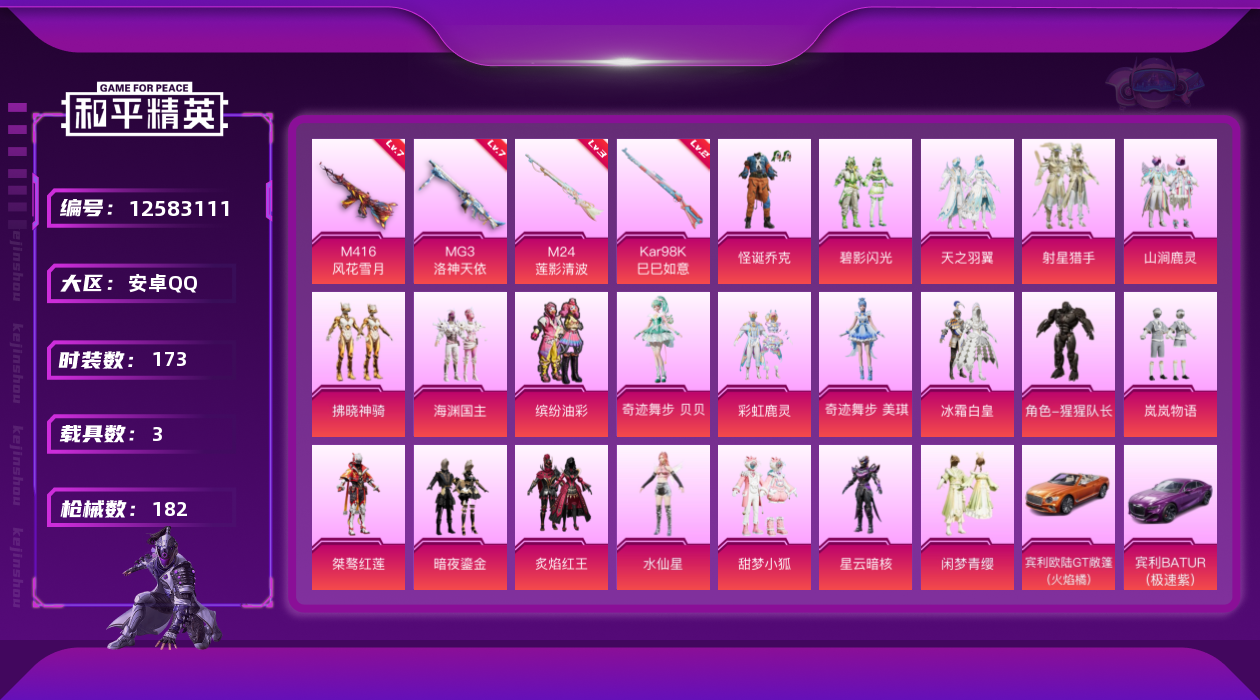 [12583111]安卓 手Q-21粉装-4特效枪-3载具-2粉色飞行器-70596热力值-10王牌印记-173套装-182枪皮