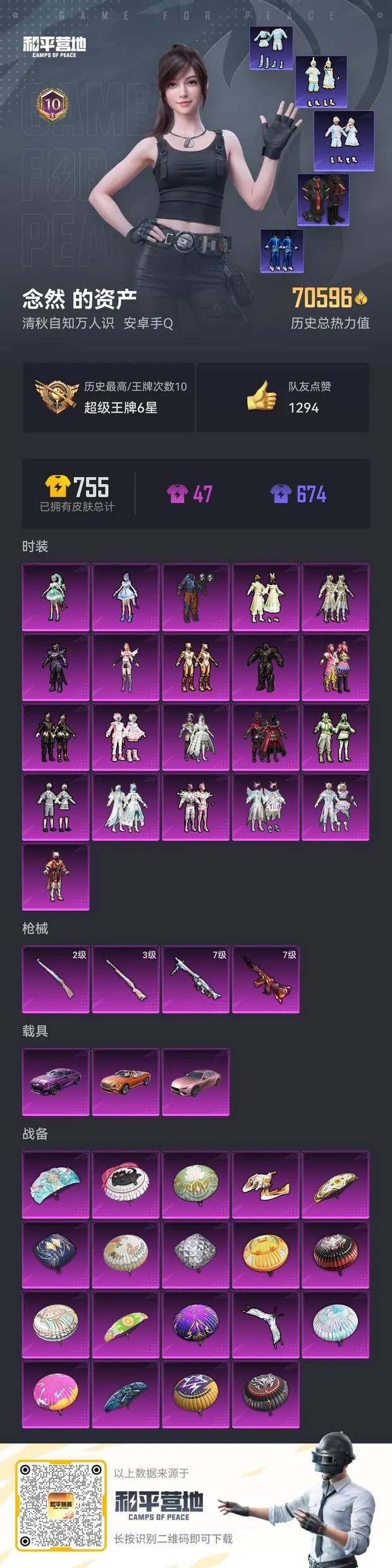 [12583111]安卓 手Q-21粉装-4特效枪-3载具-2粉色飞行器-70596热力值-10王牌印记-173套装-182枪皮 【热门品类】:粉装-怪诞乔克,粉装-缤纷油彩,角色-军刀雅典娜,套装-AG战队服,套装-龟仙人,套装-红红火火,小丑红鼻头,大砍刀-青龙偃月刀 【粉色载具】:玛莎拉蒂Ghibli(粉),宾利欧陆GT敞篷(火焰橘),宾利BATUR(极速紫) 【粉色套装】:粉装-怪诞乔克,粉装-缤纷油彩,粉装-冰霜白皇,粉装-炙焰红王,粉装-桀骜红莲,粉装-彩虹鹿灵,粉装-山涧鹿灵,粉装-海渊国主,粉装-天之羽翼,粉装-碧影闪光,粉装-岚岚物语,粉装-甜梦小狐,粉装-暗夜鎏金,角色-猩猩队长,粉装-拂晓神骑,粉装-闲梦青缨,角色-水仙星,粉装-射星猎手,角色-星云暗核,角色-奇迹舞步 贝贝,角色-奇迹舞步 美琪 【粉色枪皮等级】:M416-风花雪月(七级),Kar98K-巳巳如意(二级),M24-莲影清波(三级),MG3-洛神天依(七级) 【粉色枪皮】:M416-风花雪月,Kar98K-巳巳如意,M24-莲影清波,MG3-洛神天依 【粉色飞行器】:天之羽翼飞行器,拂晓神骑飞行器 【粉色降落伞】:百万伏特降落伞,春暖花开降落伞,焰龙焚天降落伞,暗夜玫瑰降落伞,蓝莓炮弹降落伞,暗星紫秘降落伞,天之羽翼降落伞,碧影闪光降落伞,筑梦精灵降落伞,炙焰牛王降落伞,垂柳戏鸭降落伞,千面幻镜降落伞,青空秋雨降落伞,拂晓神骑降落伞,闲梦青缨降落伞,绯穹魔姬降落伞,奇迹舞步降落伞 【稀有套装】:套装-龟仙人,套装-云朵鹅,套装-雪绒豹 【稀有枪皮】:AKM-2P战斗服款,AKM-夜灯,AKM-彩虹符号,AKM-灼热熔岩,AKM-萝萝小趴兔,AKM-虎虎生威,AKM-霓虹街区,AKM-龙的传人,M16A4-幻世战舞者,M16A4-甜心亚梦,M16A4-莲影清波,SCAR-L-是爱神辣,SCAR-L-炫彩节奏,SCAR-L-玉兔迎春,M416-暗星紫秘,M416-糯团青竹,M416-紫翼圣骑,GROZA-异彩先驱,GROZA-恐龙拽拽,GROZA-懵萌河马,GROZA-林间仙鹿,GROZA-田园牧歌,GROZA-蓝莓炮弹,AUG-天降萌叽,AUG-幻影战神,AUG-闲梦青缨,QBZ-彩虹符号,QBZ-未来歌姬,QBZ-飞驰魅影,M762-天降萌叽,M762-瑞龙福将,M762-云朵鹅,Mk47-天之