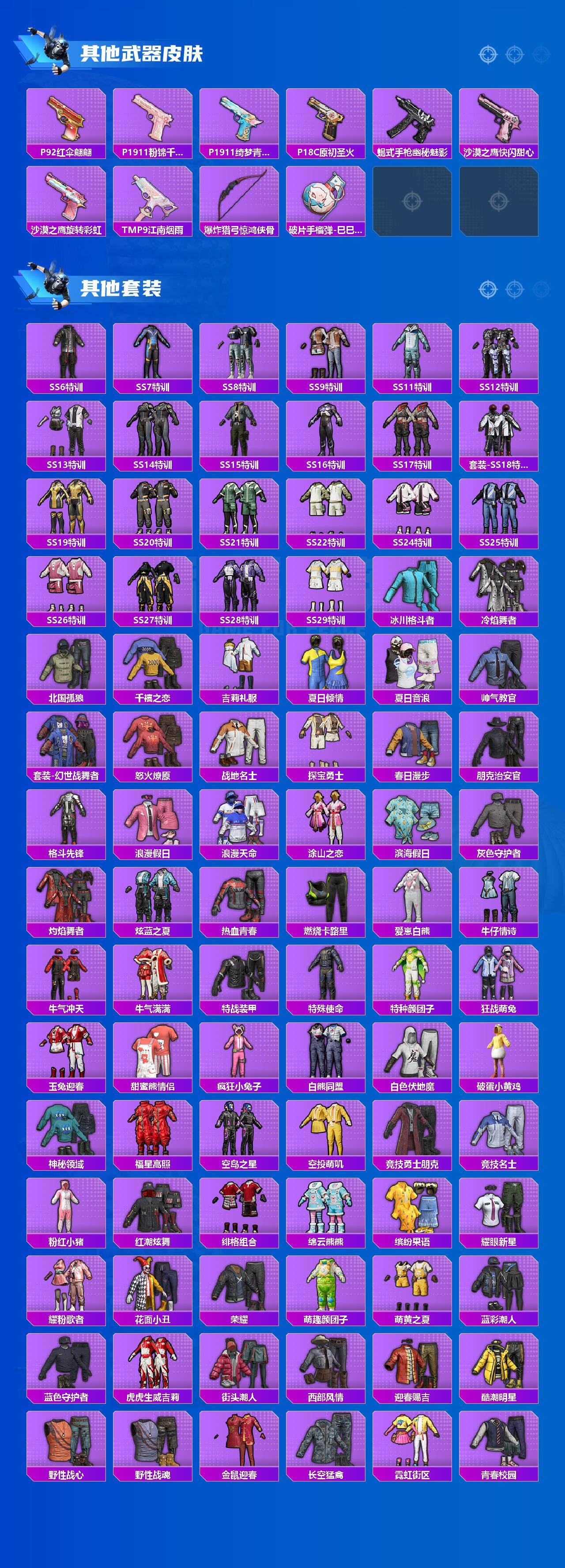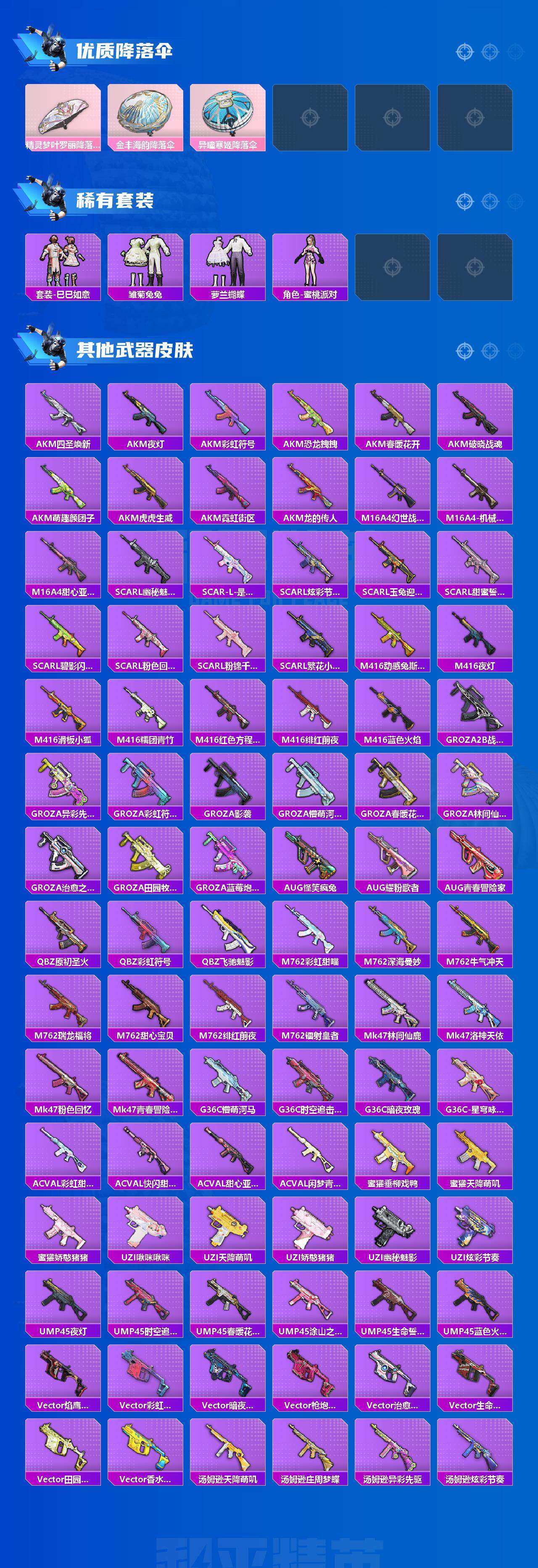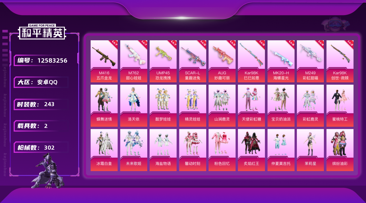 [12583256]安卓 手Q-26粉装-9特效枪-2载具-5粉色飞行器-113781热力值-18王牌印记-243套装-302枪皮 【热门品类】:粉装-童趣迷兔,粉装-缤纷油彩,套装-寒蝎幽灵,套装-浪漫天命,套装-小丑鱼,套装-胖达圆圆,套装-金羽特工,套装-龟仙人,套装-粉红小猪,角色-Mark.06 【粉色载具】:星河领航(磐石银),Formula E Gen2(幽光蓝),僚机-萌兔起飞 【粉色套装】:粉装-深海曼妙,粉装-粉色回忆,粉装-宝贝奶油派,粉装-天使彩虹糖,粉装-蝶舞迷情,粉装-缤纷油彩,粉装-放客神游,粉装-冰霜白皇,粉装-童趣迷兔,粉装-炙焰红王,粉装-王牌四分卫,粉装-馨动时刻,粉装-蜜桃特工,粉装-彩虹鹿灵,粉装-山涧鹿灵,角色-洛天依,粉装-精灵娃娃,粉装-酣梦娃娃,粉装-海盐物语,粉装-彩虹甜喵,粉装-仲夏莫吉托,粉装-瑰丽时代,粉装-飒粉甜心,粉装-未来歌姬,角色-蔷薇星,角色-茉莉星 【粉色枪皮等级】:SCAR-L-童趣迷兔(五级),M416-五爪金龙(七级),AUG-妙趣可丽(五级),M762-甜心娃娃(七级),UMP45-恐龙拽拽(七级),Kar98K-创世·救赎(三级),Kar98K-巳巳如意(五级),MK20-H-海螺星光(四级),M249-彩虹甜喵(四级) 【粉色枪皮】:SCAR-L-童趣迷兔,M416-五爪金龙,AUG-妙趣可丽,M762-甜心娃娃,UMP45-恐龙拽拽,Kar98K-创世·救赎,Kar98K-巳巳如意,MK20-H-海螺星光,M249-彩虹甜喵 【粉色飞行器】:齐天大圣飞行器,庄周梦蝶飞行器,星夜魔法师飞行翼,冰川粉黛飞行器,萌物绒绒飞行器 【粉色降落伞】:深海曼妙降落伞,甜心宝贝降落伞,春暖花开降落伞,繁花小夜曲降落伞,甜蜜誓约降落伞,四圣焕新降落伞,心之恋语降落伞,阿狸红降落伞,夏日绵绵冰降落伞,童趣迷兔降落伞,香水柠檬降落伞,王牌四分卫降落伞,绮梦青鸾降落伞,枪炮玫瑰降落伞,暗夜玫瑰降落伞,林间仙鹿降落伞,蓝莓炮弹降落伞,甜心娃娃降落伞,恐龙拽拽降落伞,橘柚倾心降落伞,炙焰牛王降落伞,暖熊萌萌降落伞,垂柳戏鸭降落伞,彩虹甜喵降落伞,旋转彩虹降落伞,第五大道降落伞,梦幻舞会降落伞,白勺歌姬降落伞,未来歌姬降落伞,莲影清波降落伞,精灵梦叶罗丽降落伞,金丰海韵降落伞,异瞳寒姬降落伞 【稀有套装】:套装-龟仙人,套装-巳巳
