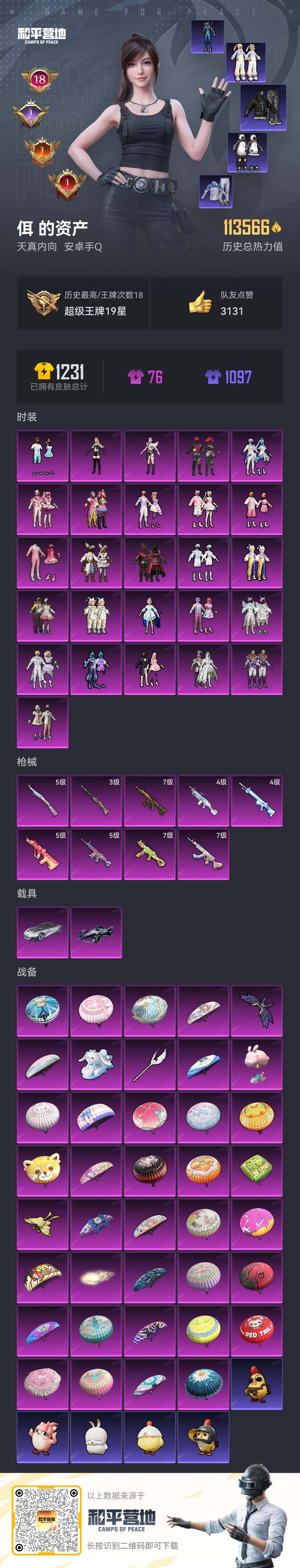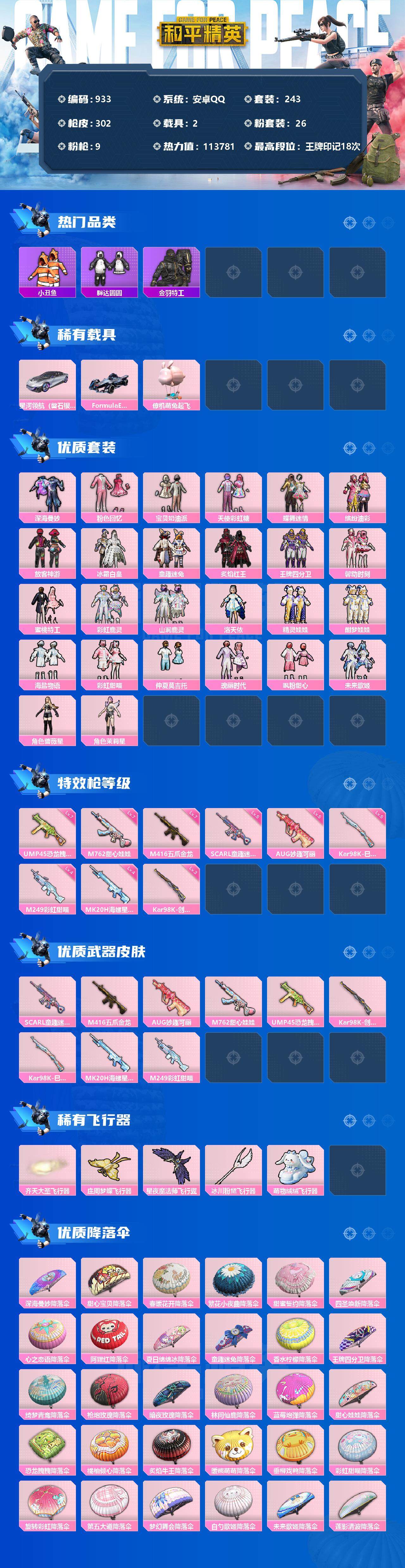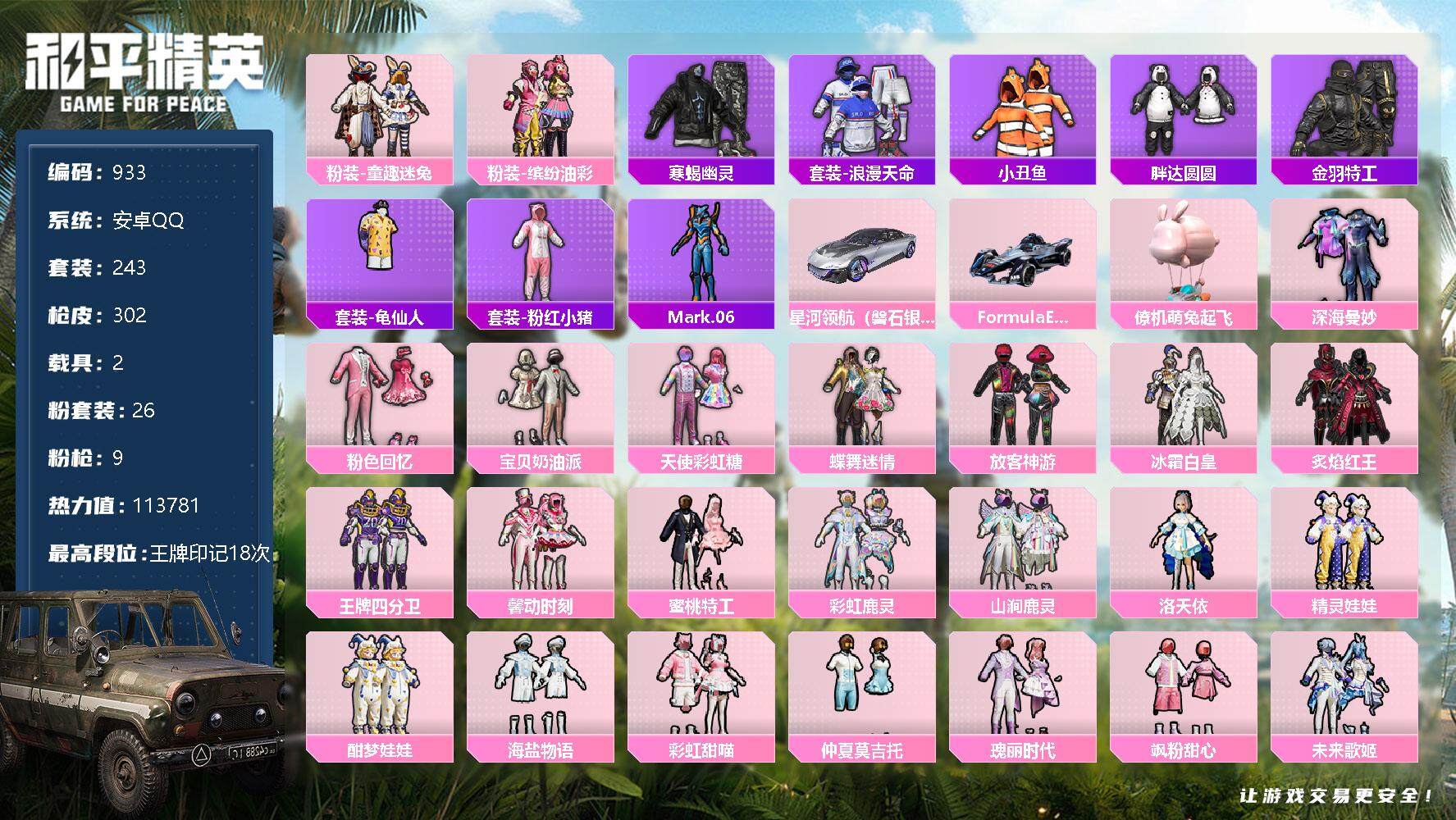 [12583256]安卓 手Q-26粉装-9特效枪-2载具-5粉色飞行器-113781热力值-18王牌印记-243套装-302枪皮