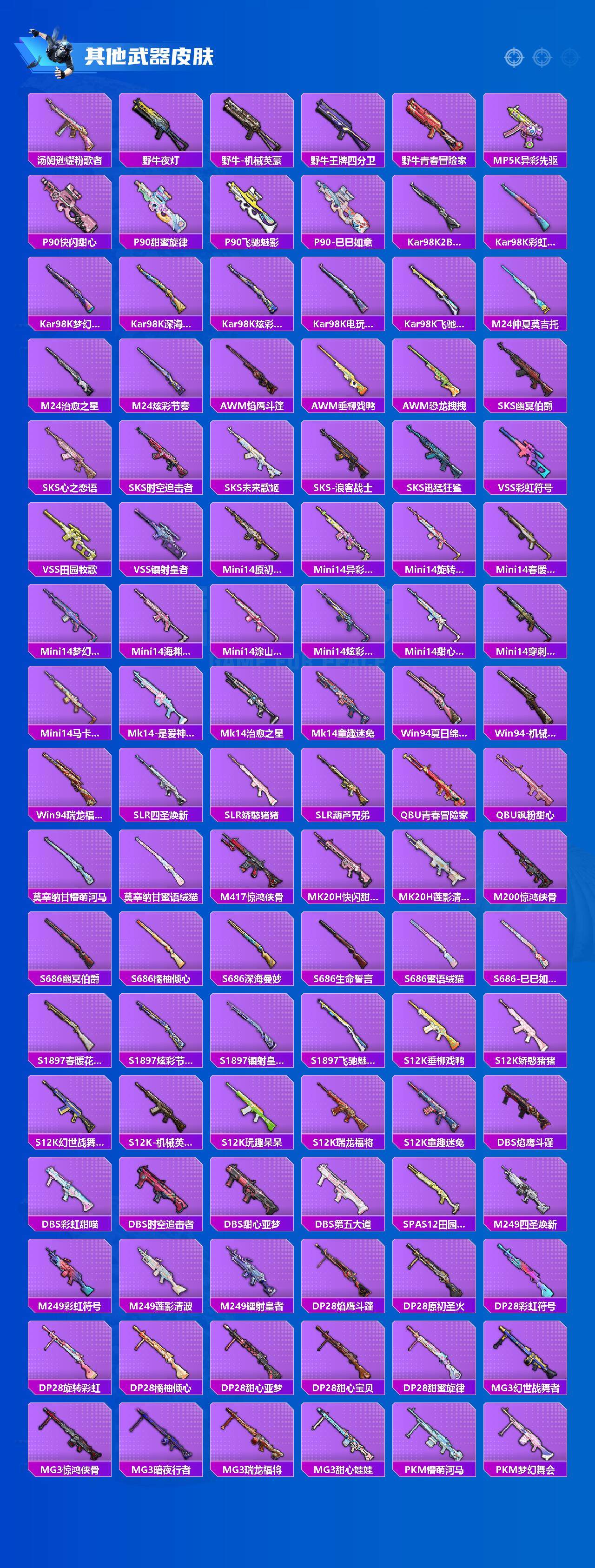 【粉色枪皮等级】:SCAR-L-童趣迷兔(五级),M416-五爪金龙(七级),AUG-妙趣可丽(五级),M762-甜心娃娃(七级),UMP45-恐龙拽拽(七级),Kar98K-创世·救赎(三级),Kar98K-巳巳如意(五级),MK20-H-海螺星光(四级),M249-彩虹甜喵(四级)
