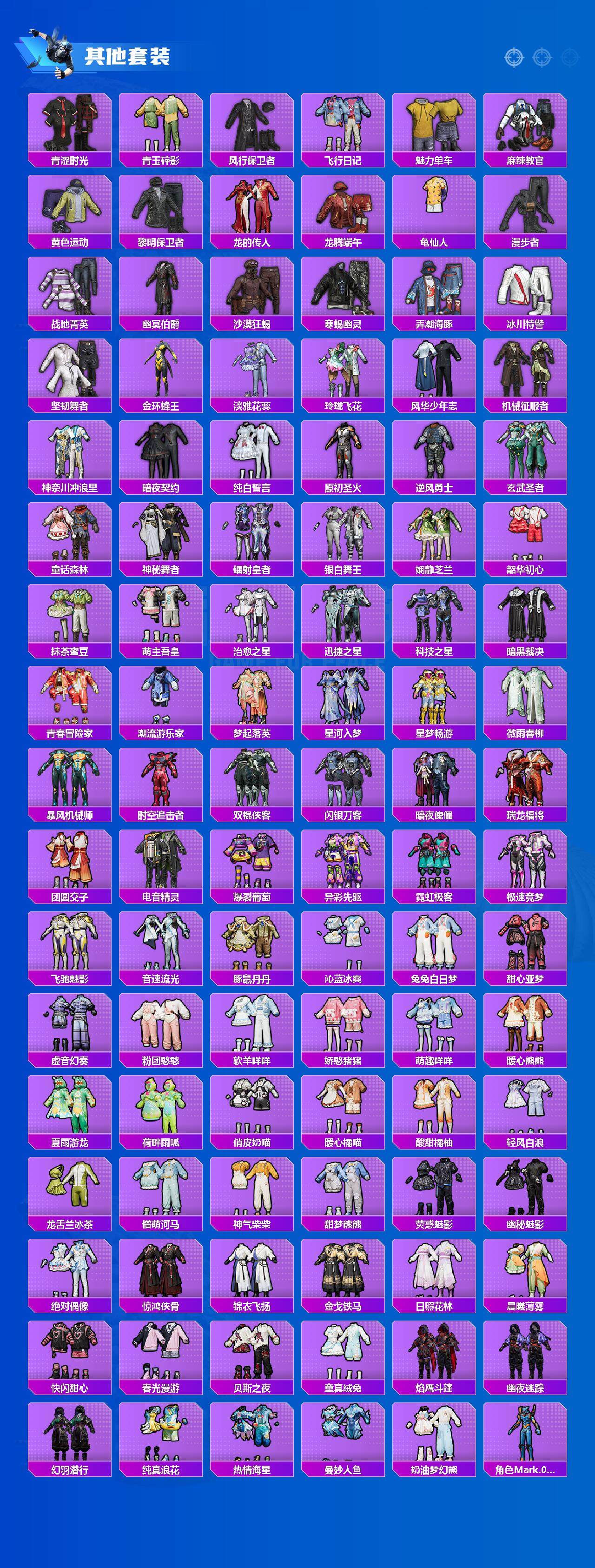 套装-浪漫天命,套装-金羽特工,套装-龟仙人,套装-粉红小猪,角色-Mark.06,套装-破蛋小黄鸡,套装-漫步者,套装-幽冥伯爵,套装-弄潮海豚,风华少年志套装,套装-暗夜契约,套装-纯白誓言,套装-玄武圣者,套装-童话森林,套装-娴静芝兰,套装-韶华初心,抹茶蜜豆套装,套装-梦起落英,套装-瑞龙福将,套装-团圆交子,套装-豚鼠丹丹