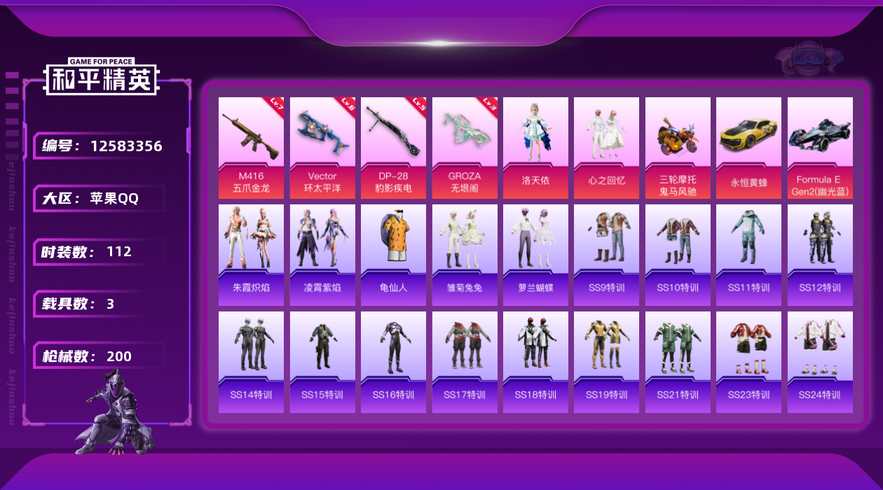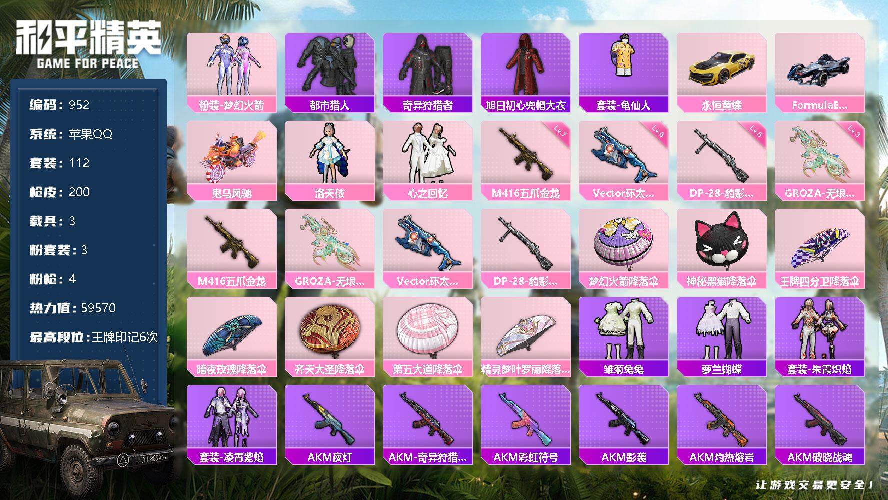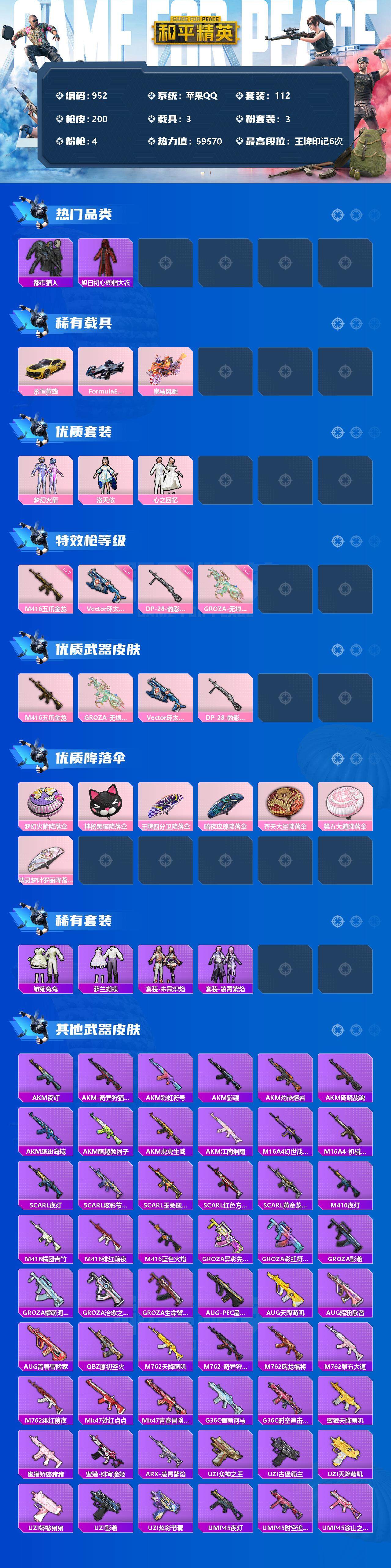 [12583356]苹果 手Q-3粉装-4特效枪-3载具-0粉色飞行器-59570热力值-6王牌印记-112套装-200枪皮 【热门品类】:粉装-梦幻火箭,套装-都市猎人,套装-奇异狩猎者,旭日初心兜帽大衣,套装-龟仙人 【粉色载具】:永恒黄蜂,Formula E Gen2(幽光蓝),鬼马风驰 【粉色套装】:粉装-梦幻火箭,角色-洛天依,粉装-心之回忆 【粉色枪皮等级】:M416-五爪金龙(七级),GROZA-无垠阁(三级),Vector-环太平洋(六级),DP-28-豹影疾电(五级) 【粉色枪皮】:M416-五爪金龙,GROZA-无垠阁,Vector-环太平洋,DP-28-豹影疾电 【粉色降落伞】:梦幻火箭降落伞,神秘黑猫降落伞,王牌四分卫降落伞,暗夜玫瑰降落伞,齐天大圣降落伞,第五大道降落伞,精灵梦叶罗丽降落伞 【稀有套装】:套装-龟仙人,套装-雏菊兔兔,套装-萝兰蝴蝶,套装-朱霞炽焰,套装-凌霄紫焰 【稀有枪皮】:AKM-夜灯,AKM-奇异狩猎者,AKM-彩虹符号,AKM-影袭,AKM-江南烟雨,AKM-灼热熔岩,AKM-破晓战魂,AKM-缤纷海域,AKM-萌趣颜团子,AKM-虎虎生威,M16A4-幻世战舞者,M16A4-机械英豪,SCAR-L-夜灯,SCAR-L-炫彩节奏,SCAR-L-玉兔迎春,SCAR-L-红色方程式,SCAR-L-黄金龙骨,M416-夜灯,M416-糯团青竹,M416-绯红前夜,M416-蓝色火焰,GROZA-异彩先驱,GROZA-彩虹符号,GROZA-影袭,GROZA-懵萌河马,GROZA-治愈之星,GROZA-生命誓言,AUG-PEC最牛战神,AUG-天降萌叽,AUG-耀粉歌者,AUG-青春冒险家,QBZ-原初圣火,M762-天降萌叽,M762-奇异狩猎者,M762-瑞龙福将,M762-第五大道,M762-绯红前夜,Mk47-妙红点点,Mk47-青春冒险家,G36C-懵萌河马,G36C-时空追击者,蜜獾-天降萌叽,蜜獾-娇憨猪猪,蜜獾-绯穹魔姬,ARX-凌霄紫焰,UZI-众神之王,UZI-古堡领主,UZI-天降萌叽,UZI-娇憨猪猪,UZI-影袭,UZI-炫彩节奏,UMP45-夜灯,UMP45-时空追击者,UMP45-涂山之恋,Vector-彩虹符号,Vector-治愈之星,汤姆逊-奇异狩猎者,汤姆逊-异彩先驱,汤姆逊-耀粉歌者,野牛-夜灯,野牛-机
