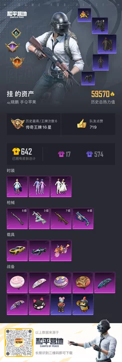 [12583356]苹果 手Q-3粉装-4特效枪-3载具-0粉色飞行器-59570热力值-6王牌印记-112套装-200枪皮