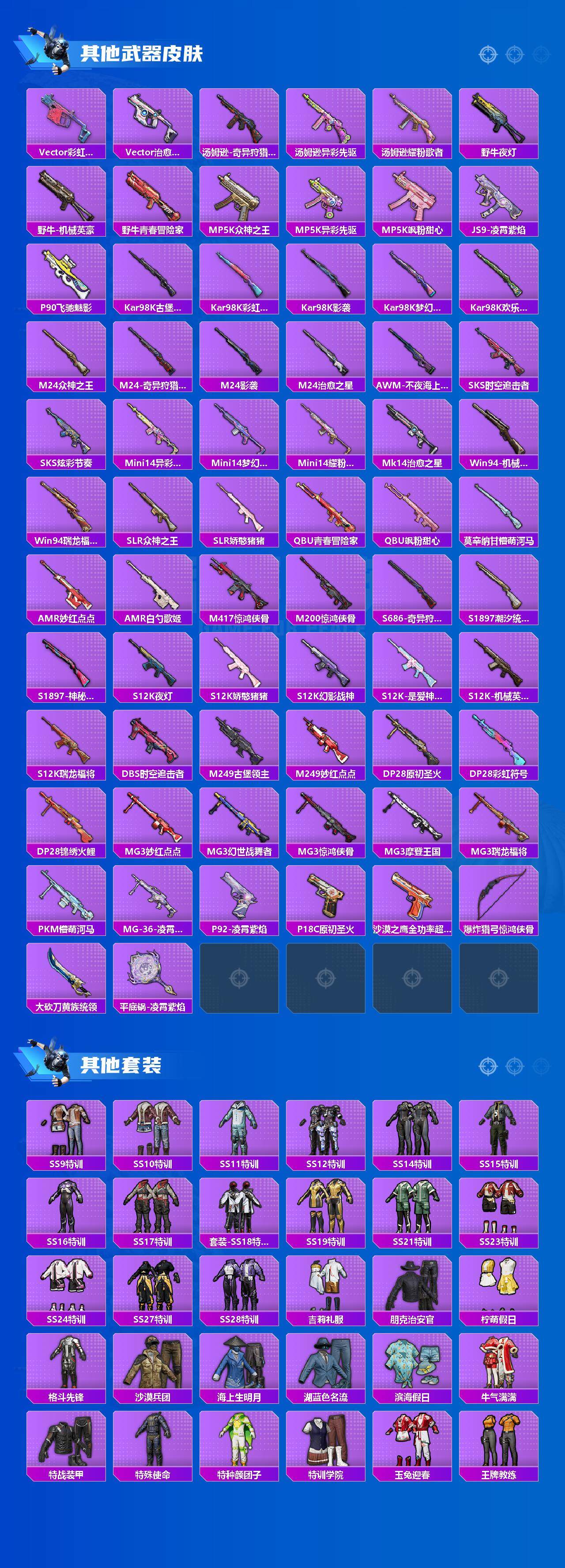 【稀有枪皮】:AKM-夜灯,AKM-奇异狩猎者,AKM-彩虹符号,AKM-影袭,AKM-江南烟雨,AKM-灼热熔岩,AKM-破晓战魂,AKM-缤纷海域,AKM-萌趣颜团子,AKM-虎虎生威,M16A4-幻世战舞者,M16A4-机械英豪,SCAR-L-夜灯,SCAR-L-炫彩节奏,SCAR-L-玉兔迎春,SCAR-L-红色方程式,SCAR-L-黄金龙骨,M416-夜灯,M416-糯团青竹,M416-绯红前夜,M416-蓝色火焰,GROZA-异彩先驱,GROZA-彩虹符号,GROZA-影袭,GROZA-懵萌河马,GROZA-治愈之星,GROZA-生命誓言,AUG-PEC最牛战神,AUG-天降萌叽,AUG-耀粉歌者,AUG-青春冒险家,QBZ-原初圣火,M762-天降萌叽,M762-奇异狩猎者,M762-瑞龙福将,M762-第五大道,M762-绯红前夜,Mk47-妙红点点,Mk47-青春冒险家,G36C-懵萌河马,G36C-时空追击者,蜜獾-天降萌叽,蜜獾-娇憨猪猪,蜜獾-绯穹魔姬,ARX-凌霄紫焰,UZI-众神之王,UZI-古堡领主,UZI-天降萌叽,UZI-娇憨猪猪,UZI-影袭,UZI-炫彩节奏,UMP45-夜灯,UMP45-时空追击者,UMP45-涂山之恋,Vector-彩虹符号,Vector-治愈之星,汤姆逊-奇异狩猎者,汤姆逊-异彩先驱,汤姆逊-耀粉歌者,野牛-夜灯,野牛-机