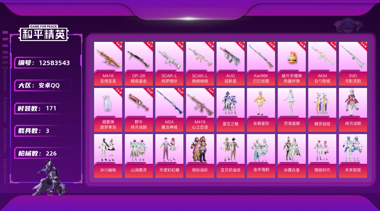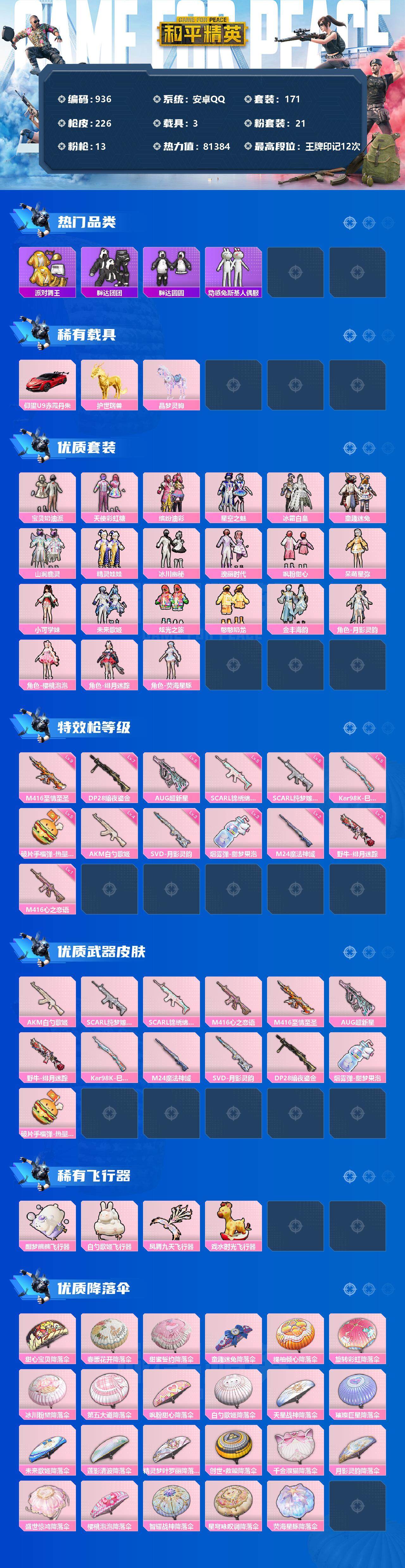 [12583543]安卓 手Q-21粉装-13特效枪-3载具-6粉色飞行器-81384热力值-12王牌印记-171套装-226枪皮 【热门品类】:粉装-童趣迷兔,粉装-缤纷油彩,套装-派对舞王,套装-胖达团团,套装-胖达圆圆,套装-动感兔斯基人偶服,套装-龟仙人,套装-暗影哥特,套装-粉红小猪,套装-糯粉咩咩,套装-软软马卡龙,套装-红熊茄茄 【粉色载具】:仰望U9(赤霞丹朱),护世瑞兽,晶梦灵驹 【粉色套装】:粉装-宝贝奶油派,粉装-天使彩虹糖,粉装-缤纷油彩,粉装-星空之魅,粉装-冰霜白皇,粉装-童趣迷兔,粉装-山涧鹿灵,粉装-精灵娃娃,粉装-冰川幽秘,粉装-瑰丽时代,粉装-飒粉甜心,角色-呆萌星弥,角色-小可学妹,粉装-未来歌姬,粉装-炫光之旅,粉装-憨憨奶龙,粉装-金丰海韵,角色-月影灵韵,角色-樱桃泡泡,角色-绯月迷踪,角色-荧海星豚 【粉色枪皮等级】:AKM-白勺歌姬(四级),SCAR-L-纯梦嫁纱(五级),SCAR-L-锦绣绵绵(五级),M416-心之恋语(一级),M416-至情至圣(九级),AUG-超新星(五级),野牛-绯月迷踪(二级),Kar98K-巳巳如意(五级),M24-魔法神域(二级),SVD-月影灵韵(三级),DP-28-暗夜鎏金(七级),烟雾弹-甜梦果泡(三级),破片手榴弹-热量炸弹(五级) 【粉色枪皮】:AKM-白勺歌姬,SCAR-L-纯梦嫁纱,SCAR-L-锦绣绵绵,M416-心之恋语,M416-至情至圣,AUG-超新星,野牛-绯月迷踪,Kar98K-巳巳如意,M24-魔法神域,SVD-月影灵韵,DP-28-暗夜鎏金,烟雾弹-甜梦果泡,破片手榴弹-热量炸弹 【粉色飞行器】:酣梦熊熊飞行器,白勺歌姬飞行器,凤舞九天飞行器,戏水时光飞行器 【粉色降落伞】:甜心宝贝降落伞,春暖花开降落伞,甜蜜誓约降落伞,童趣迷兔降落伞,橘柚倾心降落伞,旋转彩虹降落伞,冰川粉黛降落伞,第五大道降落伞,飒粉甜心降落伞,白勺歌姬降落伞,天星战神降落伞,璀璨巨星降落伞,未来歌姬降落伞,莲影清波降落伞,精灵梦叶罗丽降落伞,创世·救赎降落伞,千金淑猫降落伞,月影灵韵降落伞,盛世惊鸿降落伞,樱桃泡泡降落伞,智耀战神降落伞,星穹咏叹调降落伞,荧海星豚降落伞 【稀有套装】:套装-龟仙人,套装-航行童话,套装-绒宝小鹅,套装-巳巳如意,套装-荒原牛仔,套装-雏菊兔兔,套装-萝兰蝴蝶,套装-小熊