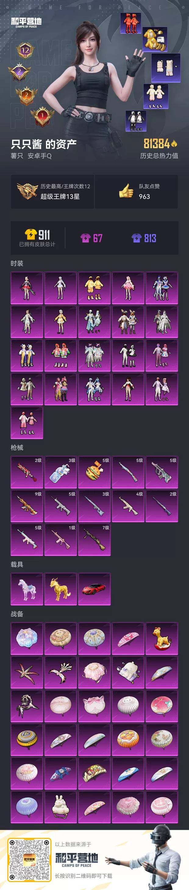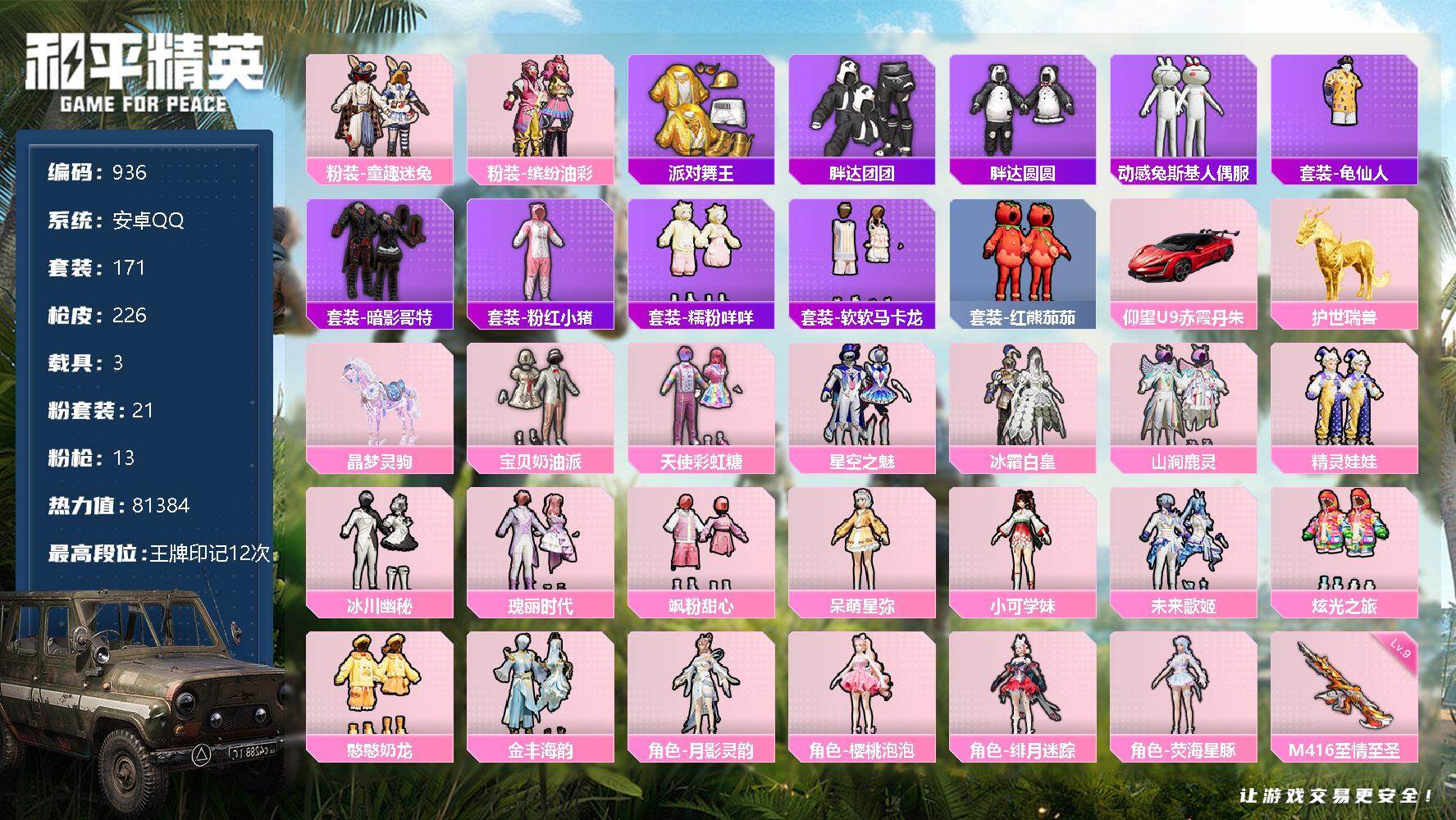 [12583543]安卓 手Q-21粉装-13特效枪-3载具-6粉色飞行器-81384热力值-12王牌印记-171套装-226枪皮
