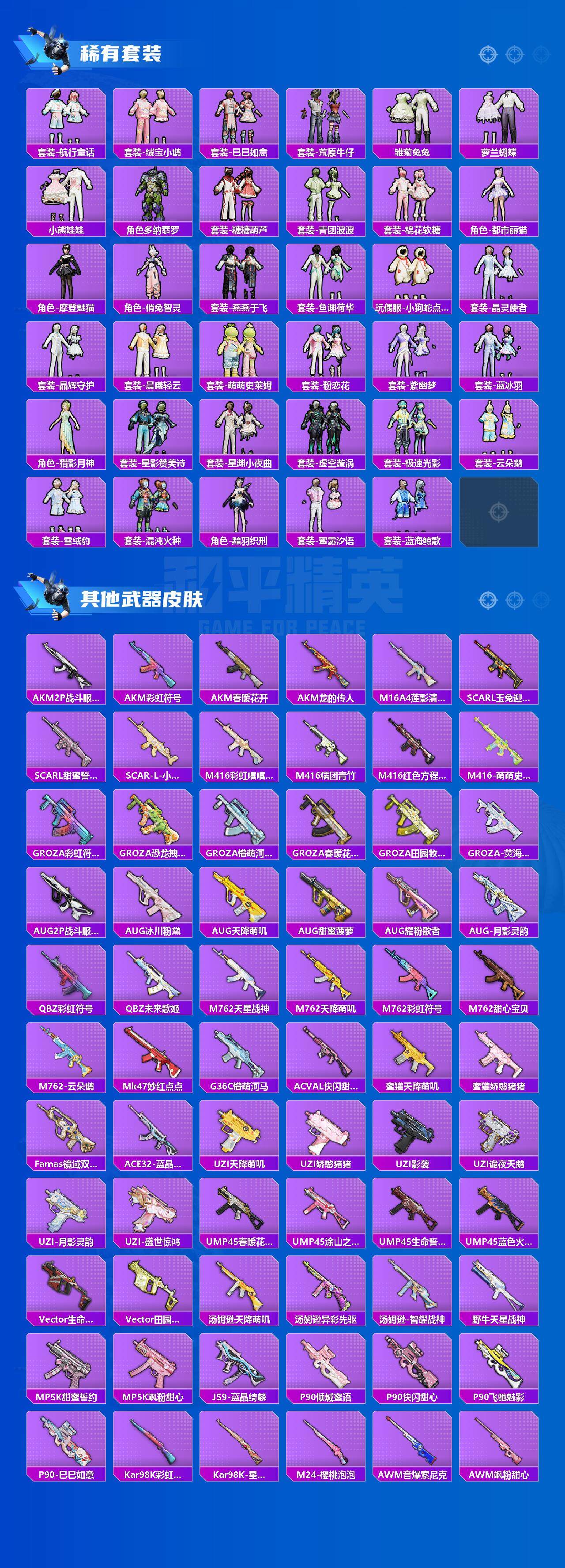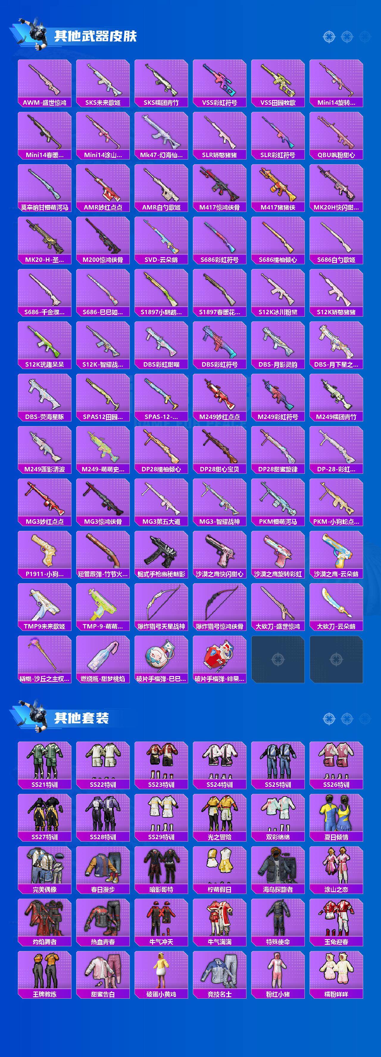 AKM-白勺歌姬,SCAR-L-纯梦嫁纱,M416-心之恋语,M416-至情至圣,AUG-超新星,Kar98K-巳巳如意,M24-魔法神域,SVD-月影灵韵,DP-28-暗夜鎏金,破片手榴弹-热量炸弹