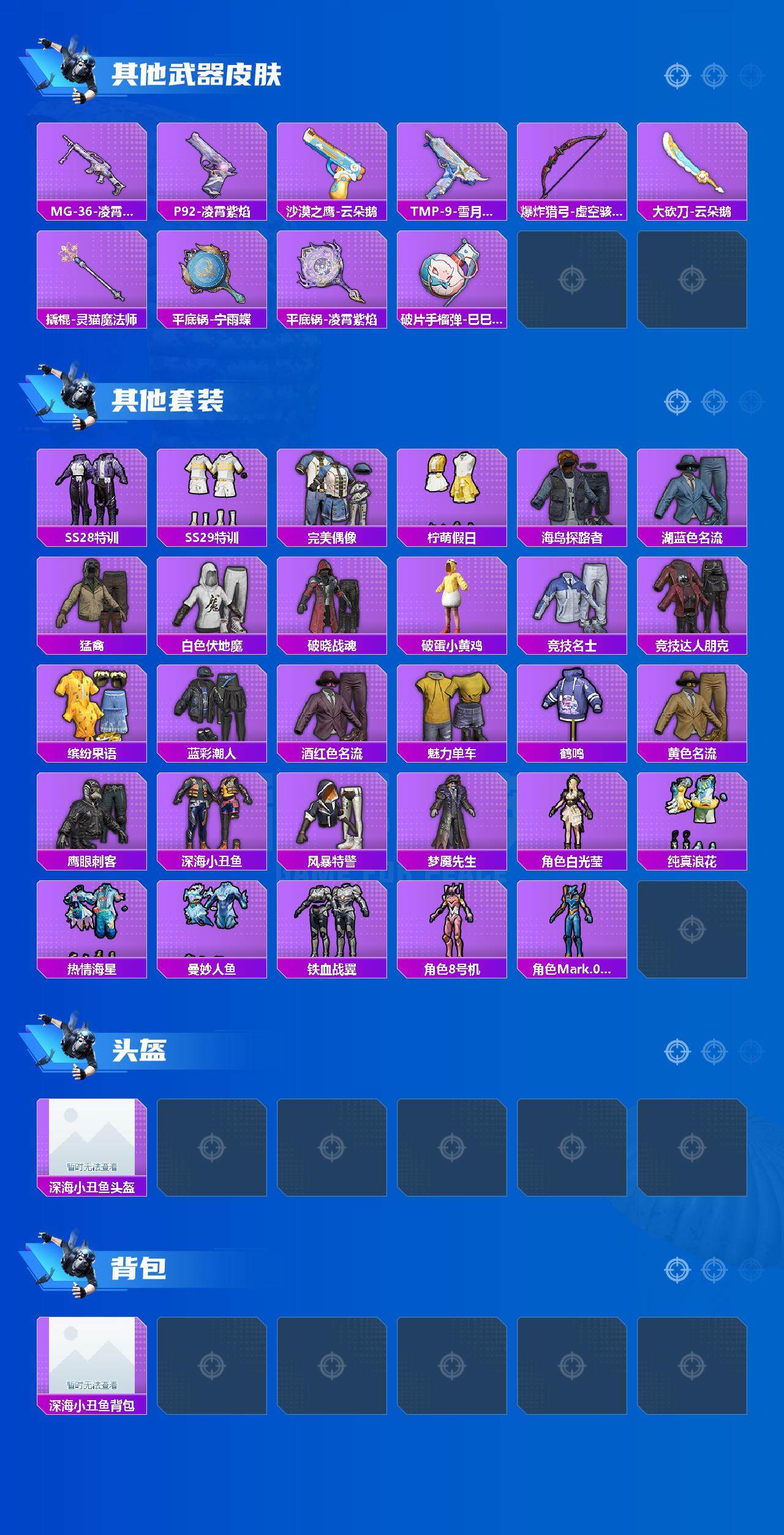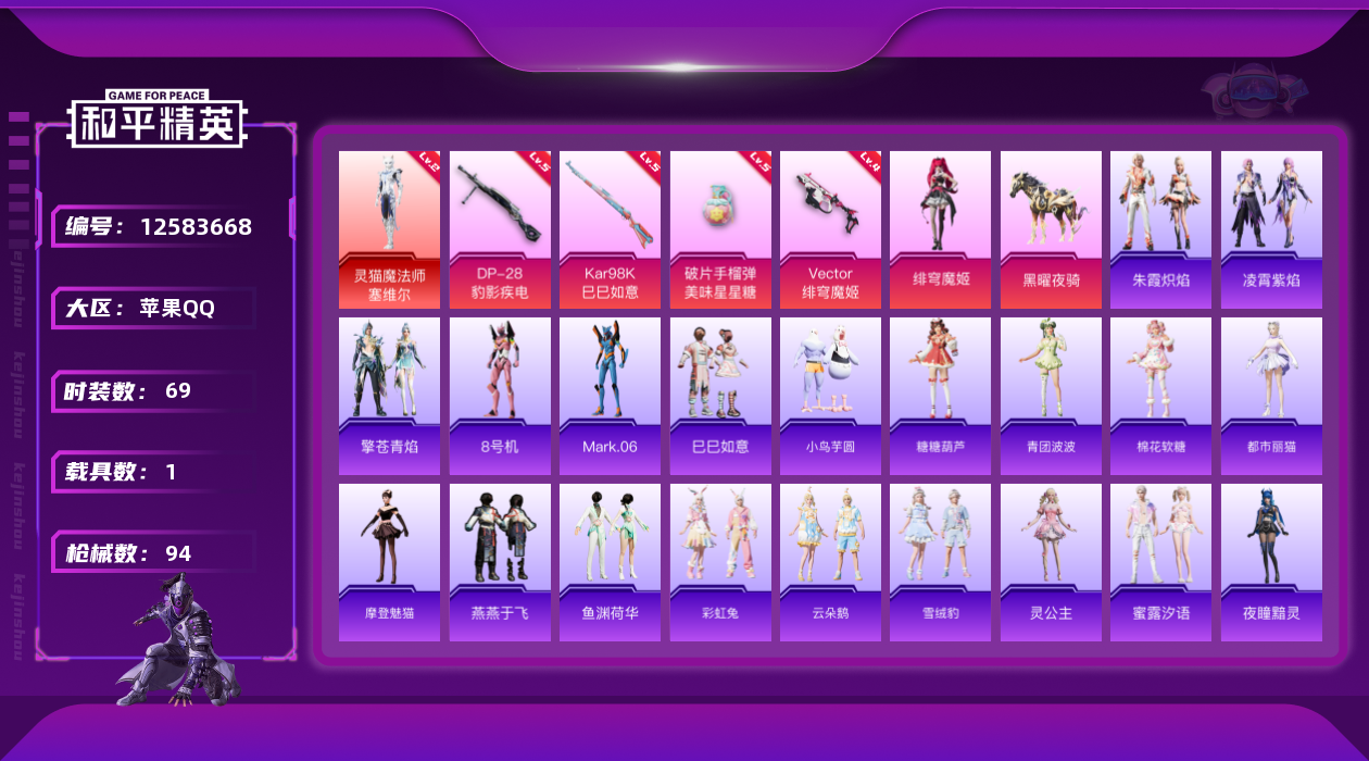 [12583668]苹果 手Q-1神装-1粉装-4特效枪-1载具-1粉色飞行器-30517热力值-4王牌印记-69套装-94枪皮 【红色神装等级】:灵猫魔法师-塞维尔(二级) 【红色角色神装】:灵猫魔法师-塞维尔 【热门品类】:套装-深海小丑鱼,角色-8号机,角色-Mark.06 【粉色载具】:黑曜夜骑 【粉色套装】:角色-绯穹魔姬 【粉色枪皮等级】:Vector-绯穹魔姬(四级),Kar98K-巳巳如意(五级),DP-28-豹影疾电(五级),破片手榴弹-美味星星糖(五级) 【粉色枪皮】:Vector-绯穹魔姬,Kar98K-巳巳如意,DP-28-豹影疾电,破片手榴弹-美味星星糖 【粉色飞行器】:灵猫魔法师飞行器 【粉色降落伞】:守护天翼降落伞,初号机 觉醒Ver.降落伞,忍者神龟降落伞,动力核心降落伞,鬼刀降落伞,幻彩电音降落伞,宁雨蝶降落伞,荧海星豚降落伞,灵猫魔法师降落伞,桃源时光降落伞 【稀有套装】:套装-巳巳如意,套装-小鸟芋圆,套装-糖糖葫芦,套装-青团波波,套装-棉花软糖,角色-都市丽猫,角色-摩登魅猫,套装-燕燕于飞,套装-鱼渊荷华,套装-彩虹兔,套装-云朵鹅,套装-雪绒豹,角色-灵公主,套装-蜜露汐语,角色-夜瞳黯灵,套装-朱霞炽焰,套装-凌霄紫焰,套装-擎苍青焰 【稀有枪皮】:AKM-灵猫魔法师,SCAR-L-炫彩节奏,M416-红色方程式,M416-蓝色火焰,GROZA-荧海星豚,AUG-耀粉歌者,M762-天降萌叽,M762-彩虹符号,M762-云朵鹅,ARX-凌霄紫焰,UZI-啾咪啾咪,Vector-生命誓言,汤姆逊-灵猫魔法师,JS9-凌霄紫焰,P90-巳巳如意,Kar98K-梦幻火箭,Kar98K-星穹咏叹调,Mini14-绯穹魔姬,AMR-喜羊羊与灰太狼,SVD-云朵鹅,S686-彩虹符号,S686-生命誓言,S686-巳巳如意,S1897-荧海星豚,S12K-破晓战魂,DBS-第五大道,SPAS-12-云朵鹅,M249-破晓战魂,MG3-幻世战舞者,PKM-小狗蛇点点,MG-36-凌霄紫焰,P92-凌霄紫焰,沙漠之鹰-云朵鹅,TMP-9-雪月幻音,爆炸猎弓-虚空骇客,大砍刀-云朵鹅,撬棍-灵猫魔法师,平底锅-宁雨蝶,平底锅-凌霄紫焰,破片手榴弹-巳巳如意 【其他套装】:套装-SS28特训,套装-SS29特训,套装-完美偶像,套装-柠萌假日,套装-海岛