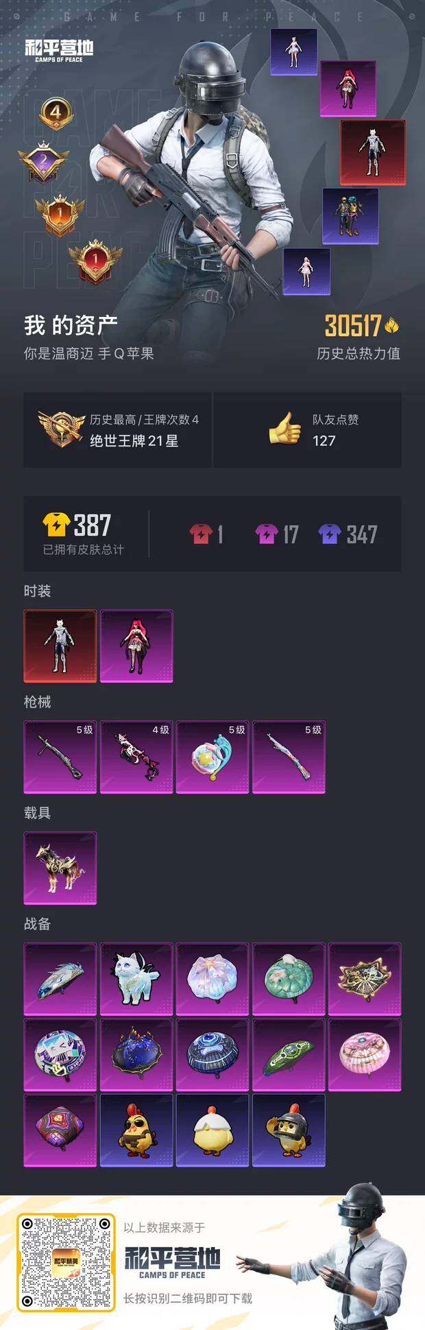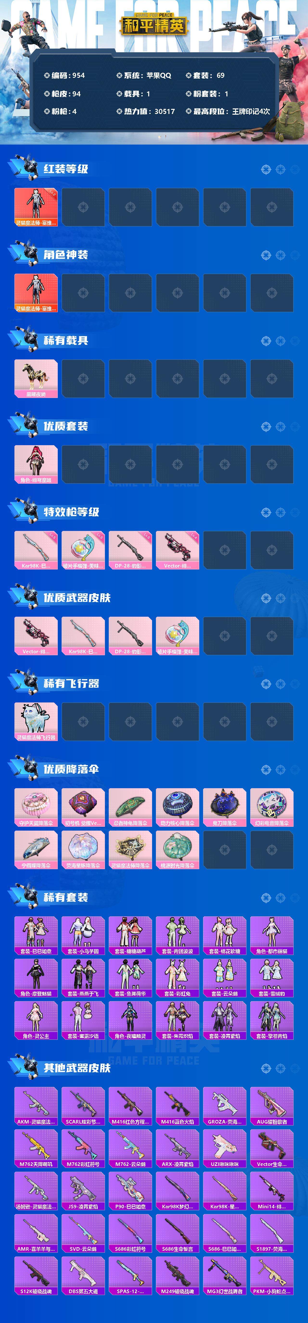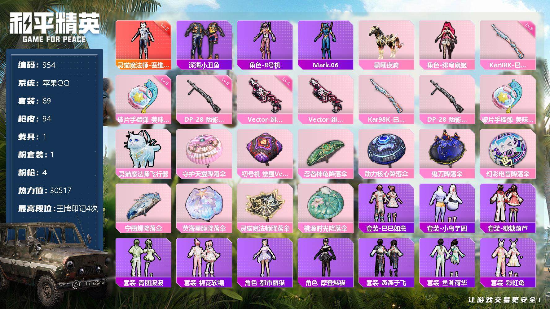 [12583668]苹果 手Q-1神装-1粉装-4特效枪-1载具-1粉色飞行器-30517热力值-4王牌印记-69套装-94枪皮