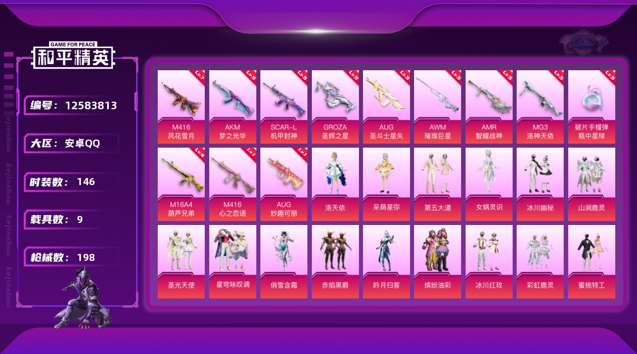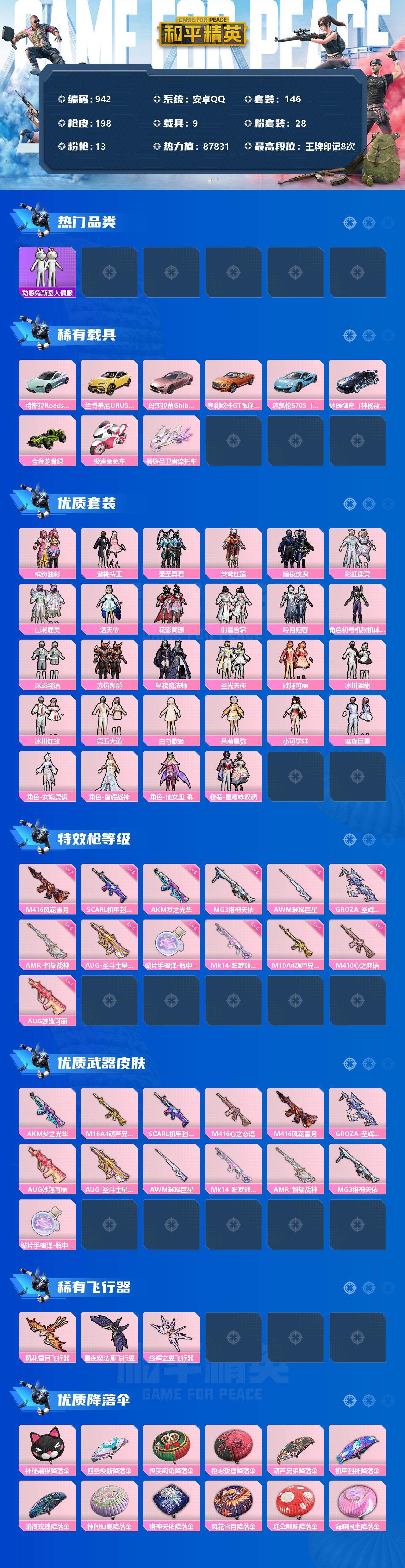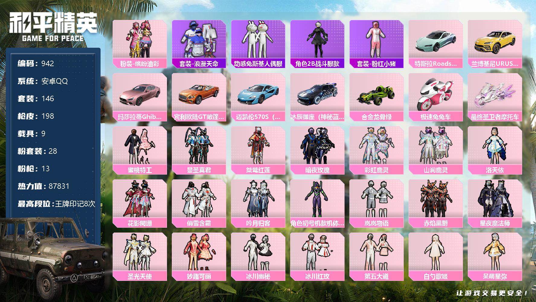 [12583813]安卓 手Q-28粉装-13特效枪-9载具-3粉色飞行器-87831热力值-8王牌印记-146套装-198枪皮 【热门品类】:粉装-缤纷油彩,套装-浪漫天命,套装-动感兔斯基人偶服,角色-2B战斗服款,套装-粉红小猪 【粉色载具】:特斯拉Roadster(水滴蓝),兰博基尼URUS(明艳黄),玛莎拉蒂Ghibli(粉),宾利欧陆GT敞篷(火焰橘),迈凯伦570S(天际蓝),冰辰御座(神秘蓝),合金龙骨(绿),极速兔兔车,最终圣卫者摩托车 【粉色套装】:粉装-缤纷油彩,粉装-蜜桃特工,粉装-显圣真君,粉装-桀骜红莲,粉装-暗夜玫瑰,粉装-彩虹鹿灵,粉装-山涧鹿灵,角色-洛天依,粉装-花影阑珊,粉装-俏雪含霜,粉装-吟月归客,角色-初号机款机体服,粉装-岚岚物语,粉装-赤焰黑爵,粉装-星夜魔法师,粉装-圣光天使,粉装-妙趣可丽,粉装-冰川幽秘,粉装-冰川红玫,粉装-第五大道,角色-白勺歌姬,角色-呆萌星弥,角色-小可学妹,粉装-璀璨巨星,角色-女娲灵识,角色-智耀战神,角色-仙女座 瞬,粉装-星穹咏叹调 【粉色枪皮等级】:AKM-梦之光华(五级),M16A4-葫芦兄弟(四级),SCAR-L-机甲封神(五级),M416-心之恋语(一级),M416-风花雪月(七级),GROZA-圣辉之星(五级),AUG-妙趣可丽(一级),AUG-圣斗士星矢(五级),AWM-璀璨巨星(五级),Mk14-甜梦熊击(五级),AMR-智耀战神(五级),MG3-洛神天依(五级),破片手榴弹-瓶中星球(五级) 【粉色枪皮】:AKM-梦之光华,M16A4-葫芦兄弟,SCAR-L-机甲封神,M416-心之恋语,M416-风花雪月,GROZA-圣辉之星,AUG-妙趣可丽,AUG-圣斗士星矢,AWM-璀璨巨星,Mk14-甜梦熊击,AMR-智耀战神,MG3-洛神天依,破片手榴弹-瓶中星球 【粉色飞行器】:风花雪月飞行器,星夜魔法师飞行翼,终晖之翼飞行器 【粉色降落伞】:神秘黑猫降落伞,四圣焕新降落伞,怪笑疯兔降落伞,枪炮玫瑰降落伞,葫芦兄弟降落伞,机甲封神降落伞,暗夜玫瑰降落伞,林间仙鹿降落伞,洛神天依降落伞,风花雪月降落伞,红伞翩翩降落伞,海渊国主降落伞,蓝莓炮弹降落伞,绿意幻情降落伞,天之羽翼降落伞,焦糖拿铁降落伞,碧影闪光降落伞,橘柚倾心降落伞,冷魅冰骑降落伞,星夜魔法师降落伞,圣光天使降落伞,妙趣可丽降