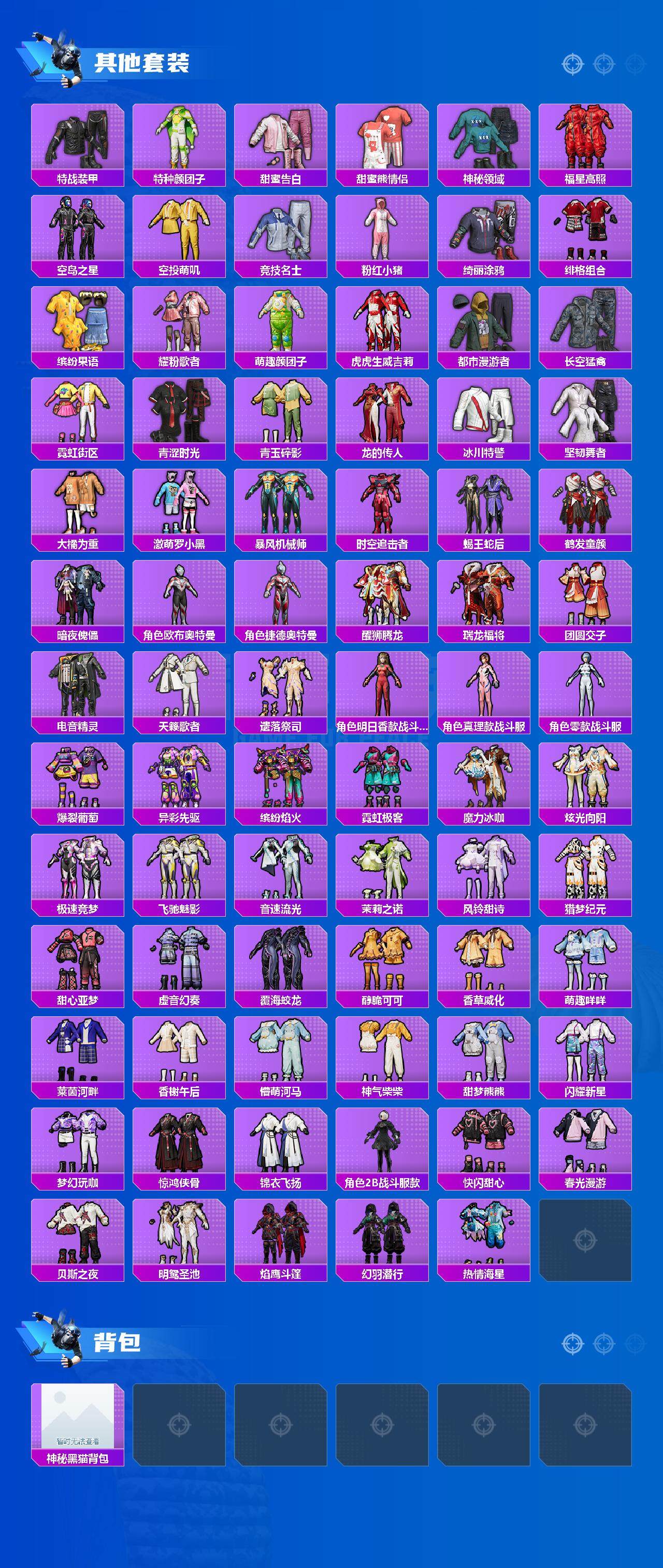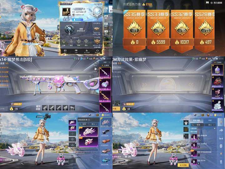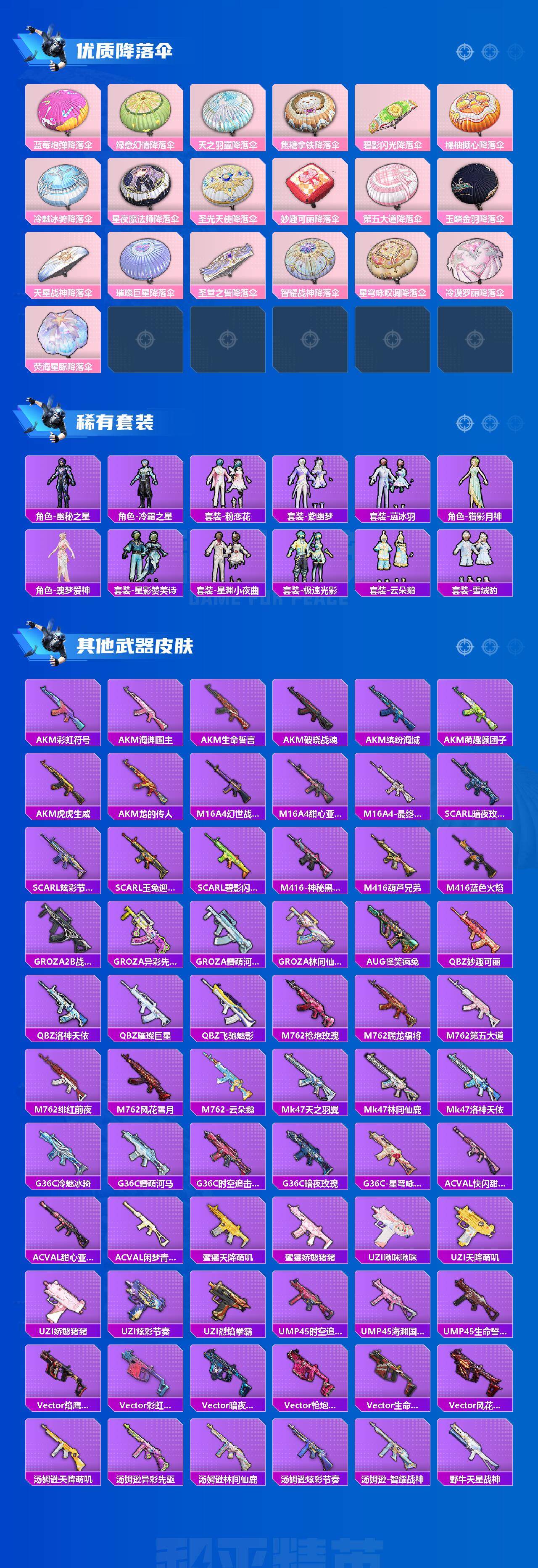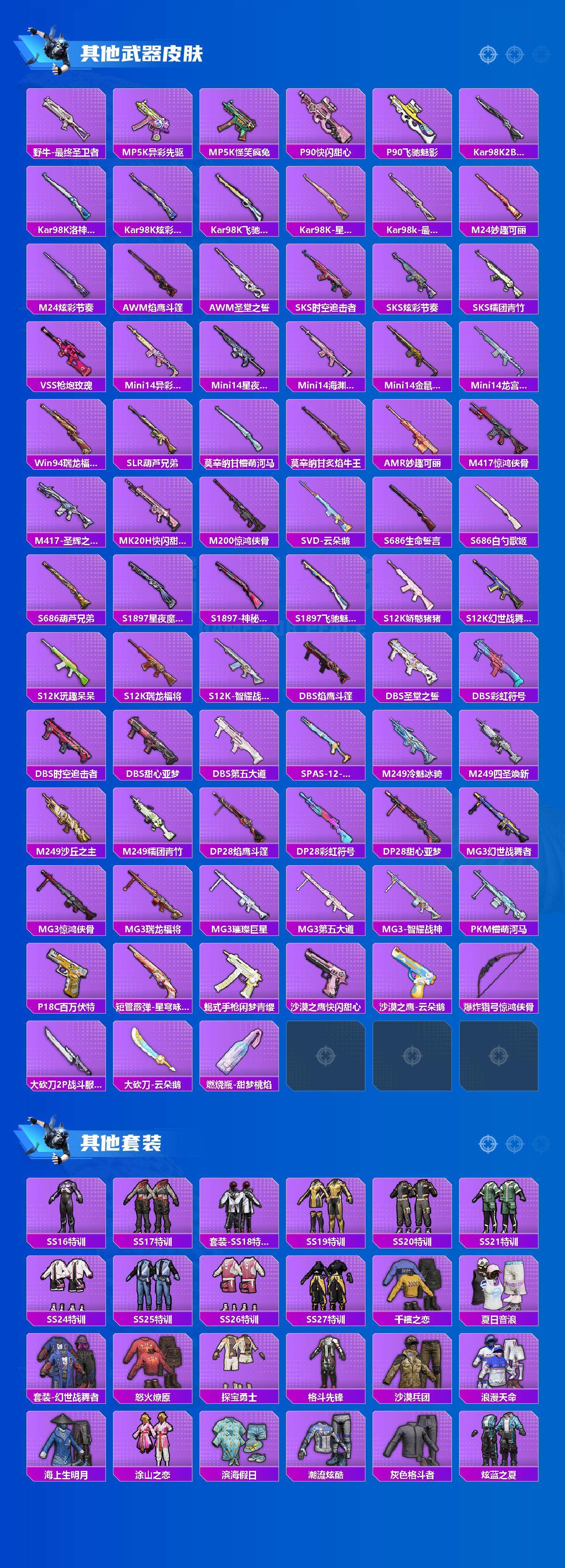 - [11657767]3粉装 6特效枪 12印记 可二次 可修改实名 身法装备:舞王派对(派对舞王、小金鞋),8号机(新粉螳螂) 优质装备:舞王派对(派对舞王、小金鞋),M416心之恋语,洛天依,AKM绿萝繁花,SCAR-L-锦绣绵绵,七级M416-心之恋语,UMP45量子极限,Kar98K-巳巳如意 热门装扮:炫光之旅,金丰海韵,梦魇先生,派对舞王(小金鞋) 稀有枪皮:DP-28-豹影疾电 五级特效枪:五级UMP45-量子极限,五级Kar98K-巳巳如意,五级DP-28-豹影疾电,五级SCAR-L-锦绣绵绵,五级AKM-绿萝繁花 紫色装扮:田园牧歌,轻风白浪,和煦暖阳,SS22特训,SS23特训,幻彩翩翩,妙红点点,娇憨猪猪,萌趣咩咩,SS21特训,绚烂繁星,SS31特训套装,六六大吉,冰川特警,霓虹热舞,旭日情侣,SS30特训套装,SS33特训套装,青涩时光,顶瓜瓜,SS20特训,SS16特训,萌趣颜团子,特种颜团子,猎梦纪元,飞驰魅影,音速流光,SS19特训,竞技角斗士,覆海蛟龙,甜心亚梦,虚音幻奏,瑞龙福将,团圆交子,SS17特训,冰川谧蓝,异彩先驱,SS18特训,都市漫游者,酒红色名流,野性战心,长空猛禽,霓虹极客,霓虹街区,缤纷果语,蓝色运动,虎虎生威吉莉,无面战甲,飞行日记,龙腾端午,骑行爱好者,鹤鸣,黄色名流,黄色运动,黎明保卫者,黑色伏地魔,龙的传人,龟仙人,冰河战士,龙魂突击队,蝶变,香桃花海,柠萌假日,沙漠兵团,活力之心,海岛探路者,滨海假日,幻影武者,幻世战舞者,探宝勇士,湖蓝色名流,滨海厨神,破晓战魂,甜蜜告白,福星高照,空岛之星,空投萌叽,红色运动,王牌教练,灰色格斗者,炫蓝之夏,热血青春,小熊娃娃,雏菊兔兔,萝兰蝴蝶,SS29特训,先驱飞行员,星途旅人,创世·幻影,纯真浪花,热情海星,曼妙人鱼,SS28特训,8号机(新粉螳螂),异域银装,鱼渊荷华,玉兔迎春,燕燕于飞,巳巳如意,风玲,青团波波,糖糖葫芦,棉花软糖,竞技名士,街头风暴,银尘,惊鸿侠骨,SS24特训(SS24特训套装),SS25特训,绝对偶像,金戈铁马,锦衣飞扬,粉红小猪,焰鹰斗篷,幻羽潜行,幽夜迷踪,SS27特训,明鸳圣池,日照花林,SS26特训,春光漫游,快闪甜心,贝斯之夜,智谋强哥,大橘大利,耀粉歌者,春日漫步,粉恋花,蓝冰羽,紫幽梦,SS32特训服(SS32特训套装),瑰梦爱神,绯格组合