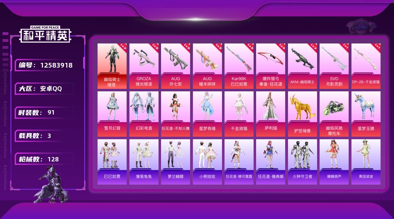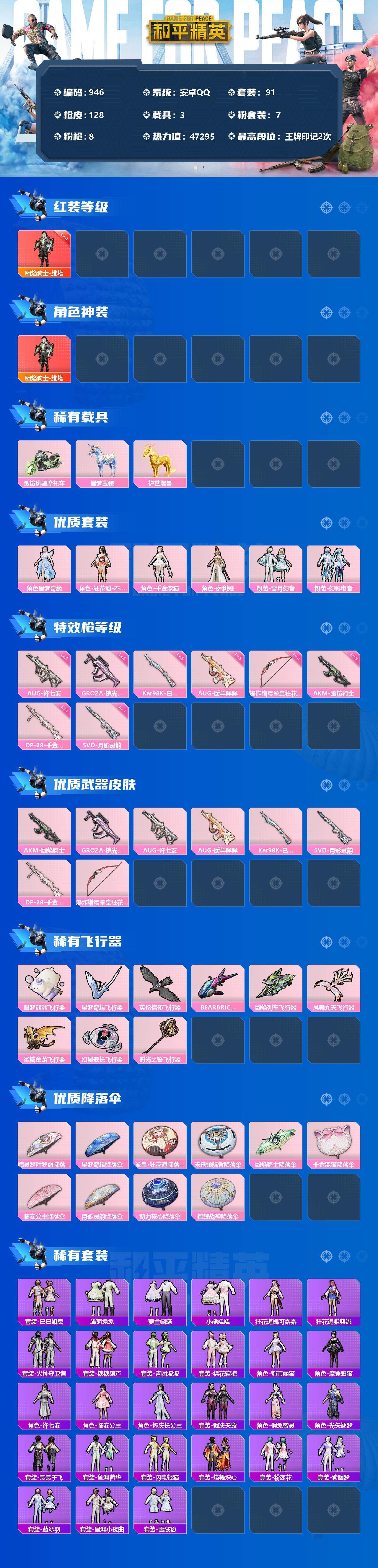 [12583918]安卓 手Q-1神装-7粉装-8特效枪-3载具-10粉色飞行器-47295热力值-2王牌印记-91套装-128枪皮 【红色神装等级】:幽焰骑士-维塔(三级) 【红色角色神装】:幽焰骑士-维塔 【粉色载具】:幽焰风驰摩托车,星梦玉骢,护世瑞兽 【粉色套装】:角色-星梦奇缘,角色-狂花道·不知火舞,角色-千金淑猫,角色-萨利娅,粉装-雪月幻音,粉装-幻彩电音 【粉色枪皮等级】:AKM-幽焰骑士(三级),GROZA-镜光银凌(五级),AUG-许七安(五级),AUG-暖羊咩咩(五级),Kar98K-巳巳如意(五级),SVD-月影灵韵(一级),DP-28-千金淑猫(一级),爆炸猎弓-拳皇·狂花道(四级) 【粉色枪皮】:AKM-幽焰骑士,GROZA-镜光银凌,AUG-许七安,AUG-暖羊咩咩,Kar98K-巳巳如意,SVD-月影灵韵,DP-28-千金淑猫,爆炸猎弓-拳皇·狂花道 【粉色飞行器】:酣梦熊熊飞行器,星梦奇缘飞行器,英伦信使飞行器,BEARBRICK飞行器,幽焰列车飞行器,凤舞九天飞行器,圣域金龙飞行器,幻星舰长飞行器,时光之誓飞行器 【粉色降落伞】:精灵梦叶罗丽降落伞,星梦奇缘降落伞,拳皇·狂花道降落伞,未来领航者降落伞,幽焰骑士降落伞,千金淑猫降落伞,临安公主降落伞,月影灵韵降落伞,动力核心降落伞,智耀战神降落伞 【稀有套装】:套装-巳巳如意,套装-雏菊兔兔,套装-萝兰蝴蝶,套装-小熊娃娃,角色-狂花道·娜可露露,角色-狂花道·雅典娜,套装-火种守卫者,套装-糖糖葫芦,套装-青团波波,套装-棉花软糖,角色-都市丽猫,角色-摩登魅猫,角色-许七安,角色-临安公主,角色-怀庆长公主,套装-裁决天象,角色-俏兔智灵,角色-光矢逐梦,套装-燕燕于飞,套装-鱼渊荷华,套装-闪电轻猫,套装-焰舞炽心,套装-粉恋花,套装-紫幽梦,套装-蓝冰羽,套装-星渊小夜曲,套装-雪绒豹 【稀有枪皮】:AKM-彩虹符号,AKM-灼热熔岩,M16A4-幻世战舞者,M16A4-千金淑猫,SCAR-L-炫彩节奏,SCAR-L-玉兔迎春,AUG-甜蜜菠萝,AUG-月影灵韵,M762-天降萌叽,M762-云朵鹅,AC-VAL-天降萌叽,AC-VAL-圣辉之星,AC-VAL-时光之吻,UZI-天降萌叽,UZI-月影灵韵,UMP45-电音之王,P90-金蛇镇世,P90-巳巳如意,M24-炫彩节奏,AWM-
