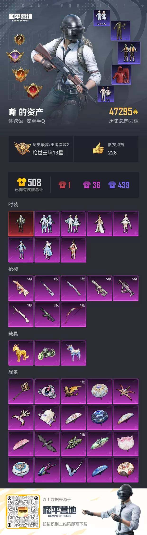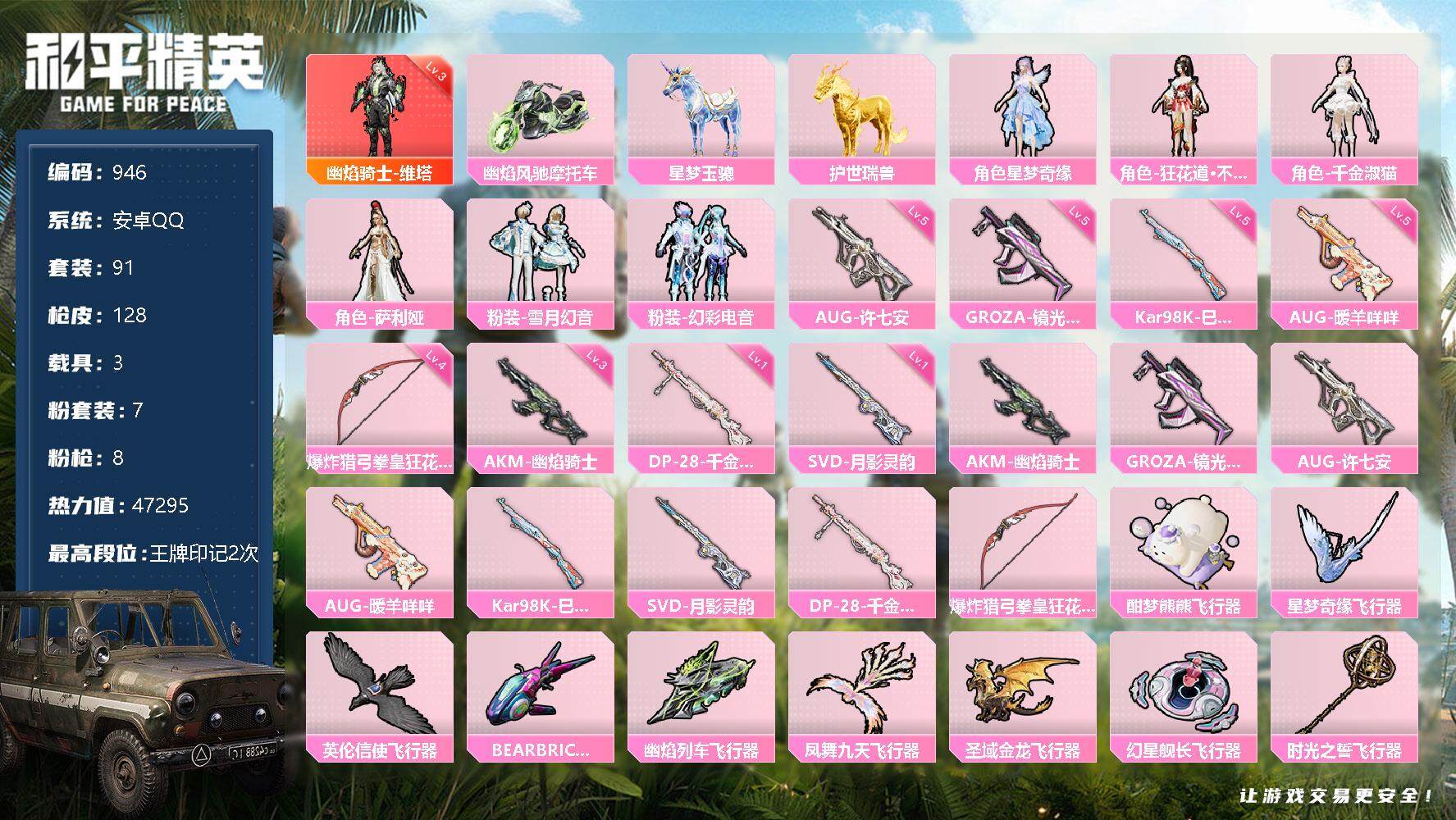 [12583918]安卓 手Q-1神装-7粉装-8特效枪-3载具-10粉色飞行器-47295热力值-2王牌印记-91套装-128枪皮