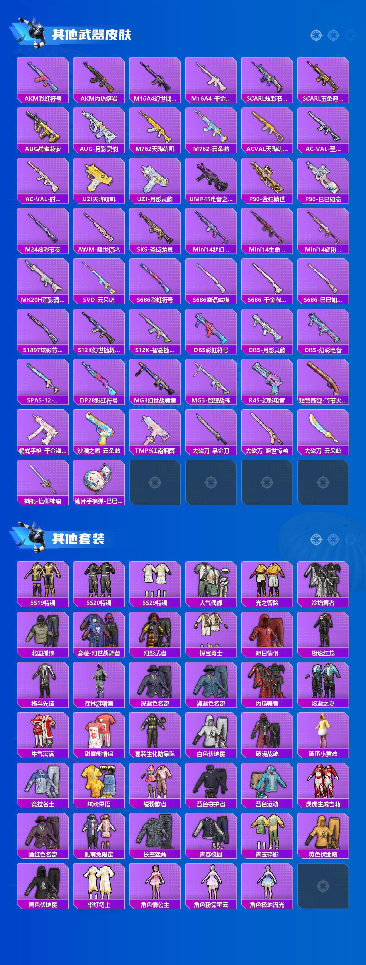 - [11606480]2粉装 3特效枪 3载具 4印记 可二次 可修改实名 优质装备:阿斯顿·马丁DBS(绿),阿斯顿·马丁DBX(蓝),合金龙骨(绿),梦幻火箭(新101)(新火箭少女101粉色套装),M762-青锋波束,未来领航者,DP-28-千金淑猫,GROZA-镜光银凌 热门装扮:大橘为重,迅捷狂鲨,呆萌铁蟹 六级特效枪:六级DP-28-千金淑猫 五级特效枪:五级M762-青锋波束 四级特效枪:四级GROZA-镜光银凌 紫色装扮:田园牧歌,轻风白浪,和煦暖阳,SS22特训,SS23特训,娇憨猪猪,萌趣咩咩,SS21特训,SS30特训套装,SS20特训,潮流游乐家,SS15特训,银白舞王,SS13特训,诡谋托雷基亚,星梦畅游,治愈之星,科技之星,SS14特训,甜心亚梦,虚音幻奏,长空猛禽,青春校园,迎春赐吉,蓝色运动,飞行日记,魅力单车,麻辣教官,黄色运动,黑色伏地魔,香桃花海,海岛探路者,幻世战舞者,湖蓝色名流,破蛋小黄鸡,甜蜜告白,空岛之星,牛气冲天,灰色格斗者,牛气满满,猛禽,特战装甲,镭射皇者,静谧青瓷,小熊娃娃,雏菊兔兔,萝兰蝴蝶,SS29特训,先驱飞行员,星途旅人,SS28特训,卖崽青蛙,火种守护者(套装-火种守卫者),玉兔迎春,青团波波,糖糖葫芦,竞技名士,SS27特训,无暇誓言,原初圣火,逆风勇士,SS12特训,耀粉歌者,绯格组合,萌黄之夏,漫步者,蓝调潮人,光之冒险 优质战备:精灵梦叶罗丽降落伞,拳皇·狂花道降落伞,未来领航者降落伞,深渊漩涡飞行器,宇宙意志降落伞,梦幻火箭降落伞,梦幻火箭飞行器,四圣焕新降落伞,心之恋语降落伞,银刃赛罗降落伞,绮梦青鸾降落伞,洛神天依降落伞