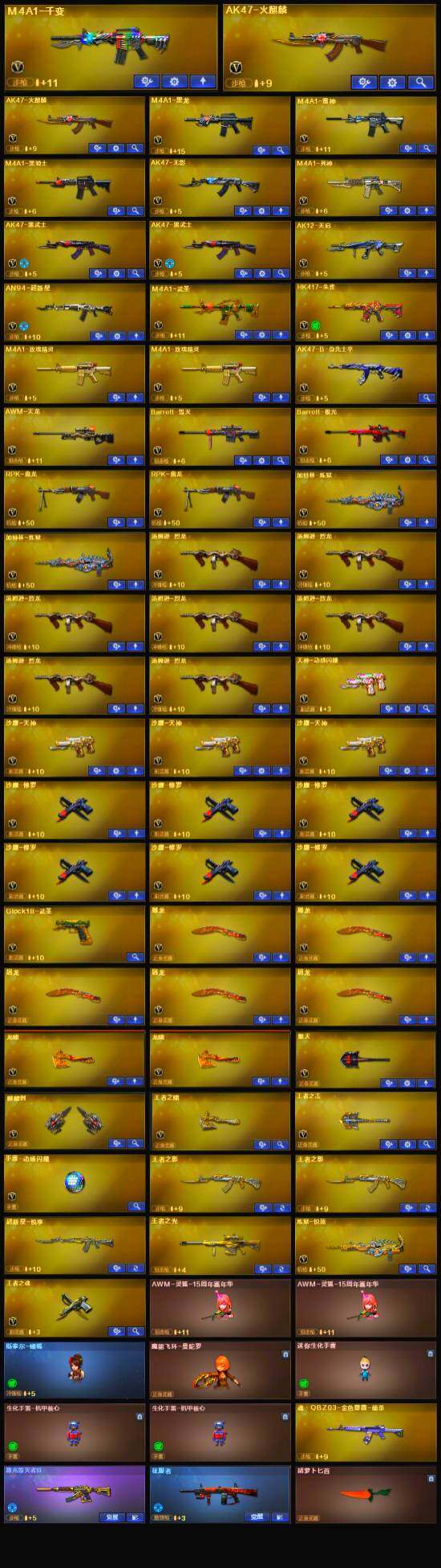 - [12836369]江苏一区-22V-9王者-1炫金 【热门武器】:Scar Light-白虎,QBZ-03-王者蔷薇,M200-竞技荣光,Cat-刀锋,M4A1-黑骑士,加特林-炼狱,裁决-雪莉杨,沙鹰-修罗*3 【王者炫金武器】:炫金火麒麟,QBZ-03-王者蔷薇,王者之魂*2 【音效卡】:M4A1-黑骑士音效卡,Scar Light-白虎音效卡 【稀有皮肤】:雷神-能量核心,火麒麟-平天大圣,火麒麟-盘古,火麒麟-百城,黑龙-墨子皮肤,毁灭耀金皮肤,毁灭-风暴,修罗-冠军之魂 【角色】:王者-瞳-闭月羞花,零-水下丽影,电竞教官-云悠悠,蜀雪 【人偶武器】:裁决-雪莉杨,天龙-曼陀罗,AWM-灵狐-15周年嘉年华,Cat-刀锋,迷你深渊冰龙*2,迷你艾比,迷你裂空之翼,夺魂*2,迷你牛牛,深渊终结者手雷 【挑战大师】:神圣爆裂者-末日III,阐释者III,试炼破坏者III,激光毁灭者III,激光毁灭者III-白马银枪,冰龙粉碎者-白马银枪*2 【英雄级武器】:M200-竞技荣光,柯尔特-竞技荣光,擎天-竞技荣光*2,高爆手雷-竞技荣光*3,烟雾弹-竞技荣光*2,闪光弹-竞技荣光*3,Scar Light-白虎,M4A1-雷神,M4A1-黑骑士,加特林-炼狱,AK47-火麒麟,Barrett-毁灭,沙鹰-修罗*3 【特殊枪械】:1白虎,1黑骑士,1炼狱