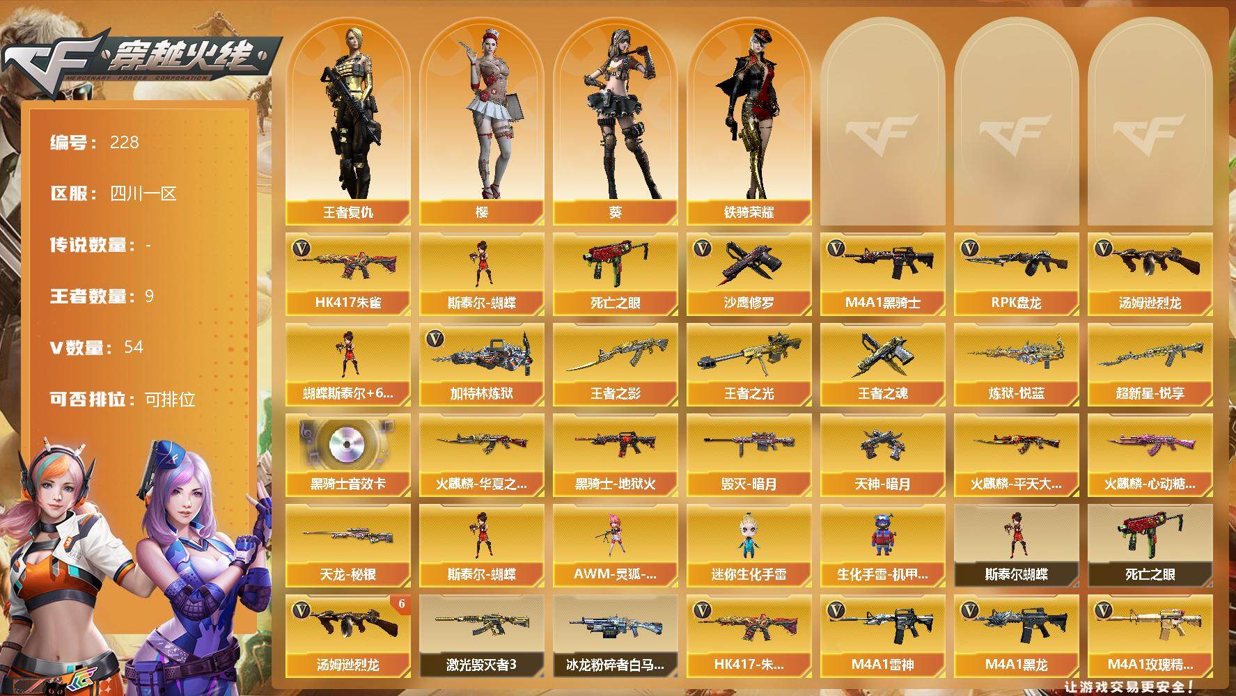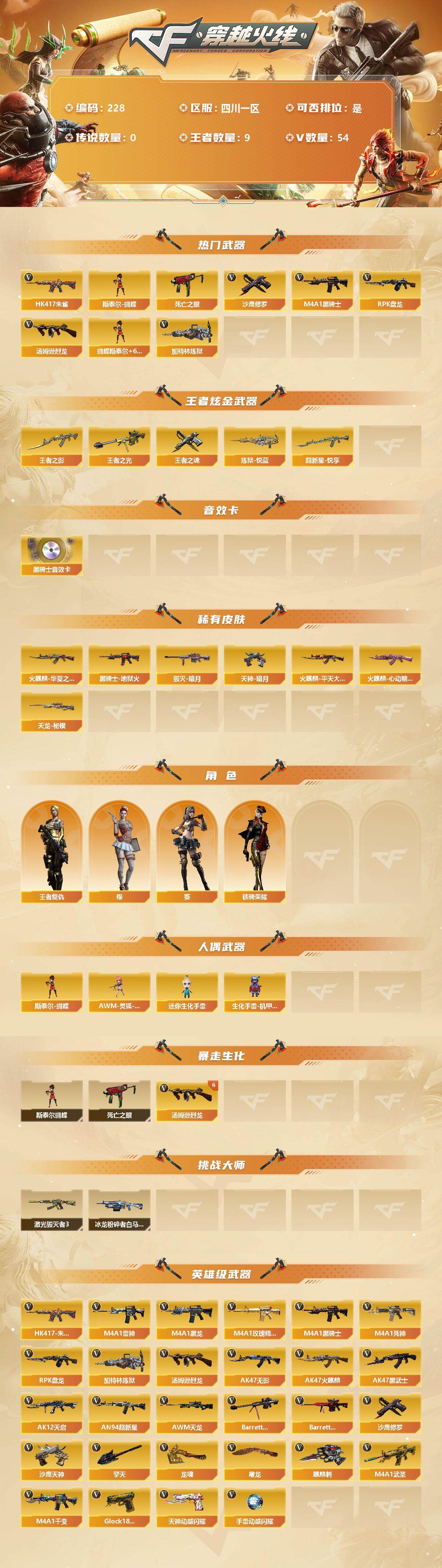 [12584415]【228】52V/102级/荣耀元首/9王者/2英雄/HK417-朱雀/死亡之眼/M4A1-黑骑士/汤姆逊-烈龙/RPK-盘龙/加特林-炼狱/斯泰尔蝴蝶/沙鹰-修罗/蝴蝶斯泰尔+6烈龙/炼狱-悦蓝/超新星-悦享/王者之光/王者之影/王者之魂/M4A1-黑骑士音效卡/火麒麟-华夏之心/火麒麟-平天大圣/火麒麟-心动糖果/黑骑士-地狱火/毁灭-暗月/天龙-秘银/天神-暗月/王者复仇/葵/樱/铁骑荣耀/AWM-灵狐-15周年嘉年华/迷你生化手雷/生化手雷-机甲核心/6烈龙/激光毁灭者/冰龙粉碎者-白马银枪/M4A1-武圣/Glock18-武圣/天神-动感闪耀/手雷-动感闪耀/M4A1-雷神/M4A1-黑龙/M4A1-玫瑰精灵/M4A1-死神/AK47-无影/AK47-火麒麟/AK47-黑武士/AK12-天启/AN94-超新星/AWM-天龙/Barrett-毁灭/Barrett-极光/M4A1-千变/沙鹰-天神/麒麟刺/擎天/龙啸/屠龙