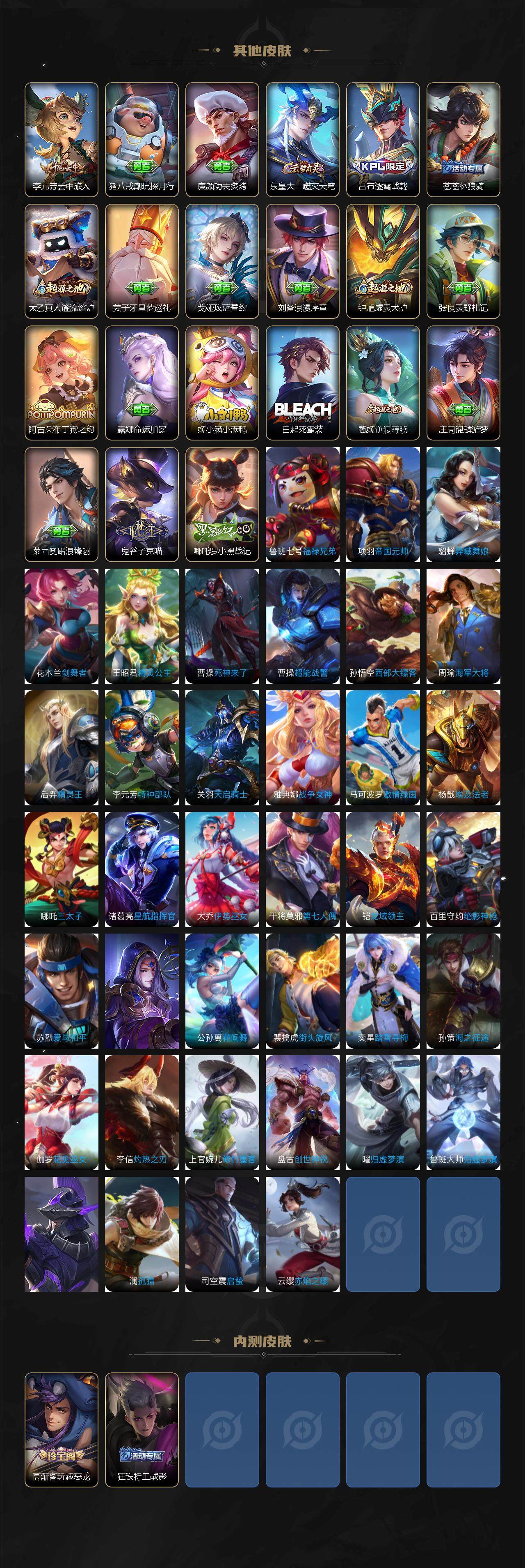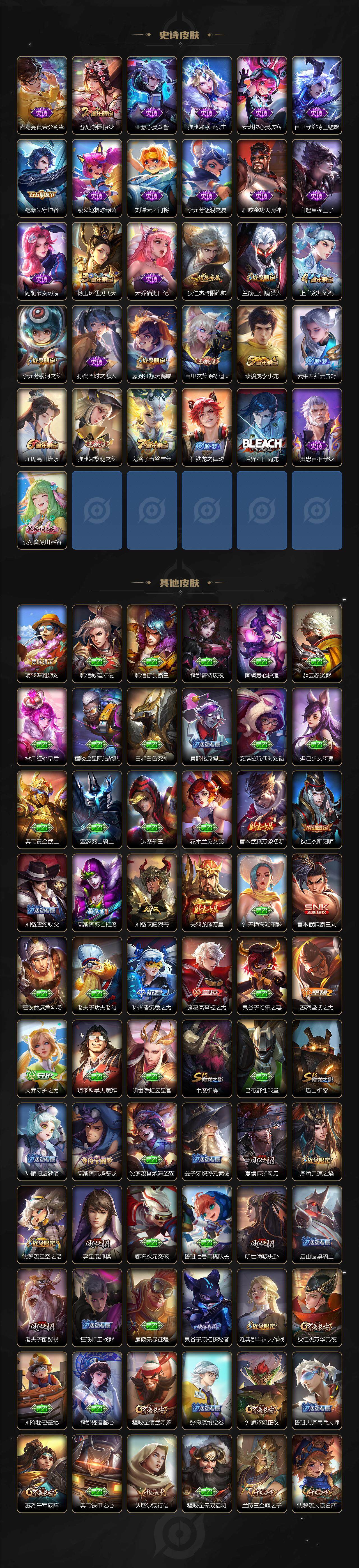 【史诗皮肤】:鲁班七号电玩小子,赵云皇家上将,貂蝉圣诞恋歌,甄姬冰雪圆舞曲,王昭君偶像歌手,狄仁杰魔术师,宫本武藏鬼剑武藏,孙尚香水果甜心,墨子金属风暴,吕布圣诞狂欢,曹操幽灵船长,吕布末日机甲,孙悟空至尊宝,花木兰水晶猎龙者,刘邦德古拉伯爵,夏侯惇乘风破浪,小乔缤纷独角兽,兰陵王暗隐猎兽者,诸葛亮黄金分割率,甄姬游园惊梦,亚瑟心灵战警,雅典娜冰冠公主,安琪拉心灵骇客,百里守约特工魅影,铠曙光守护者,蔡文姬舞动绿茵,刘禅天才门将,李元芳逐浪之夏,程咬金功夫厨神,白起星夜王子,阿轲节奏热浪,杨玉环遇见飞天,大乔猫狗日记,狄仁杰鹰眼统帅,兰陵王驯魔猎人,上官婉儿梁祝,李元芳银河之约,孙尚香时之恋人,蒙犽狂想玩偶喵,百里玄策原初追逐者,裴擒虎李小龙,云中君纤云弄巧,庄周高山流水,雅典娜黎明之约,鬼谷子五谷丰年,狂铁龙之律动,后羿石田雨龙,黄忠百相守梦,公孙离涂山容容