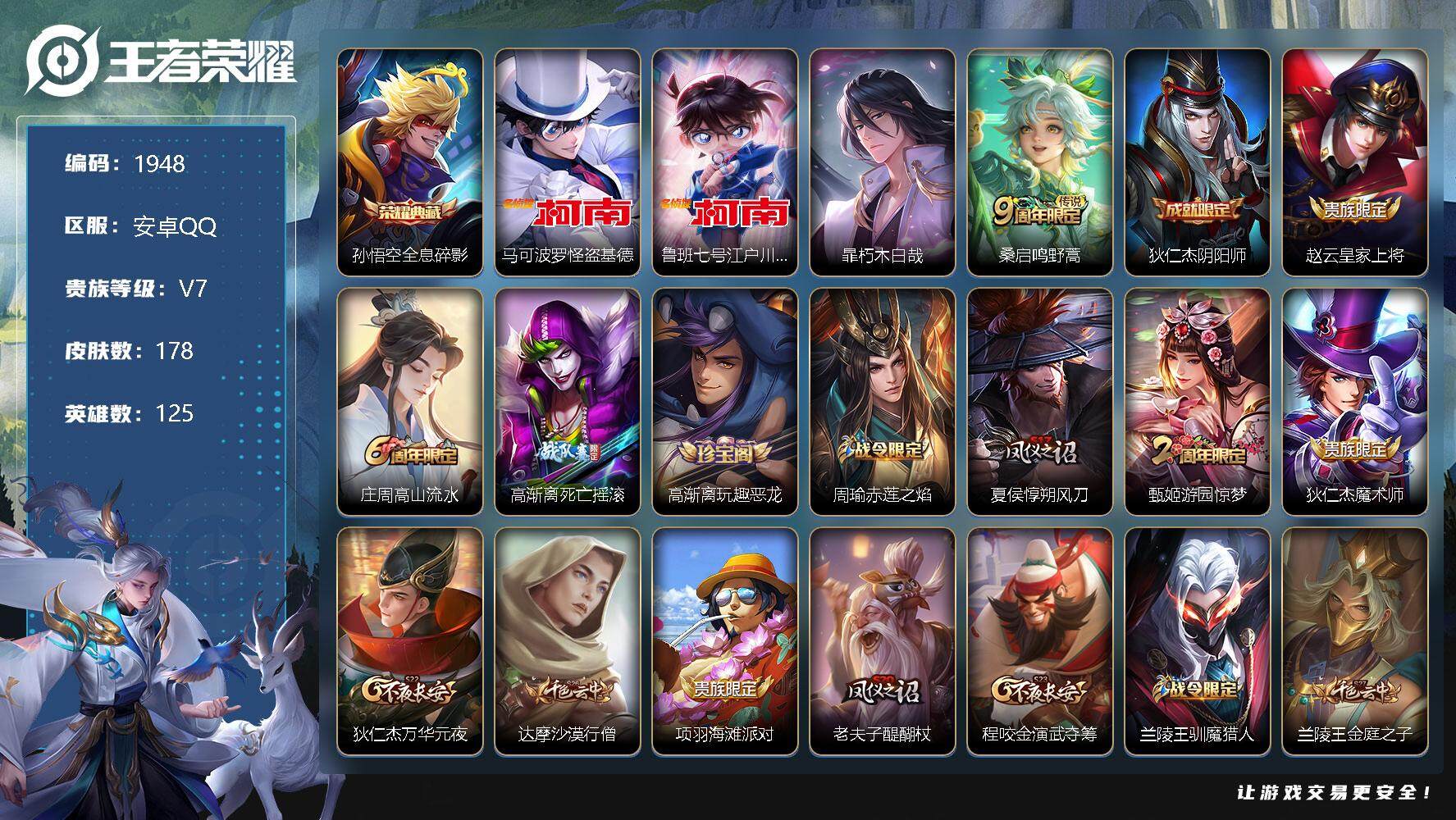 [12584520]安卓Q-V7-至尊星耀III段位-125英雄-178皮肤-1典藏-0珍品无双-0无双-3珍品传说-1传说-49史诗 【荣耀典藏】:孙悟空全息碎影 【珍品传说】:马可波罗怪盗基德,鲁班七号江户川柯南,暃朽木白哉 【传说皮肤】:桑启鸣野蒿 【限定皮肤】:狄仁杰阴阳师,赵云皇家上将,庄周高山流水,高渐离死亡摇滚,高渐离玩趣恶龙,周瑜赤莲之焰,夏侯惇朔风刀,甄姬游园惊梦,狄仁杰魔术师,狄仁杰万华元夜,达摩沙漠行僧,项羽海滩派对,老夫子醍醐杖,程咬金演武夺筹,兰陵王驯魔猎人,兰陵王金庭之子,孙悟空至尊宝,牛魔御旌,李元芳银河之约,李元芳云中旅人,钟馗驱傩正仪,杨玉环遇见飞天,雅典娜单词大作战,雅典娜黎明之约,鬼谷子原初探秘者,鬼谷子五谷丰年,苏烈千军破阵,百里玄策原初追逐者,弈星混沌棋,沈梦溪星空之诺,沈梦溪大漠名商,明世隐疑决卦,裴擒虎李小龙,云中君纤云弄巧,盾山御銮,上官婉儿梁祝,蒙犽狂想玩偶喵 【赛季限定】:夏侯惇朔风刀,狄仁杰万华元夜,达摩沙漠行僧,老夫子醍醐杖,程咬金演武夺筹,兰陵王金庭之子,牛魔御旌,李元芳云中旅人,钟馗驱傩正仪,雅典娜黎明之约,鬼谷子原初探秘者,苏烈千军破阵,百里玄策原初追逐者,弈星混沌棋,沈梦溪大漠名商,明世隐疑决卦,盾山御銮 【战令限定】:周瑜赤莲之焰,兰陵王驯魔猎人,李元芳银河之约,雅典娜单词大作战,沈梦溪星空之诺,蒙犽狂想玩偶喵 【史诗皮肤】:鲁班七号电玩小子,赵云皇家上将,貂蝉圣诞恋歌,甄姬冰雪圆舞曲,王昭君偶像歌手,狄仁杰魔术师,宫本武藏鬼剑武藏,孙尚香水果甜心,墨子金属风暴,吕布圣诞狂欢,曹操幽灵船长,吕布末日机甲,孙悟空至尊宝,花木兰水晶猎龙者,刘邦德古拉伯爵,夏侯惇乘风破浪,小乔缤纷独角兽,兰陵王暗隐猎兽者,诸葛亮黄金分割率,甄姬游园惊梦,亚瑟心灵战警,雅典娜冰冠公主,安琪拉心灵骇客,百里守约特工魅影,铠曙光守护者,蔡文姬舞动绿茵,刘禅天才门将,李元芳逐浪之夏,程咬金功夫厨神,白起星夜王子,阿轲节奏热浪,杨玉环遇见飞天,大乔猫狗日记,狄仁杰鹰眼统帅,兰陵王驯魔猎人,上官婉儿梁祝,李元芳银河之约,孙尚香时之恋人,蒙犽狂想玩偶喵,百里玄策原初追逐者,裴擒虎李小龙,云中君纤云弄巧,庄周高山流水,雅典娜黎明之约,鬼谷子五谷丰年,狂铁龙之律动,后羿石田雨龙,黄忠百相守梦,公孙离涂山容容 【其他皮肤】:项羽海滩派对,韩信教廷特使,韩信街头
