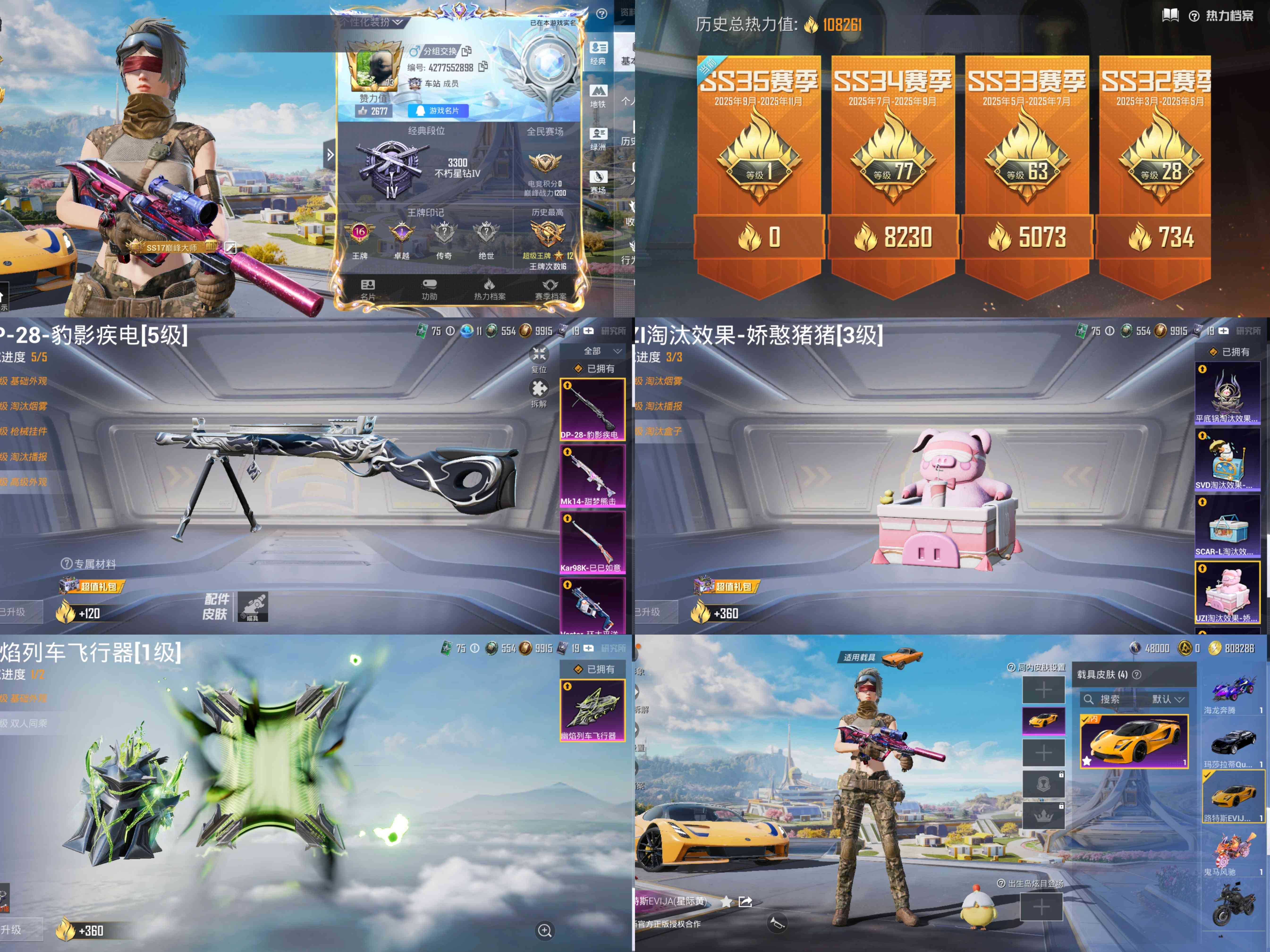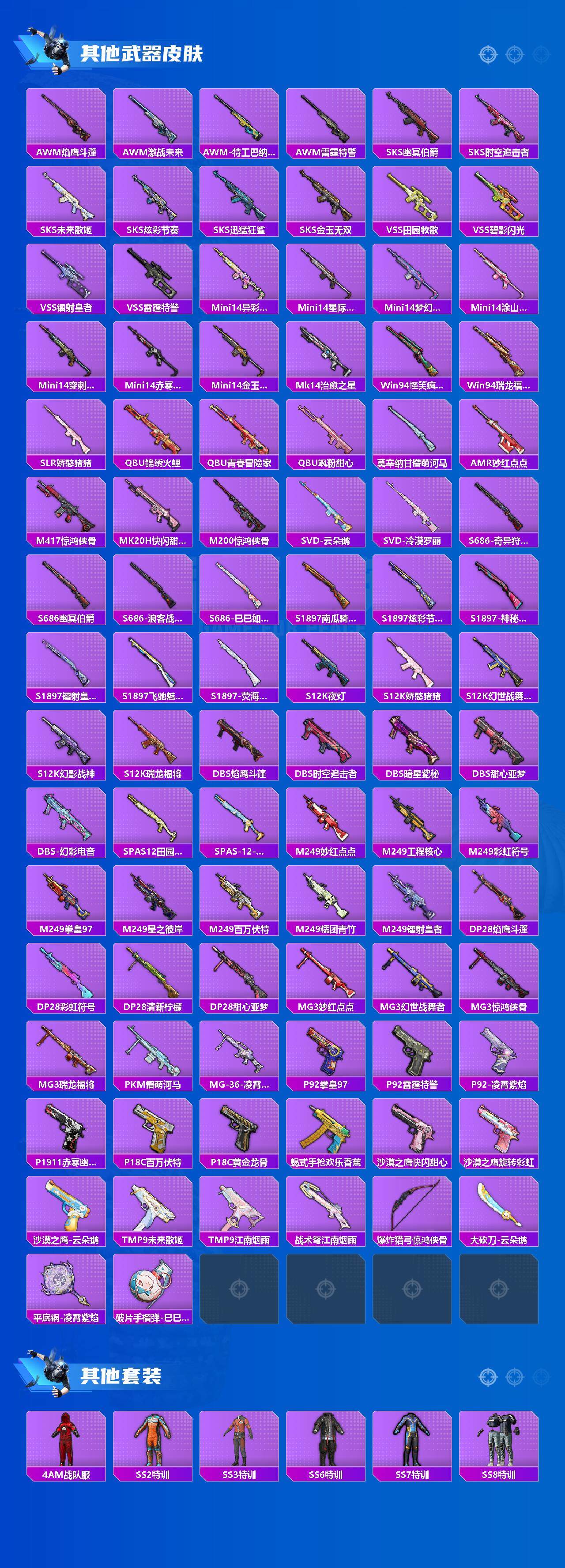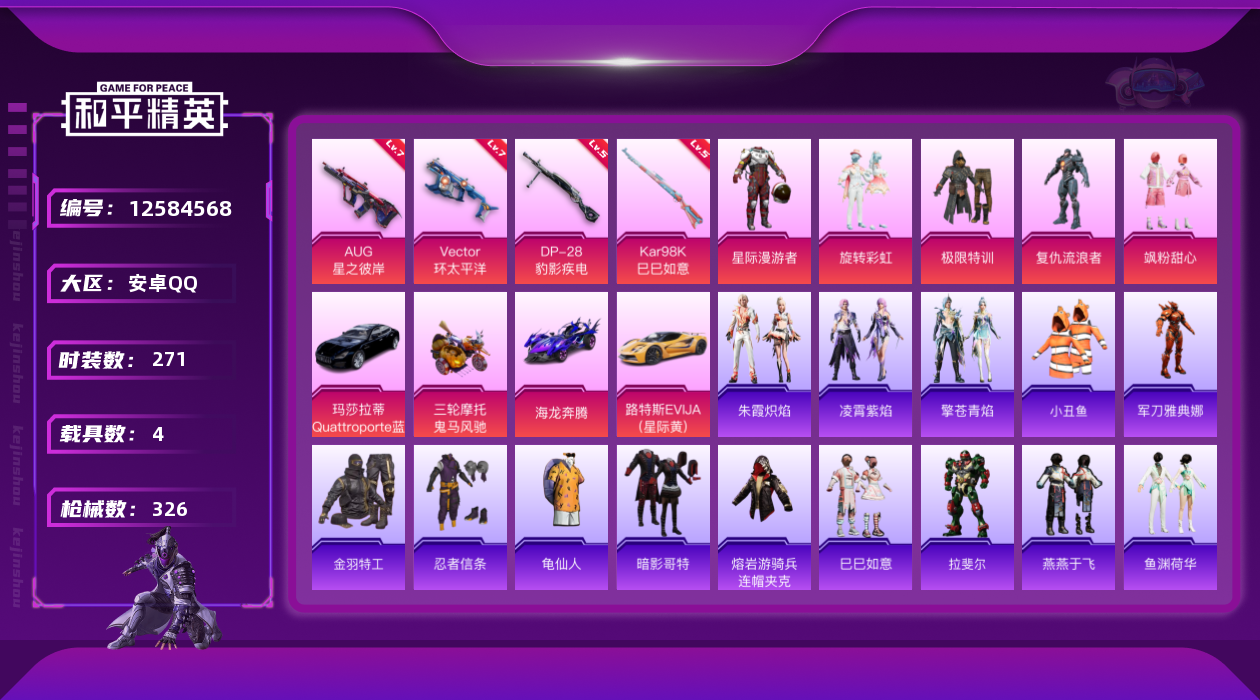 [12584568]安卓 手Q-5粉装-5特效枪-4载具-5粉色飞行器-108261热力值-16王牌印记-271套装-326枪皮 【热门品类】:套装-赤蝎幽灵,套装-都市猎人,套装-小丑鱼,套装-奇异狩猎者,角色-军刀雅典娜,套装-金羽特工,套装-忍者信条,套装-龟仙人,套装-暗影哥特,套装-浪漫波比,小恶魔头饰,熔岩游骑兵面罩,熔岩游骑兵连帽夹克 【粉色载具】:路特斯EVIJA(星际黄),玛莎拉蒂Quattroporte(夜幕蓝),海龙奔腾,鬼马风驰 【粉色套装】:粉装-极限特训,粉装-星际漫游者,角色-复仇流浪者,粉装-旋转彩虹,粉装-飒粉甜心 【粉色枪皮等级】:AUG-星之彼岸(七级),Vector-环太平洋(七级),Kar98K-巳巳如意(五级),Mk14-甜梦熊击(五级),DP-28-豹影疾电(五级) 【粉色枪皮】:AUG-星之彼岸,Vector-环太平洋,Kar98K-巳巳如意,Mk14-甜梦熊击,DP-28-豹影疾电 【粉色飞行器】:星之彼岸飞行器,闪光银龙飞行器,太空嘟嘟飞行器,镜域双华-灵镜之阶,幽焰列车飞行器 【粉色降落伞】:极限特训降落伞,快乐主宰降落伞,星际漫游者降落伞,春暖花开降落伞,香水柠檬降落伞,机甲封神降落伞,暗夜玫瑰降落伞,碧影闪光降落伞,恐龙拽拽降落伞,环太平洋降落伞,青空秋雨降落伞,暗夜鎏金降落伞,黄族统领降落伞,未来歌姬降落伞,圣堂之誓降落伞,夜幕颂歌降落伞,临安公主降落伞 【稀有套装】:套装-龟仙人,套装-巳巳如意,角色-拉斐尔,套装-燕燕于飞,套装-鱼渊荷华,角色-海琴烟,角色-青瓷战姬,套装-彩虹兔,套装-云朵鹅,套装-雪绒豹,套装-诡诞巡游,套装-混沌火种,套装-蓝海鲸歌,套装-朱霞炽焰,套装-凌霄紫焰,套装-擎苍青焰 【稀有枪皮】:AKM-冰凉西瓜,AKM-夜灯,AKM-奇异狩猎者,AKM-彩虹符号,AKM-影袭,AKM-恐龙拽拽,AKM-星之彼岸,AKM-环太平洋,AKM-破晓战魂,AKM-虎虎生威,AKM-霓虹街区,AKM-龙的传人,M16A4-幻世战舞者,M16A4-快乐主宰,M16A4-甜心亚梦,M16A4-蓝色火焰,SCAR-L-夜灯,SCAR-L-炫彩节奏,SCAR-L-玉兔迎春,SCAR-L-雷霆特警,SCAR-L-黄金龙骨,M416-南瓜骑士,M416-糯团青竹,M416-红色方程式,M416-蓝色火焰,GROZA-异