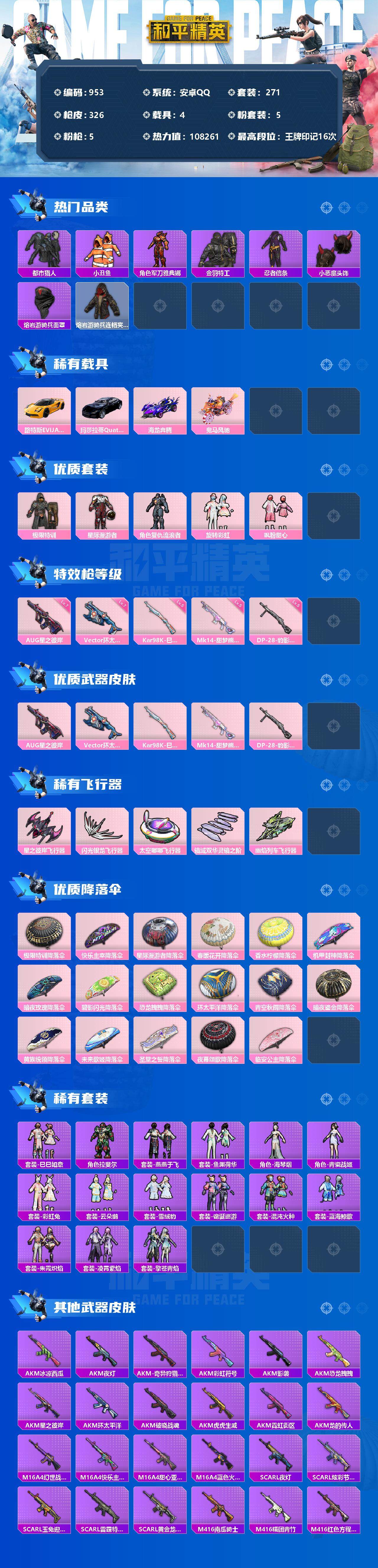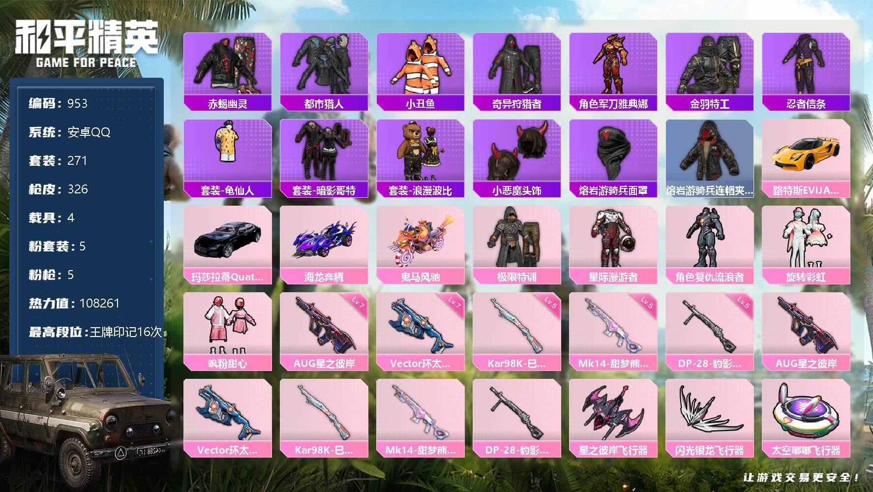 [12584568]安卓 手Q-5粉装-5特效枪-4载具-5粉色飞行器-108261热力值-16王牌印记-271套装-326枪皮