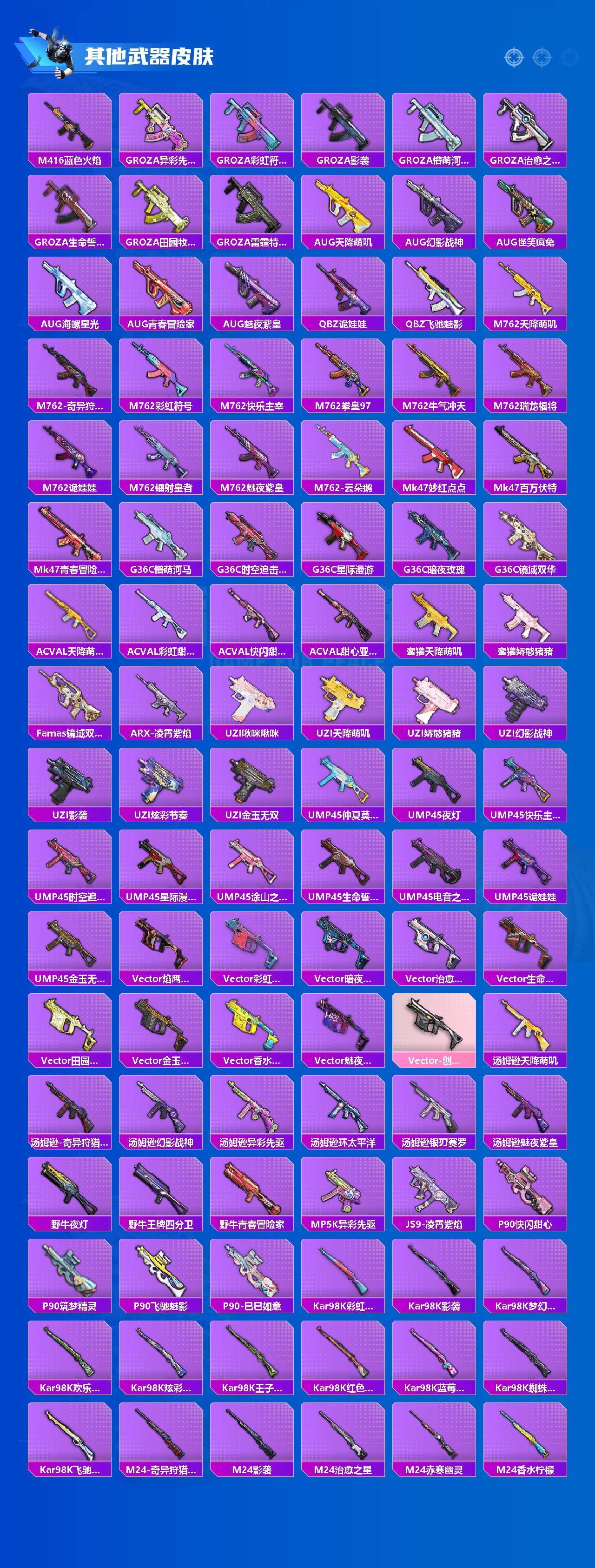 【粉色枪皮】:AUG-星之彼岸,Vector-环太平洋,Kar98K-巳巳如意,Mk14-甜梦熊击,DP-28-豹影疾电