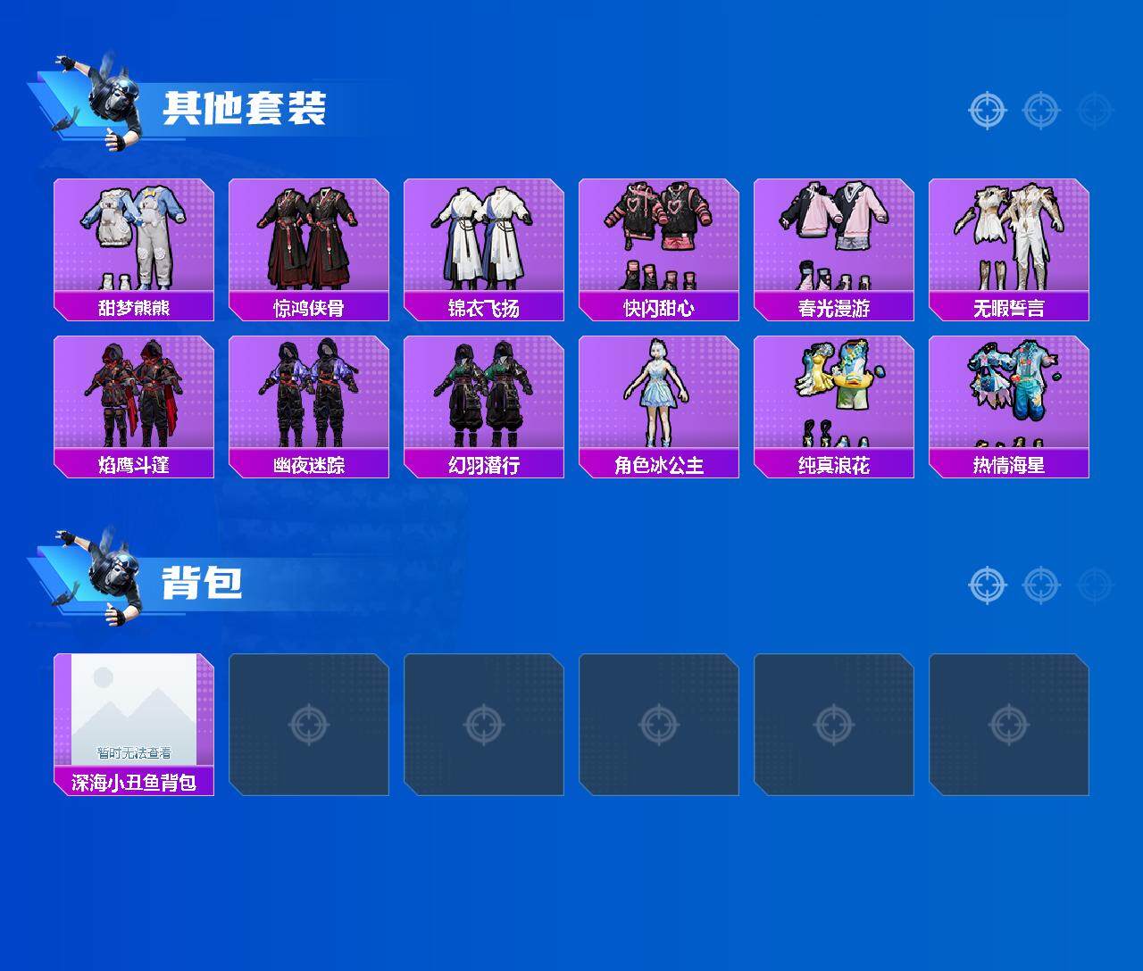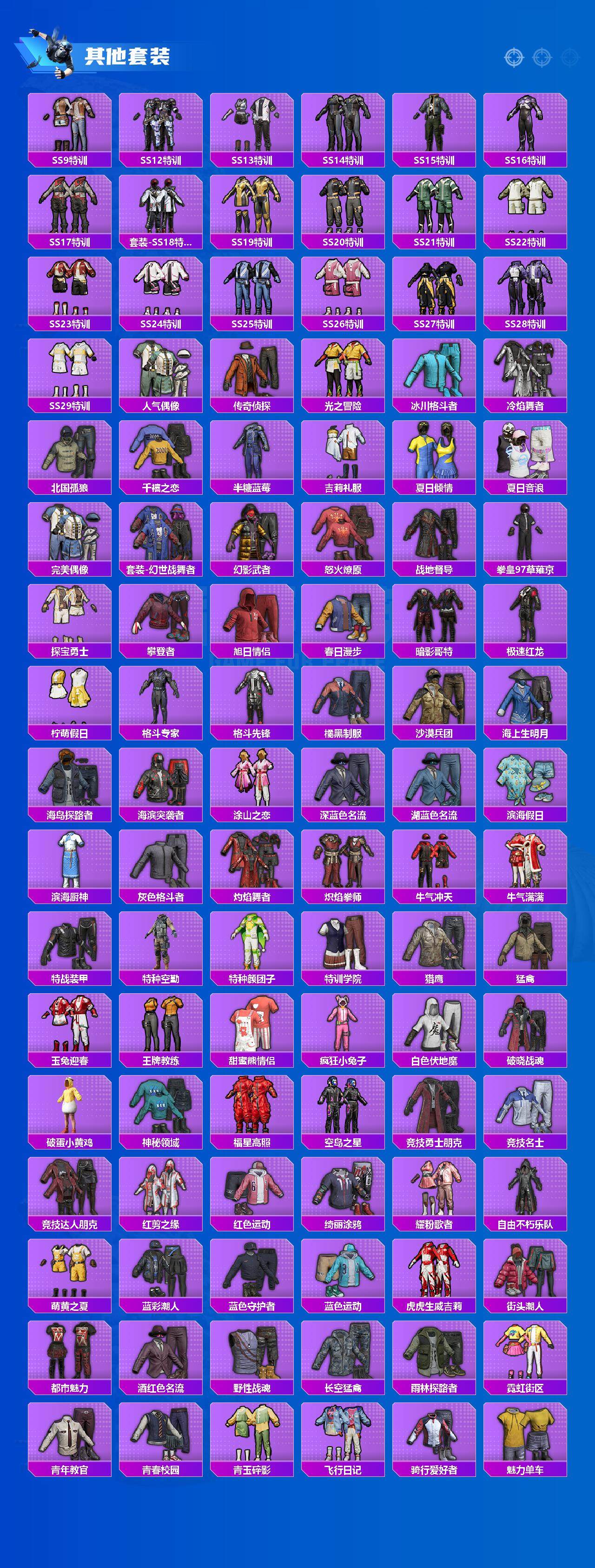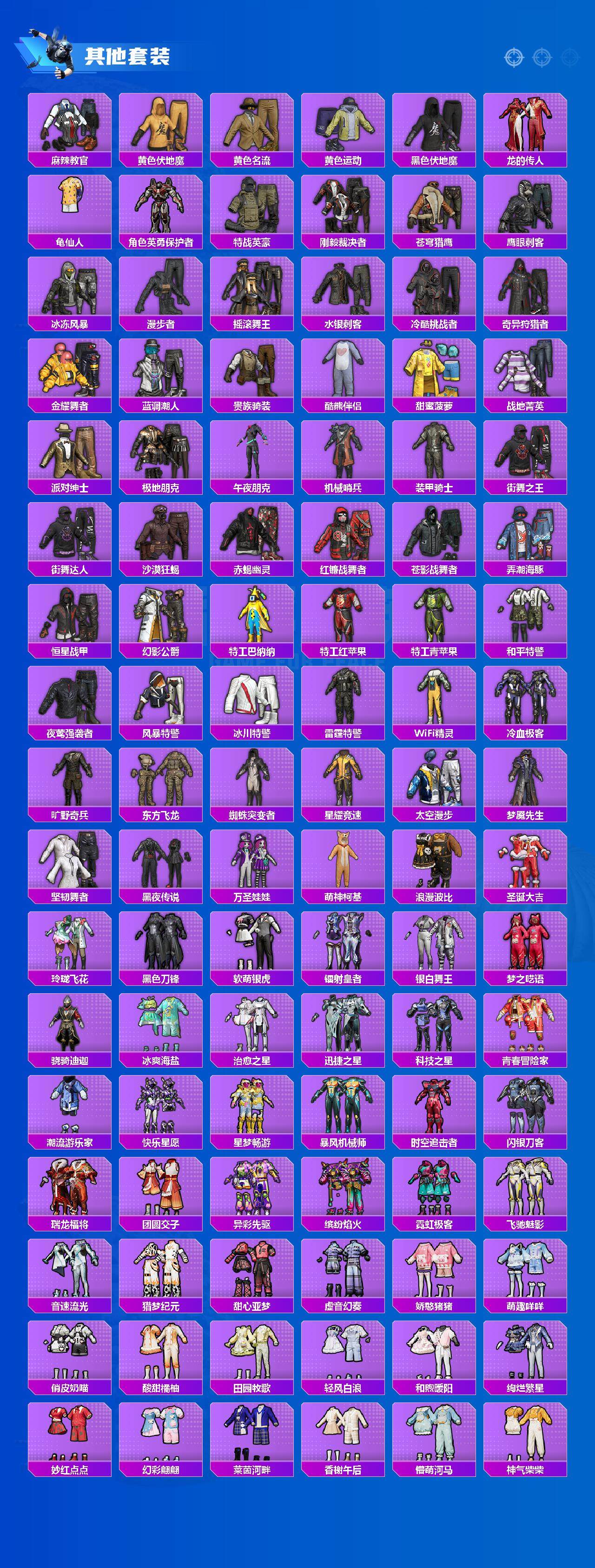 角色-军刀雅典娜,套装-金羽特工,忍者信条套装,套装-龟仙人,套装-暗影哥特,套装-极速红龙,套装-破蛋小黄鸡,角色-英勇保护者,套装-漫步者,套装-水银刺客,套装-弄潮海豚,套装-特工巴纳纳,套装-黑色刀锋,套装-梦之呓语,套装-冰爽海盐,套装-瑞龙福将,套装-团圆交子