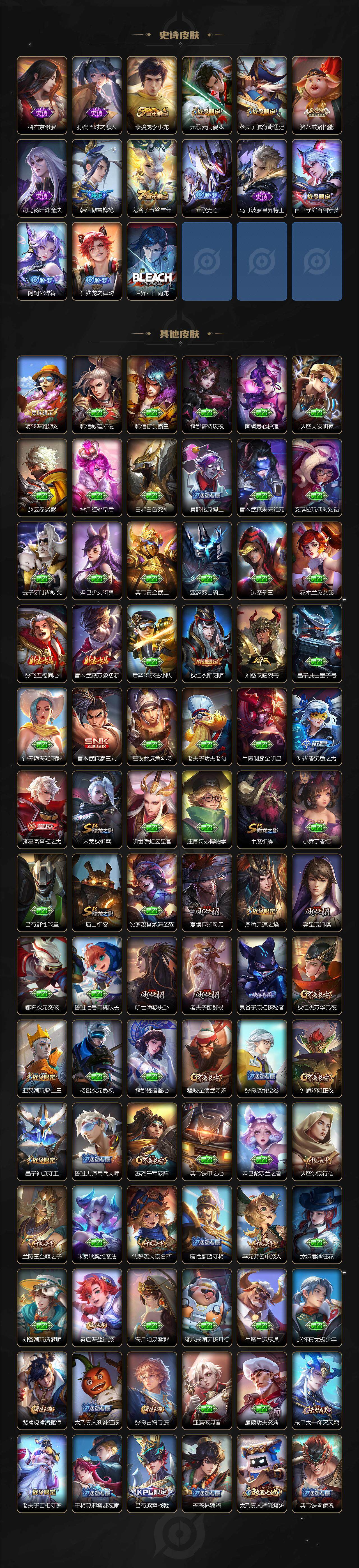 【史诗皮肤】:项羽苍穹之光,赵云皇家上将,赵云未来纪元,王昭君偶像歌手,狄仁杰魔术师,宫本武藏鬼剑武藏,孙尚香蔷薇恋人,孙尚香水果甜心,妲己魅力维加斯,吕布圣诞狂欢,刘禅绅士熊喵,曹操幽灵船长,李白千年之狐,韩信白龙吟,孙悟空至尊宝,花木兰水晶猎龙者,小乔缤纷独角兽,兰陵王暗隐猎兽者,诸葛亮黄金分割率,亚瑟心灵战警,百里守约特工魅影,铠曙光守护者,李元芳逐浪之夏,白起星夜王子,孙策猫狗日记,伽罗箭羽风息,狄仁杰鹰眼统帅,兰陵王驯魔猎人,上官婉儿梁祝,蔡文姬繁星吟游,橘右京修罗,孙尚香时之恋人,裴擒虎李小龙,元歌云间偶戏,老夫子航海奇遇记,猪八戒猪悟能,司马懿暗渊魔法,韩信傲雪梅枪,鬼谷子五谷丰年,元歌无心,马可波罗星界特工,百里守约百相守梦,阿轲化蝶舞,狂铁龙之律动,后羿石田雨龙