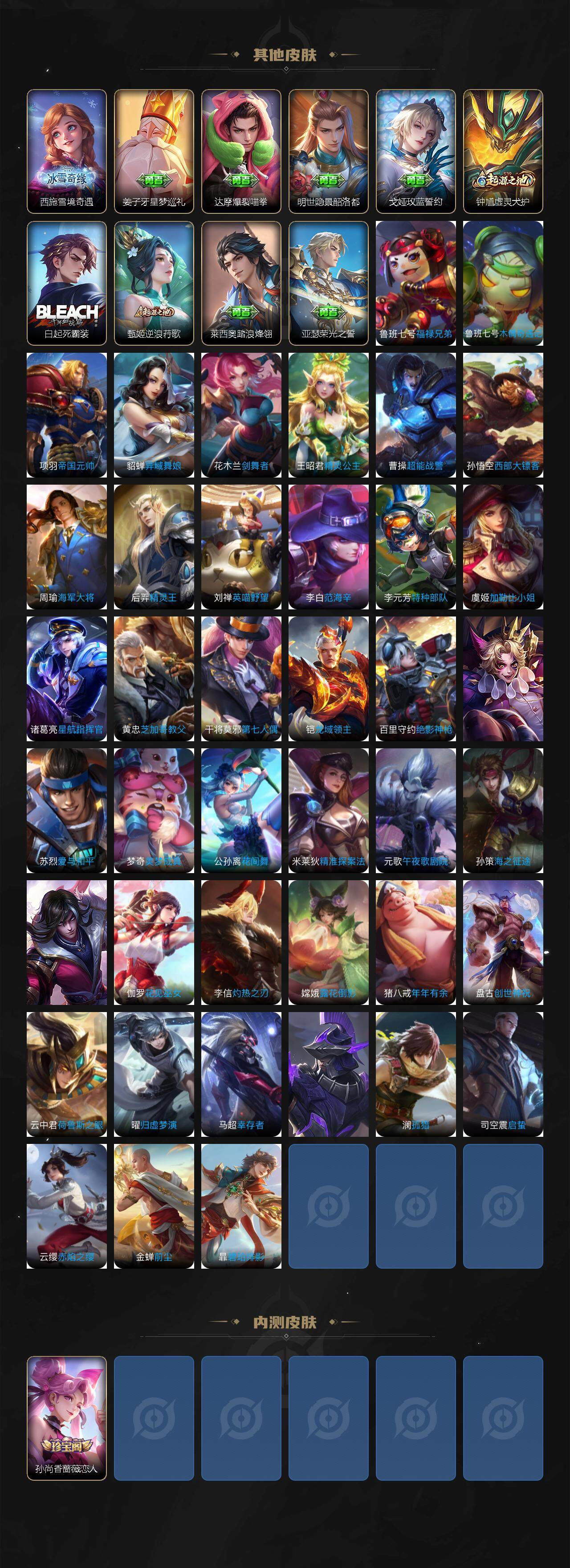 【限定皮肤】:狄仁杰阴阳师,赵云皇家上将,墨子神迹守卫,孙尚香蔷薇恋人,周瑜赤莲之焰,元歌云间偶戏,元歌无心,夏侯惇朔风刀,狄仁杰魔术师,狄仁杰万华元夜,达摩沙漠行僧,项羽海滩派对,老夫子醍醐杖,老夫子航海奇遇记,程咬金演武夺筹,韩信傲雪梅枪,兰陵王驯魔猎人,兰陵王金庭之子,亚瑟潮玩骑士王,孙悟空至尊宝,牛魔御旌,李元芳云中旅人,钟馗驱傩正仪,蔡文姬繁星吟游,鬼谷子原初探秘者,鬼谷子五谷丰年,苏烈千军破阵,弈星混沌棋,沈梦溪大漠名商,明世隐疑决卦,裴擒虎李小龙,裴擒虎擒涛扼浪,米莱狄御霄,盾山御銮,猪八戒猪悟能,上官婉儿梁祝,桑启海盐诗旅,夏洛特浮生妄,张良古海寻踪
