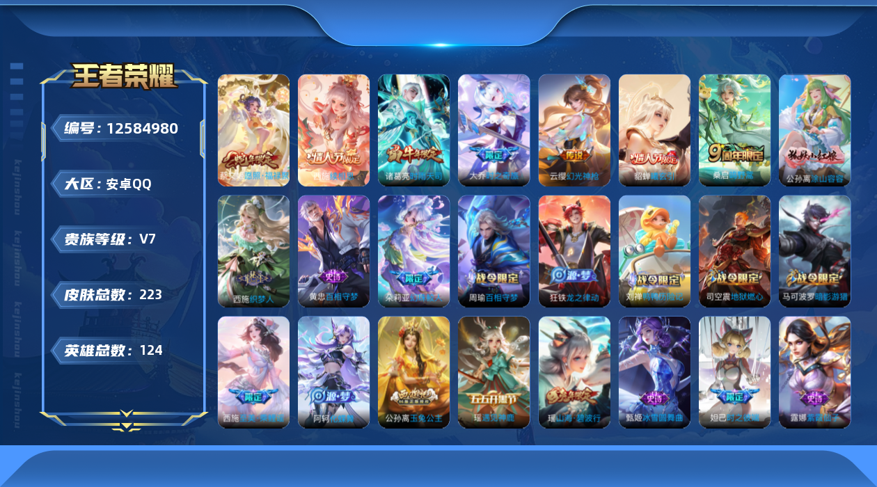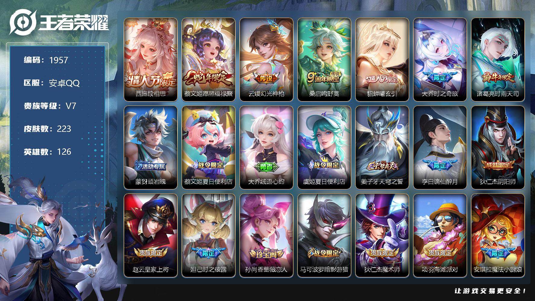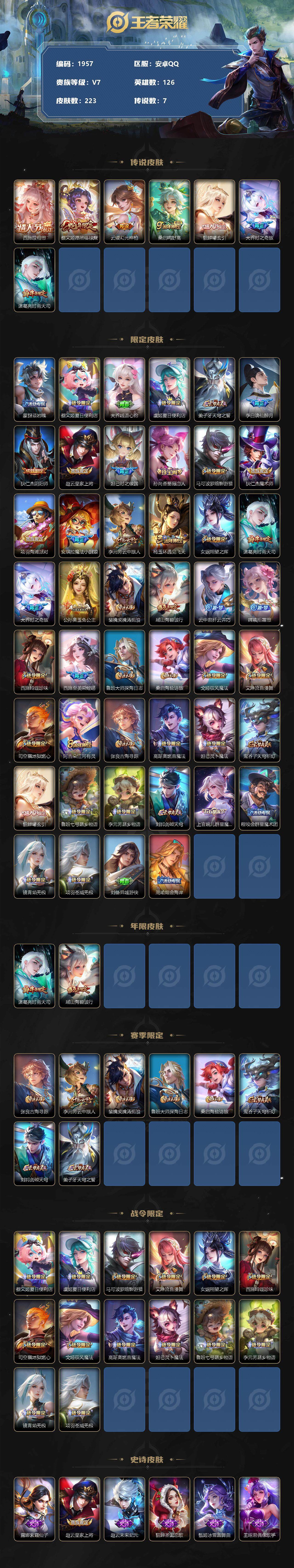 [12584980]安卓Q-V7-最强王者段位-126英雄-223皮肤-0典藏-0珍品无双-0无双-0珍品传说-7传说-64史诗