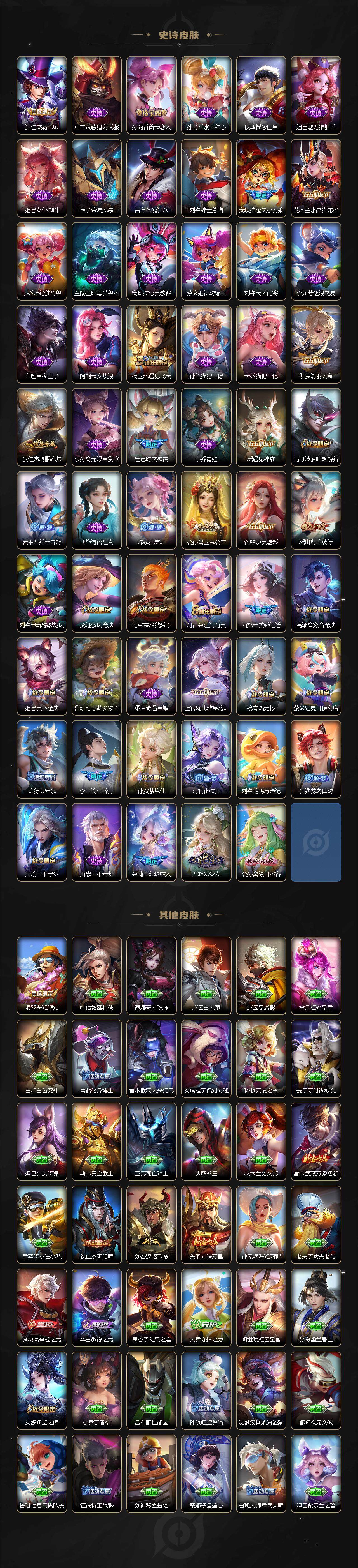 【史诗皮肤】:露娜紫霞仙子,赵云皇家上将,赵云未来纪元,貂蝉圣诞恋歌,甄姬冰雪圆舞曲,王昭君偶像歌手,狄仁杰魔术师,宫本武藏鬼剑武藏,孙尚香蔷薇恋人,孙尚香水果甜心,嬴政摇滚巨星,妲己魅力维加斯,妲己女仆咖啡,墨子金属风暴,吕布圣诞狂欢,刘禅绅士熊喵,安琪拉魔法小厨娘,花木兰水晶猎龙者,小乔缤纷独角兽,兰陵王暗隐猎兽者,安琪拉心灵骇客,蔡文姬舞动绿茵,刘禅天才门将,李元芳逐浪之夏,白起星夜王子,阿轲节奏热浪,杨玉环遇见飞天,孙策猫狗日记,大乔猫狗日记,伽罗箭羽风息,狄仁杰鹰眼统帅,公孙离无限星赏官,妲己时之彼端,小乔青蛇,瑶遇见神鹿,马可波罗暗影游猎,云中君纤云弄巧,西施诗语江南,嫦娥拒霜思,公孙离玉兔公主